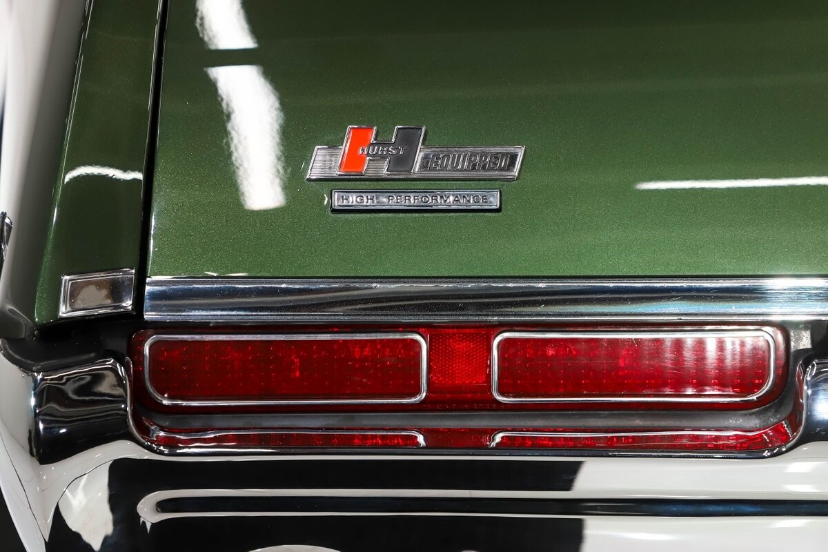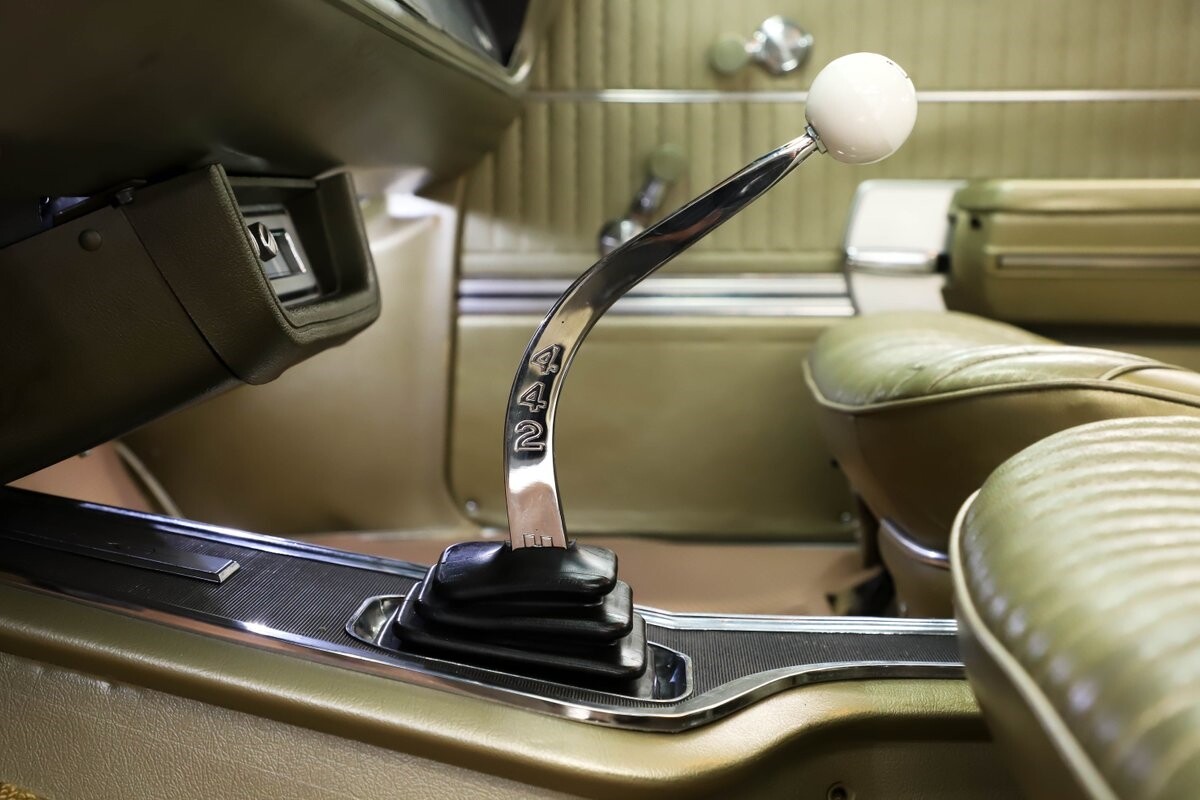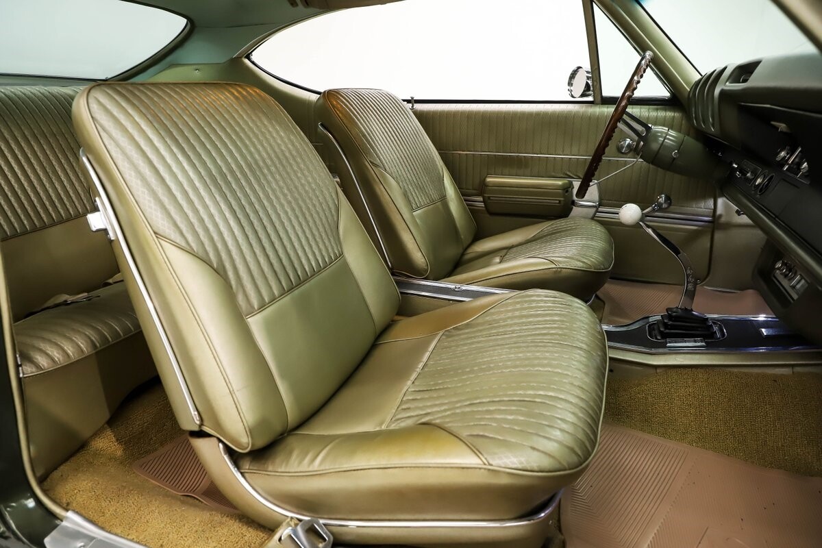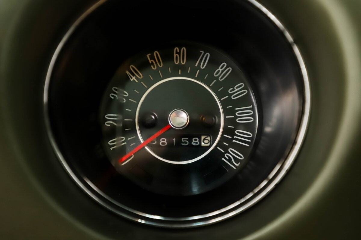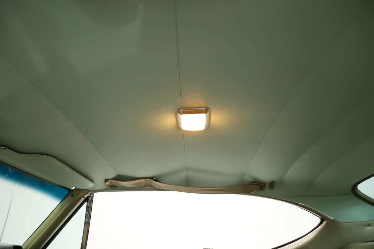 EXTERIOR: What a slick looking car! It has been professionally repainted its factory original Jade Green metallic color with optional white stripes flanking each fender. It was then sanded and polished to a smooth and reflective finish. The vinyl top was replaced. All the panels are properly aligned with good gaps all the way around. The doors close easily like a new car. The mostly original trim still has a lustrous shine to it. The front and rear bumpers have been rechromed. The grille, headlight bezels, and taillights are original and in great shape. All the glass is original except the windshield. Beautiful 14 inch chrome SS1 rims are wrapped in reproduction Firestone Redline tires that are actually radials!