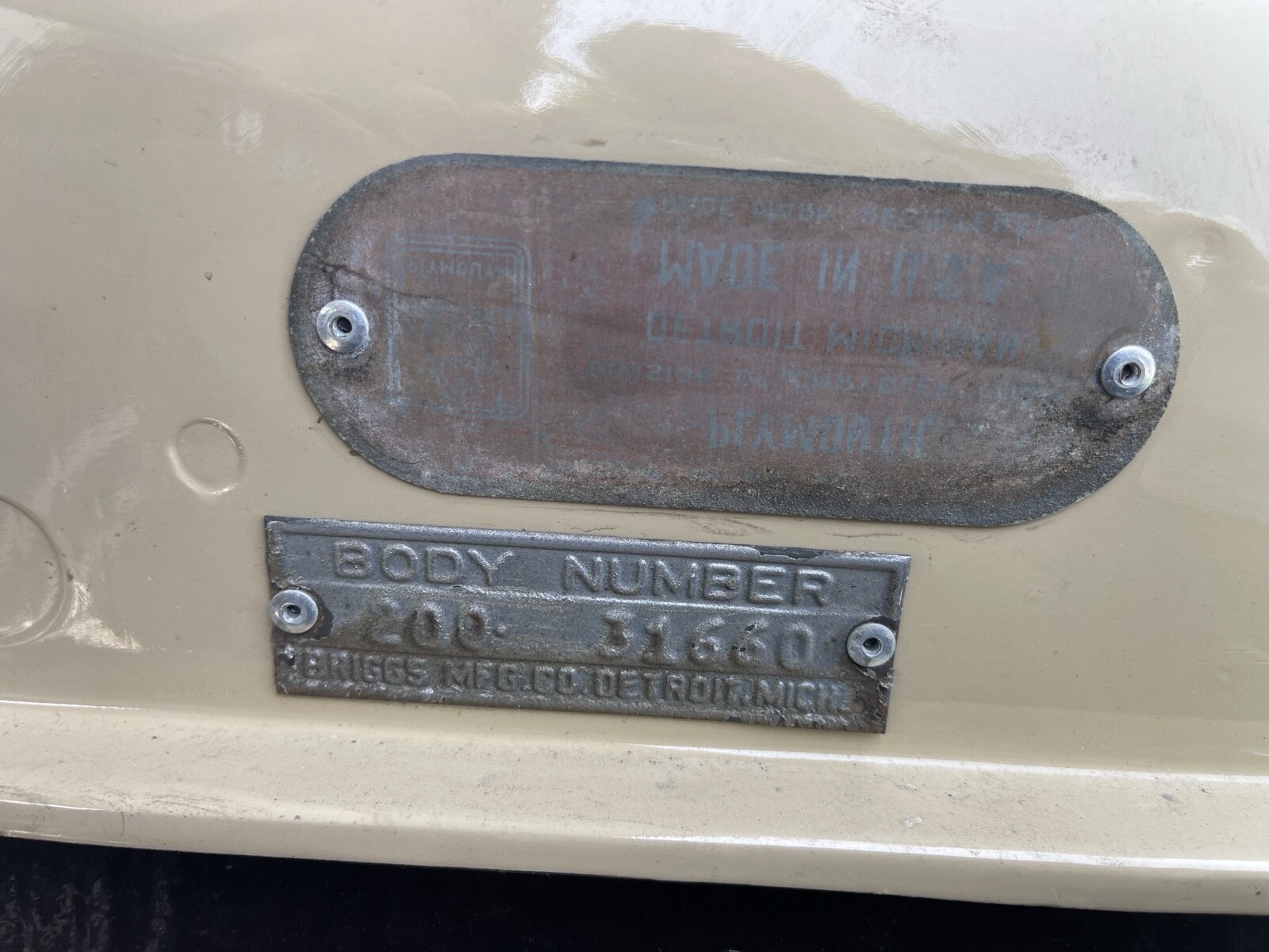 1940 Plymouth P10 Deluxe was purchased in 2004 and went through complete restoration which was finished in 2010. The car is finished in two-tone with brown over tan. Interior is tan cloth upholstery in excellent condition. Power comes from an inline 6 cylinder engine with a three speed column shifted manual transmission. Features include chrome bumpers, AM radio, running boards, heater and four door "suicide" doors. Electrical system is 6volt. Included in the sale is shop manual, electrical diagram, car cover, car show awards.