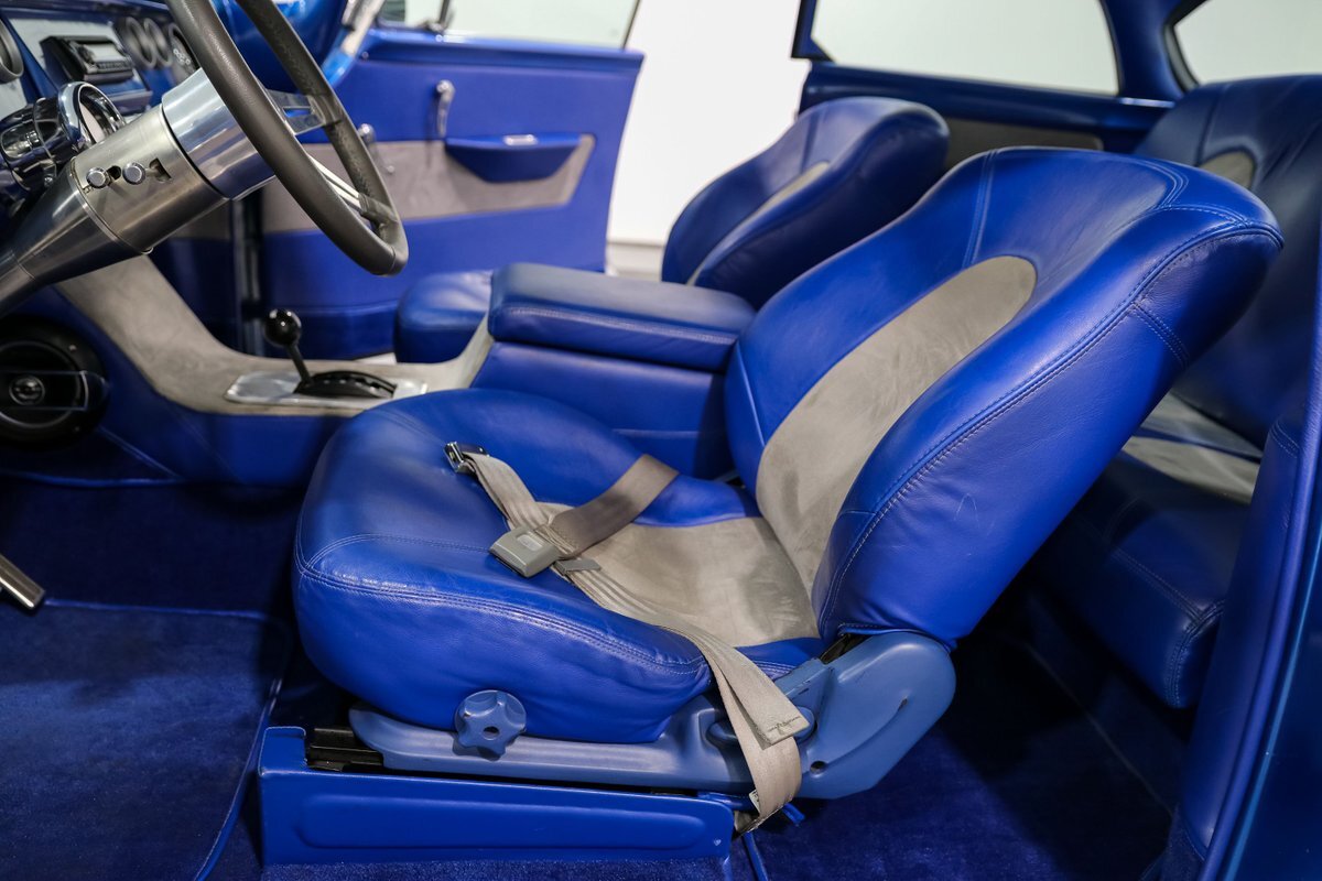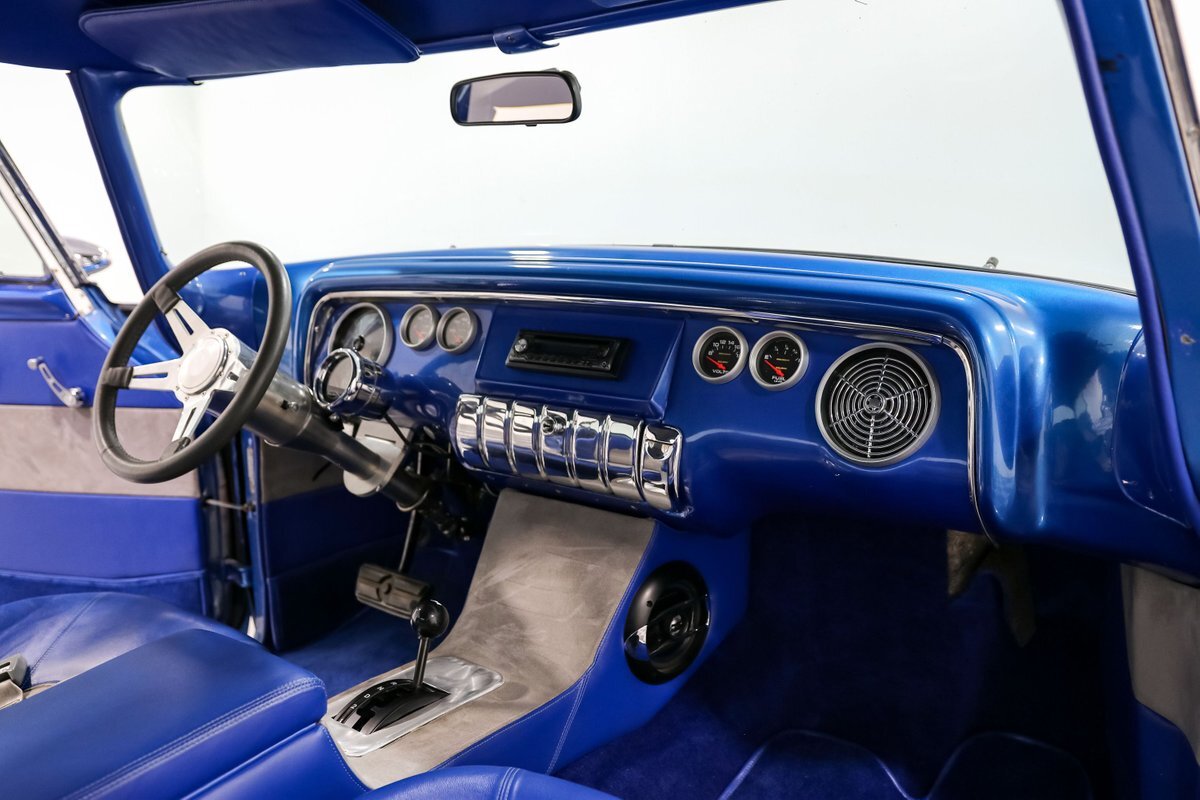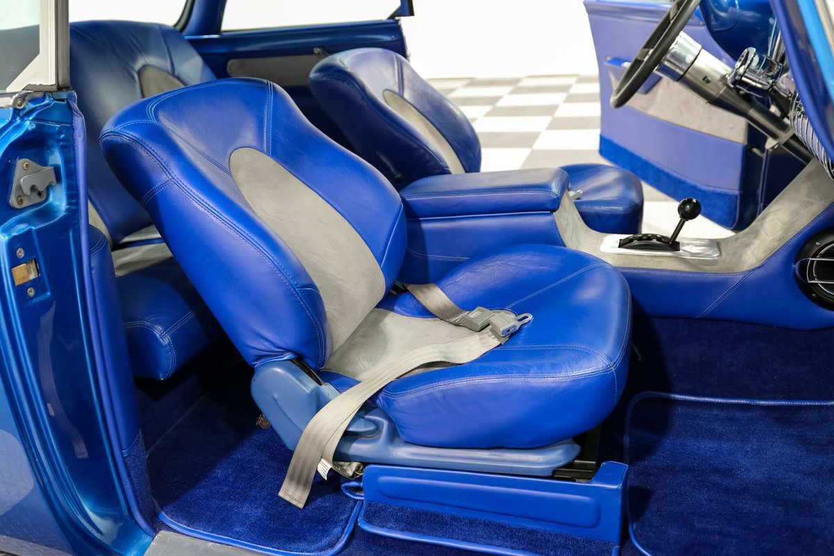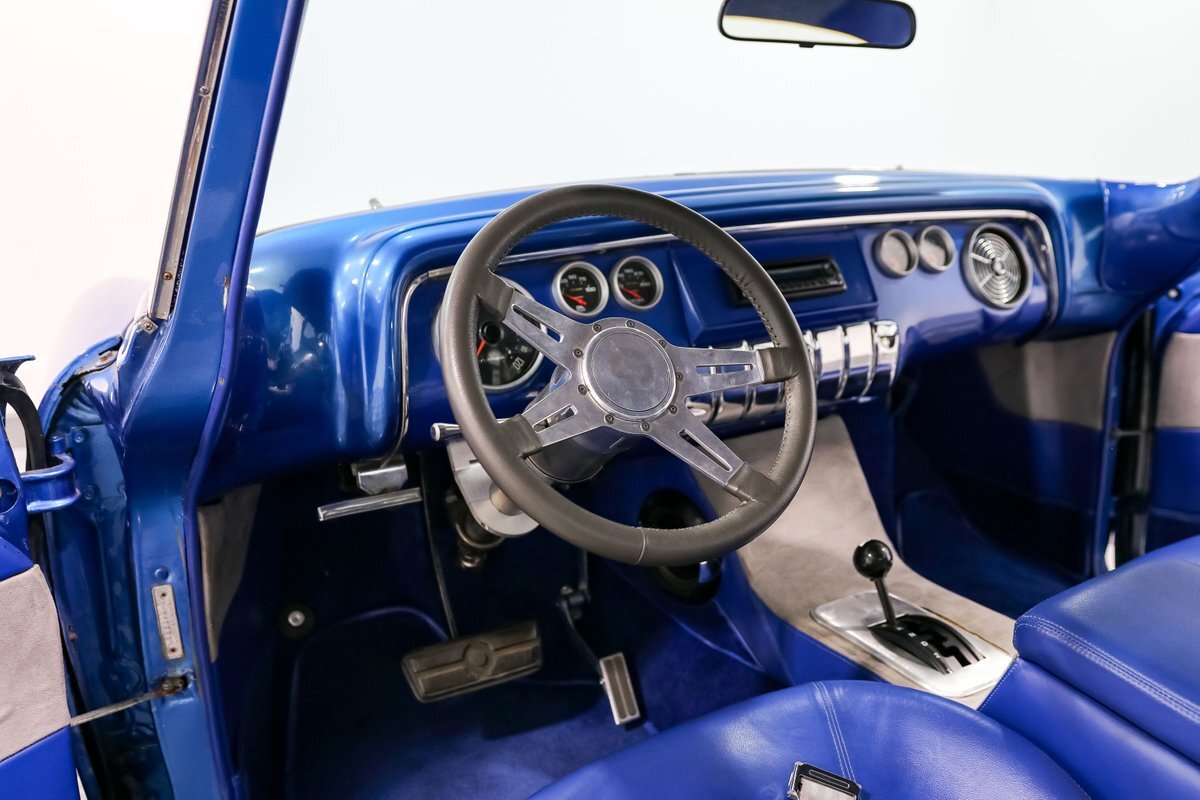 Inside, the custom Blue interior offers a perfect blend of vintage style and modern comfort. The bucket seats with a center console, leather-wrapped billet steering wheel, and stainless steel tilt column create a driver-focused environment. Autometer Pro Comp gauges keep you informed, while the aftermarket radio adds a touch of modern convenience. The custom trunk enclosure houses an aluminum fuel cell, completing the blend of form and function.