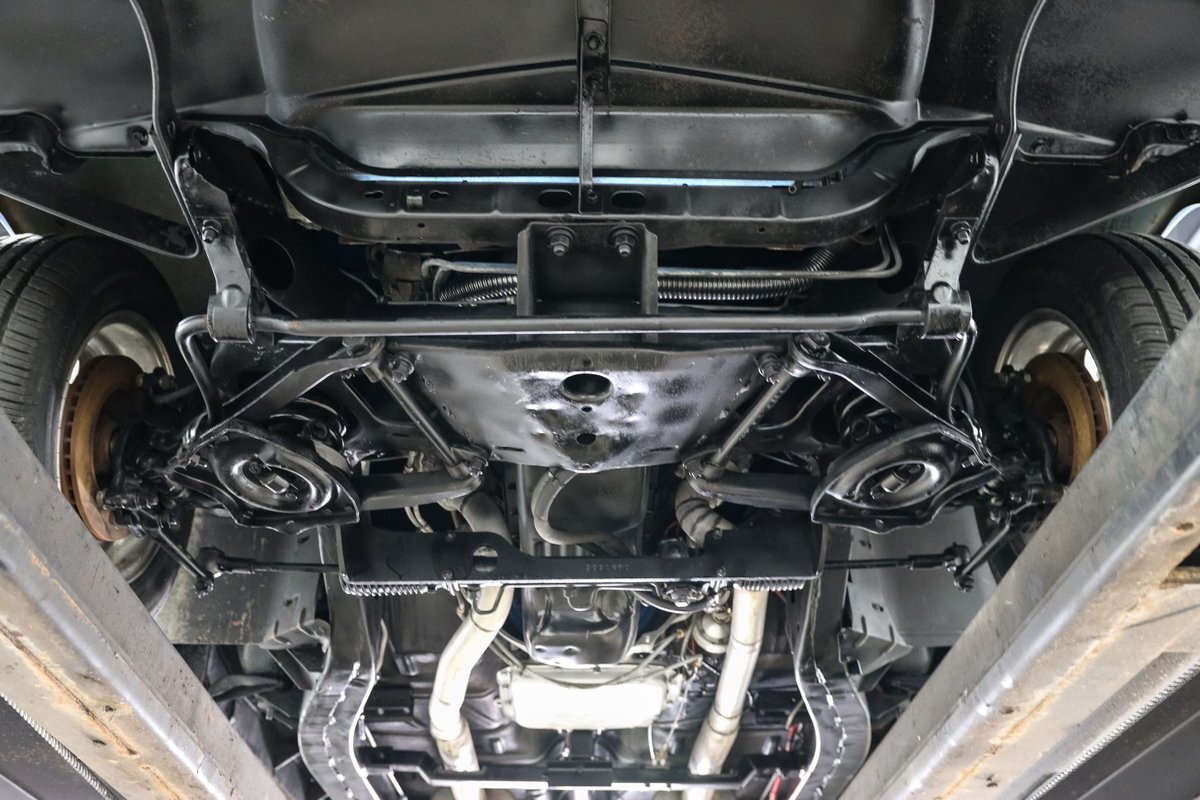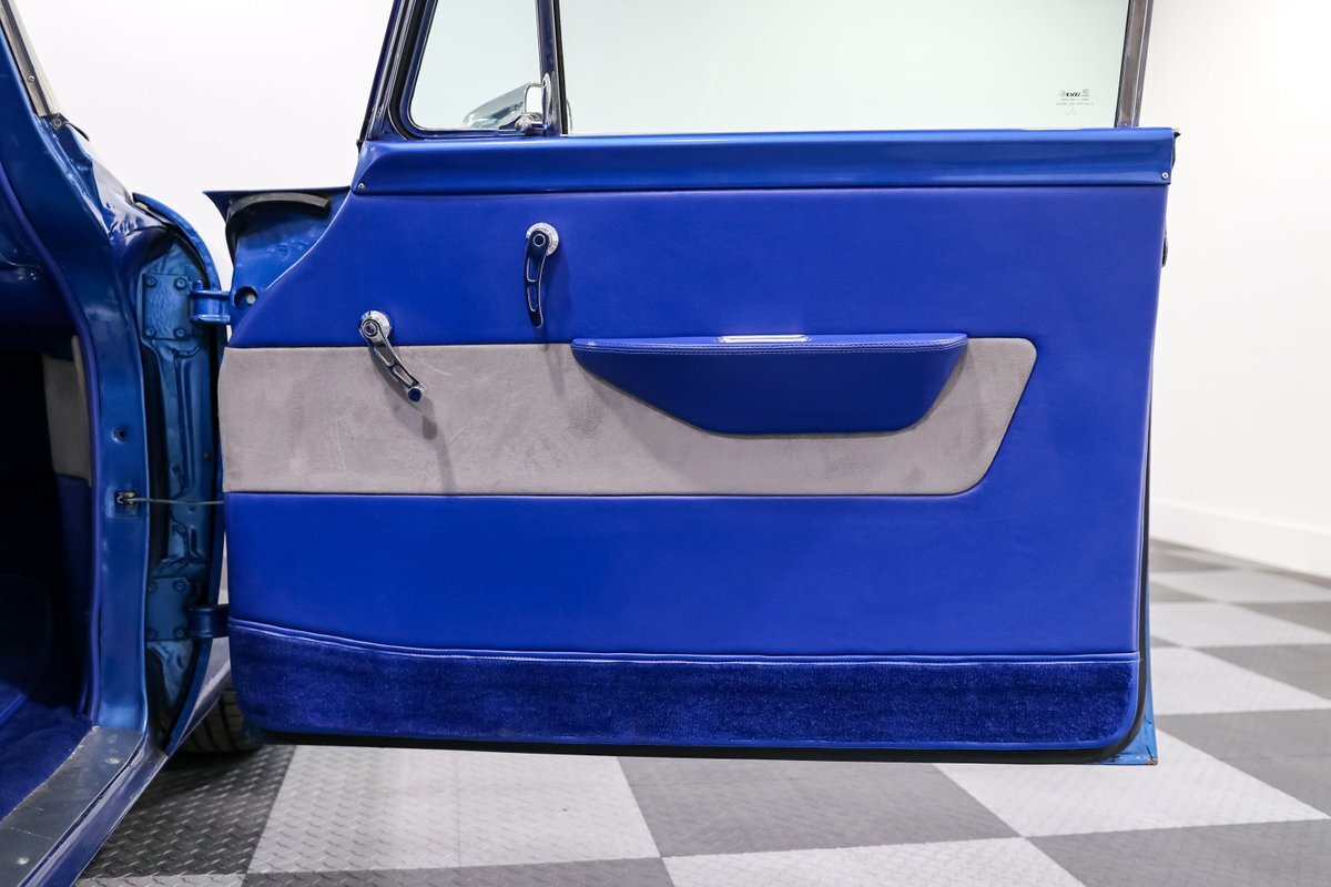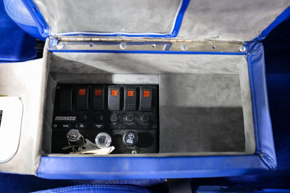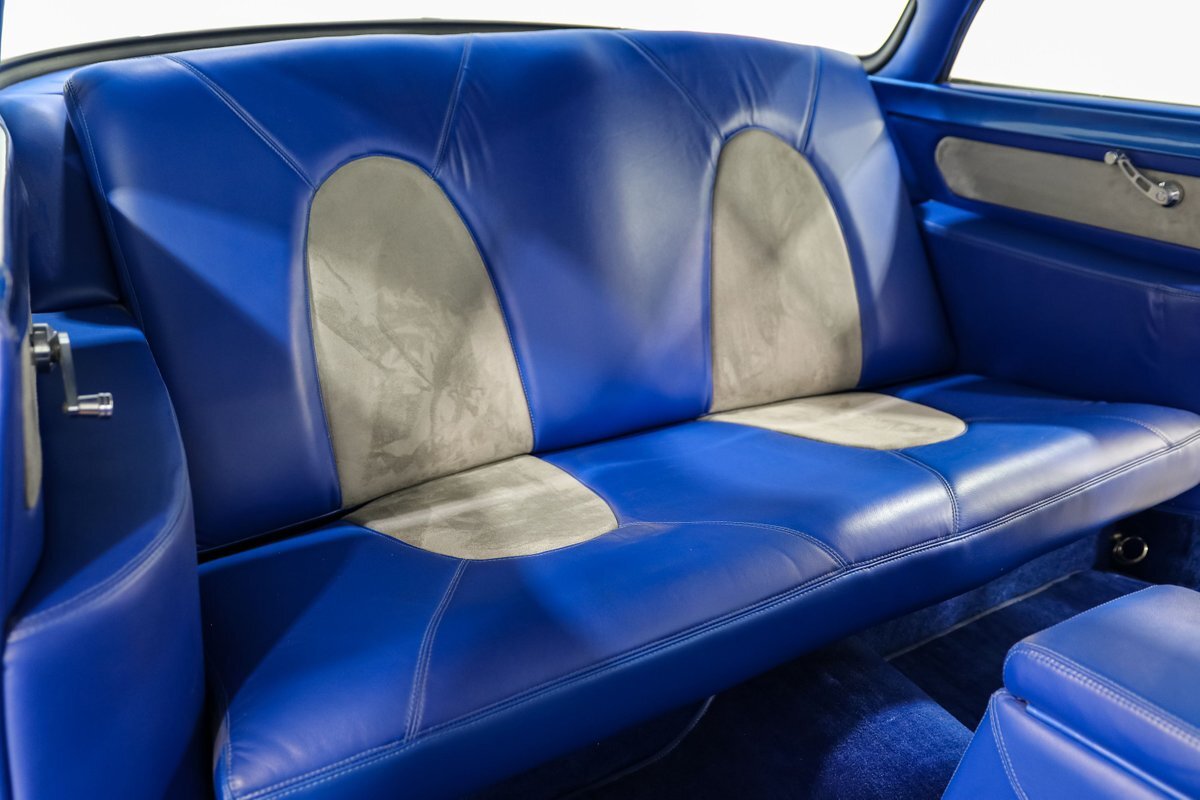 Inside, the custom Blue interior offers a perfect blend of vintage style and modern comfort. The bucket seats with a center console, leather-wrapped billet steering wheel, and stainless steel tilt column create a driver-focused environment. Autometer Pro Comp gauges keep you informed, while the aftermarket radio adds a touch of modern convenience. The custom trunk enclosure houses an aluminum fuel cell, completing the blend of form and function.