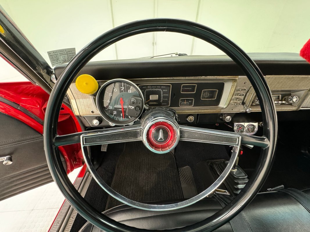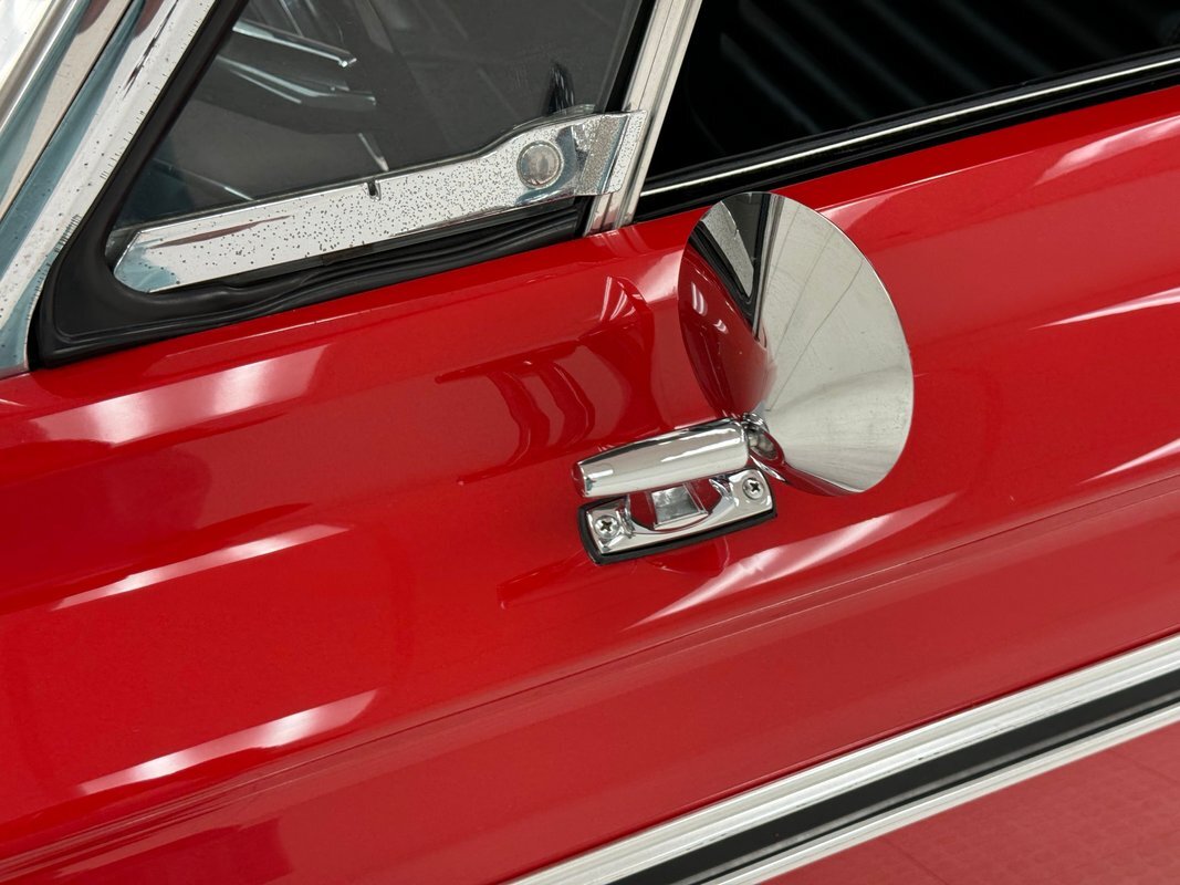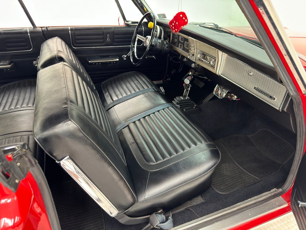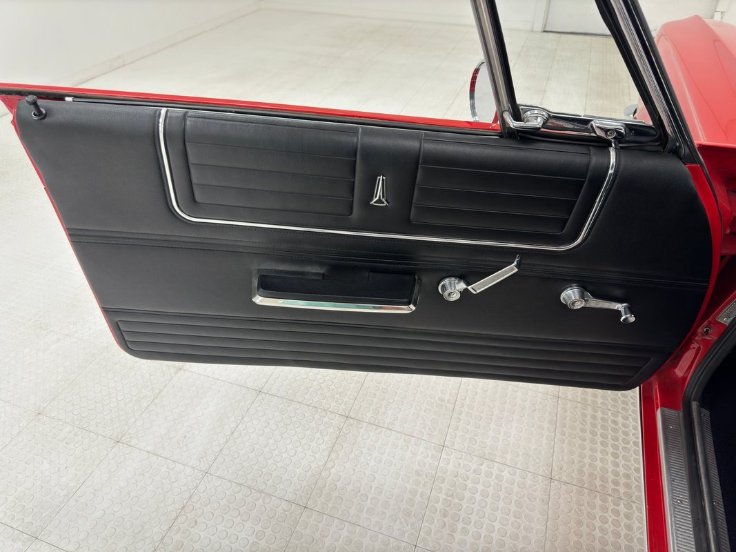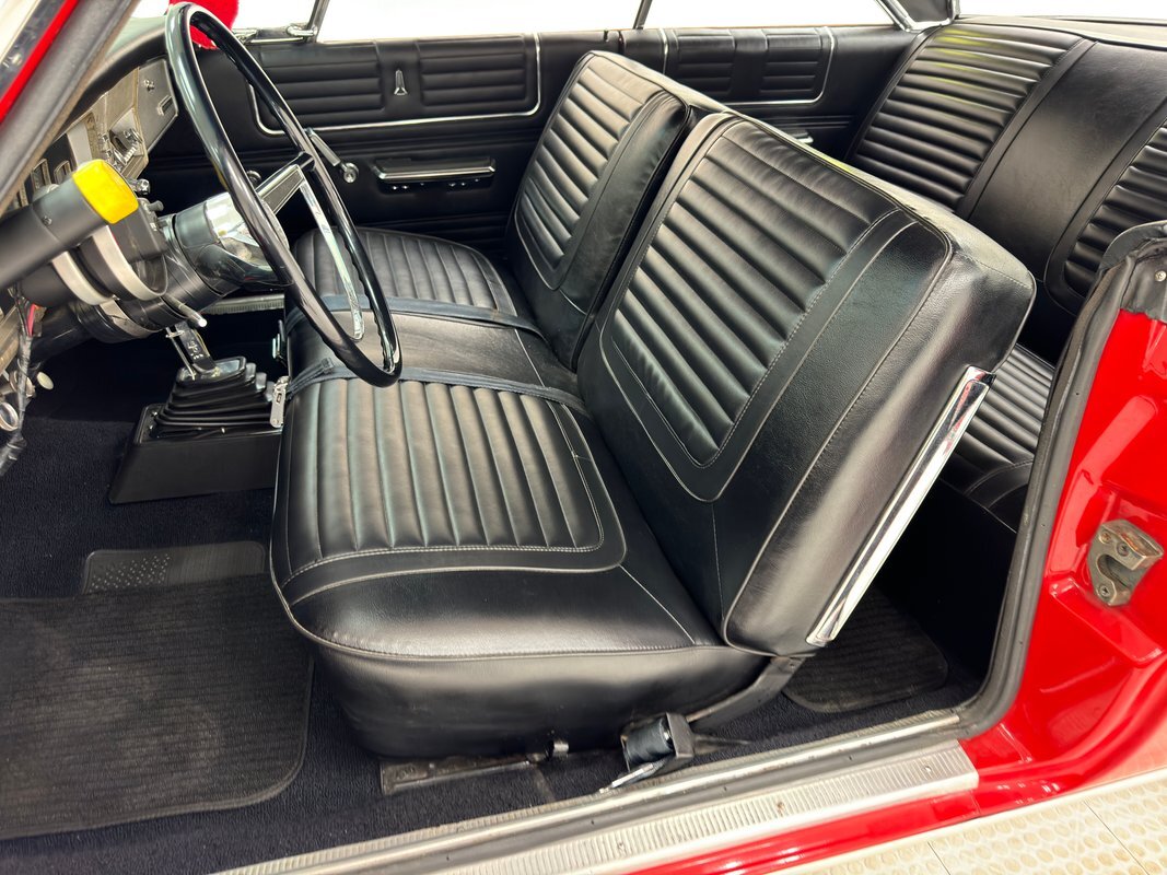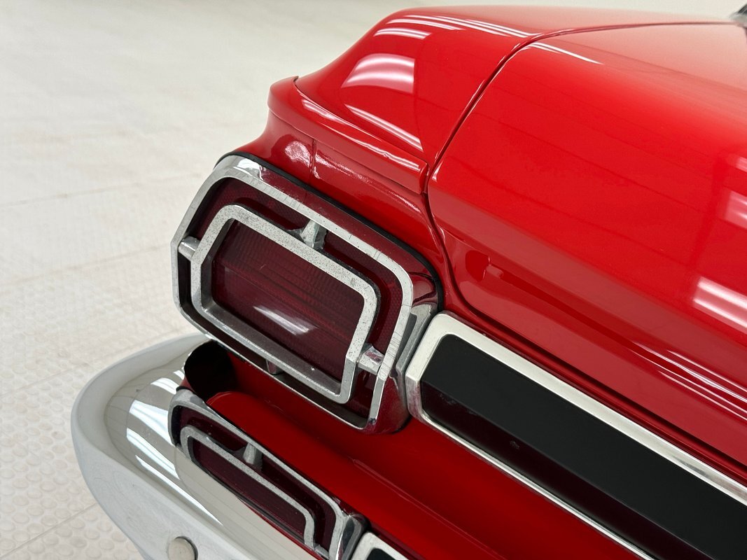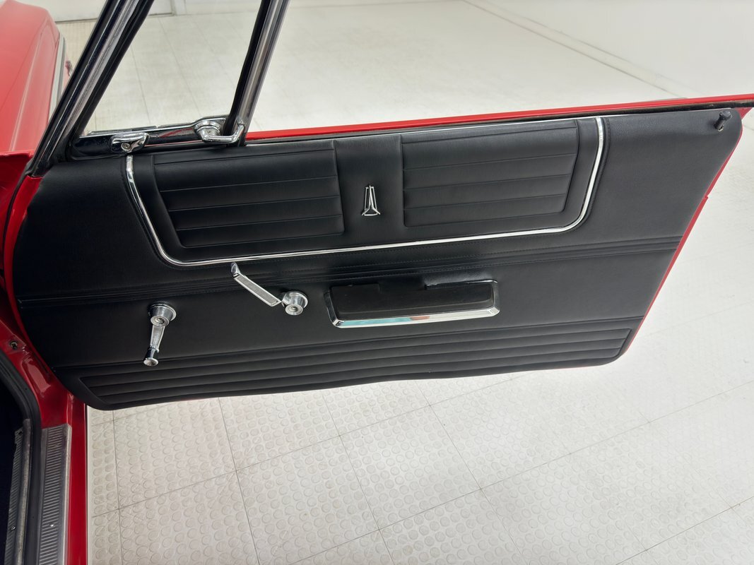 This car wears a two stage coat of Bright Red intersected by a metal trimmed black spear that runs the length of the car on a car that displays a mix of varying angles in its profile. The nose leans forward while the windshield leans back and takes the vent and side windows with it. The C-pillar is vee shaped and leans forward while the curved rear window follows its line, leading to a flat trunk and a rear leaning tail. A wonderfully simple front end has the grid of the grille mirrored in the headlight surround and the more elaborate tail has square taillights and black bar that bridges them. 15-inch American Racing Torque Thrust wheels have staggered size tires that provide a muscular look and outsize what the car came with in 1965 by a wide margin. The paint, brightwork, emblems, and panel gaps are all in excellent condition.
