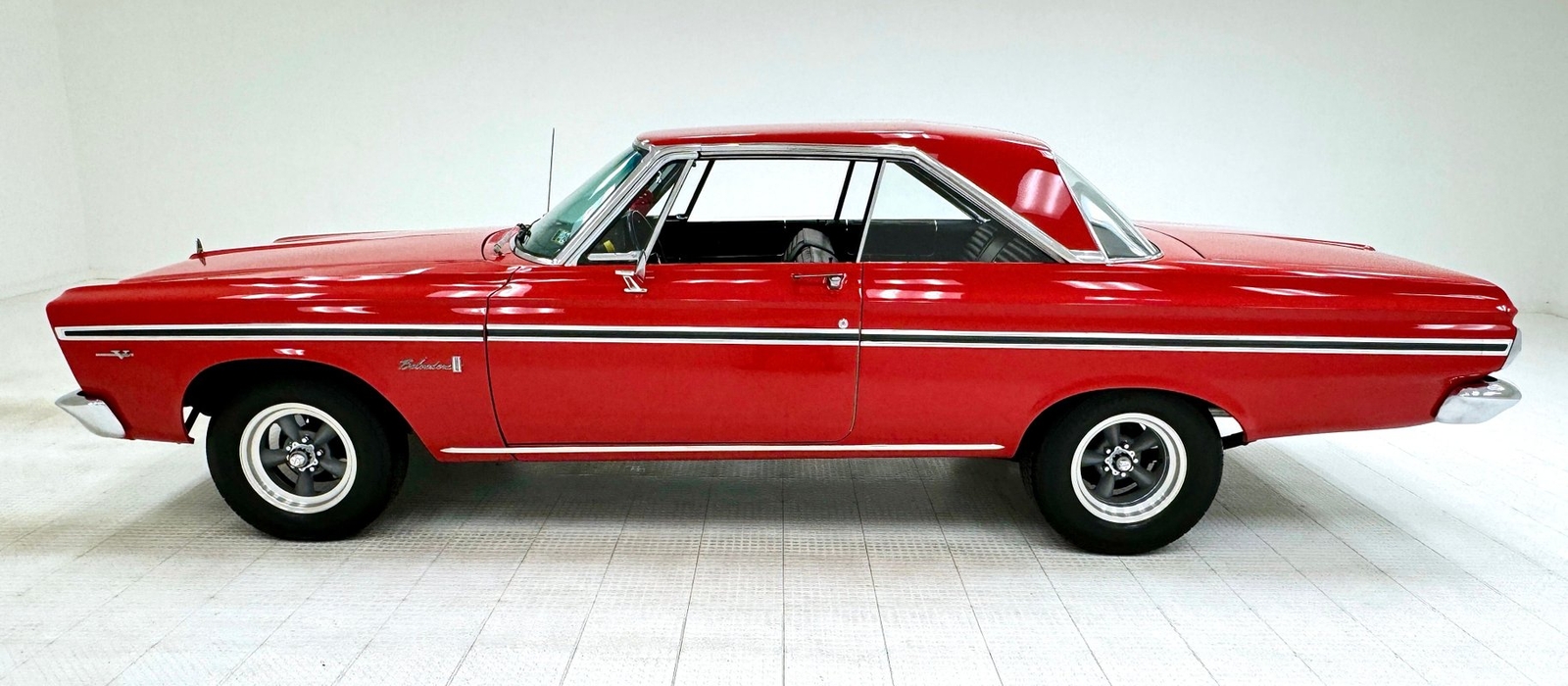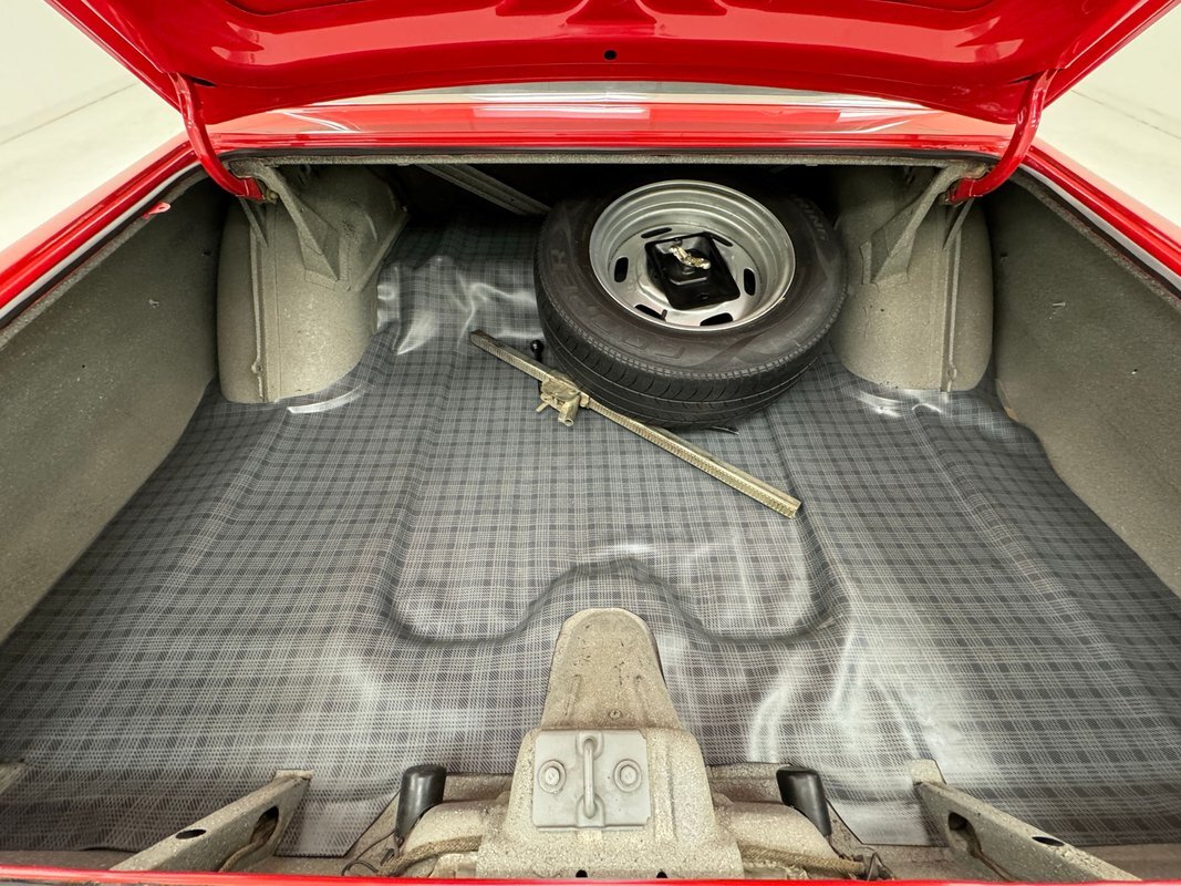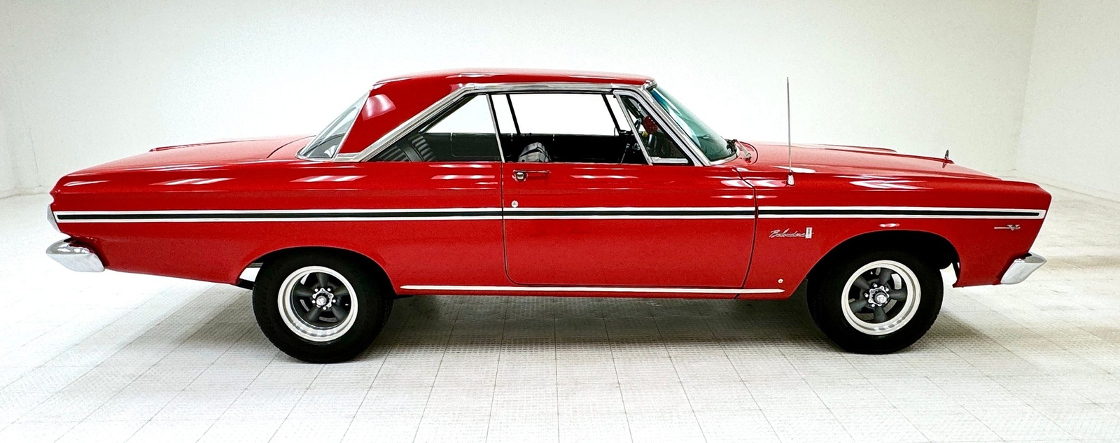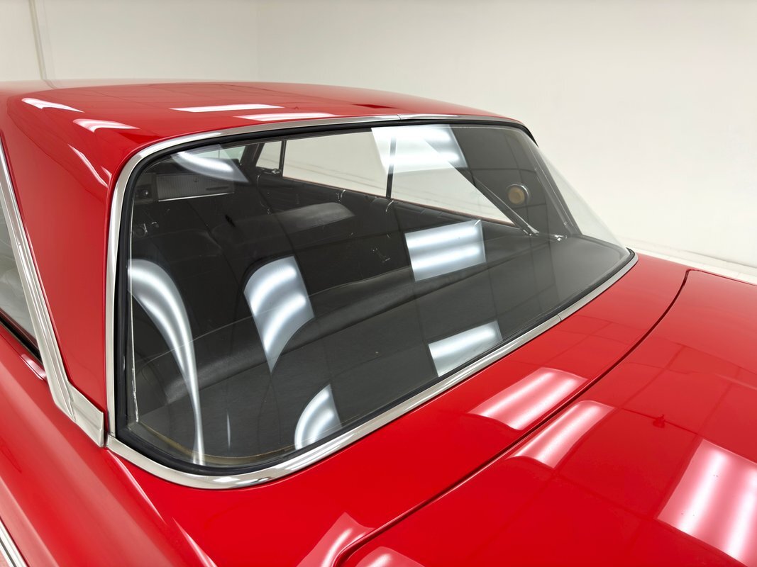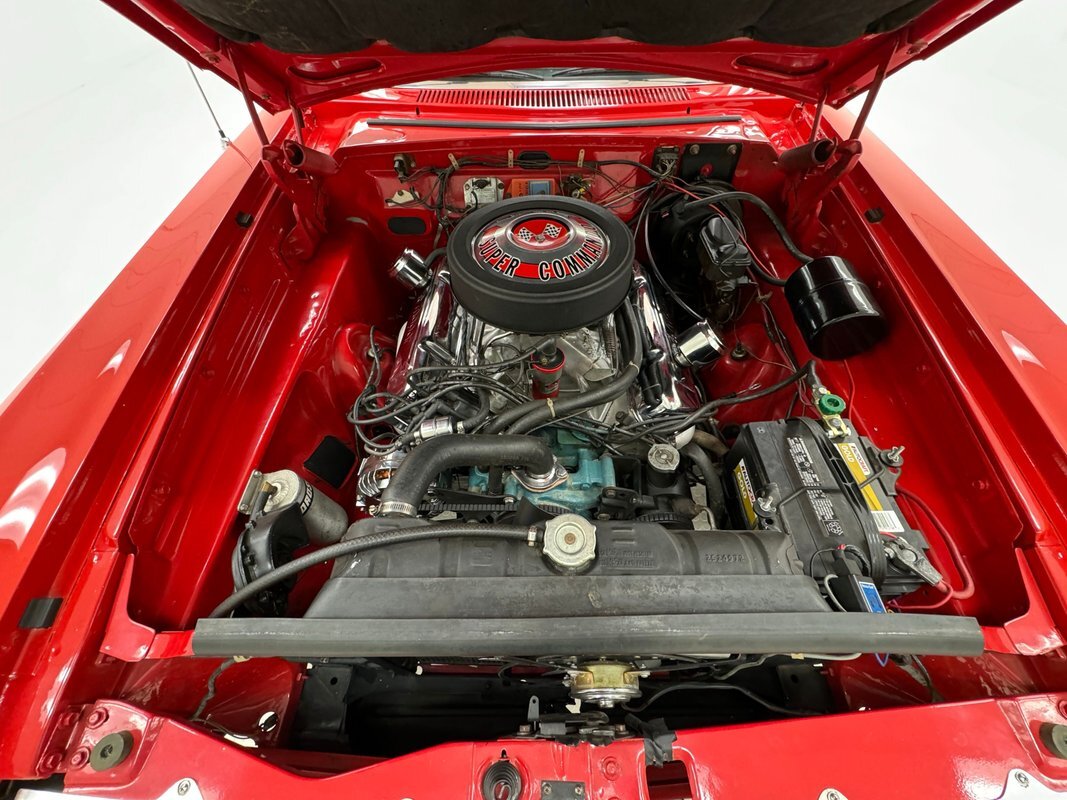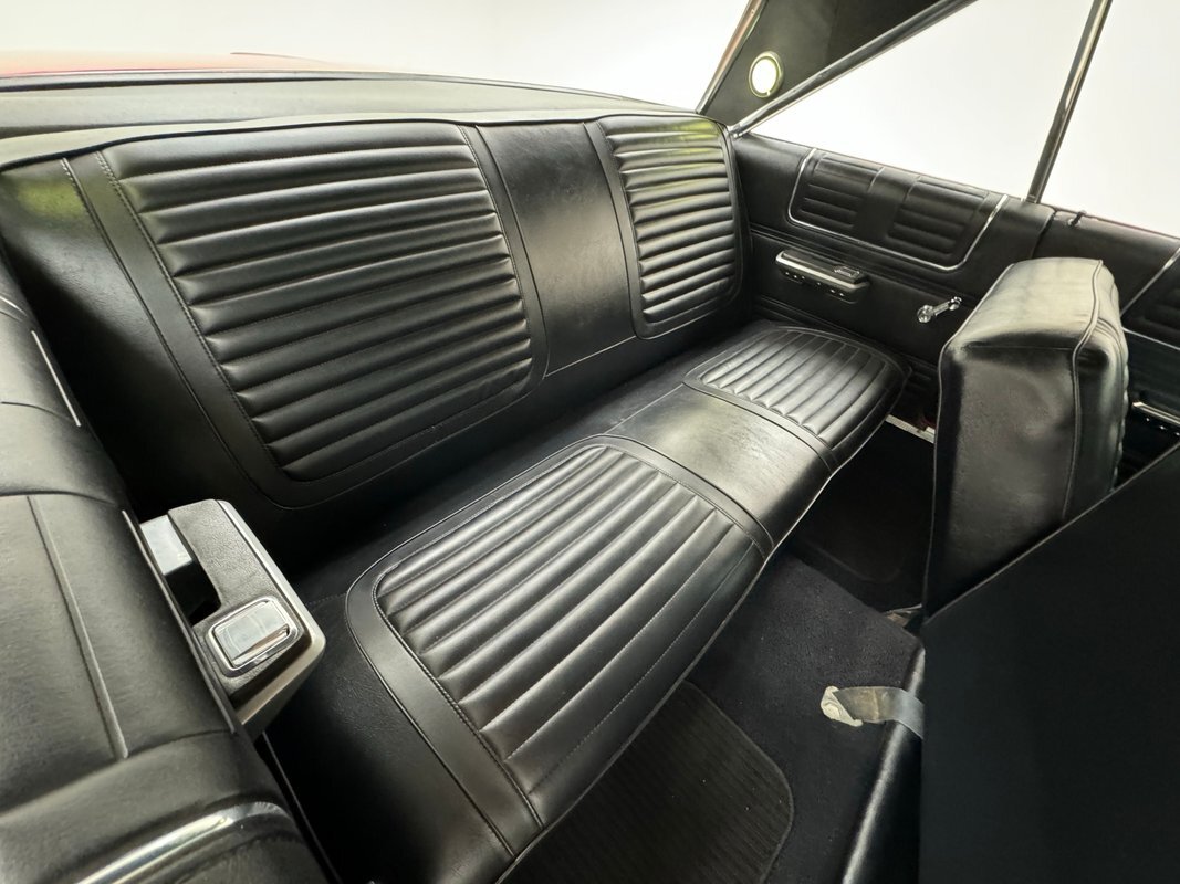 This car wears a two stage coat of Bright Red intersected by a metal trimmed black spear that runs the length of the car on a car that displays a mix of varying angles in its profile. The nose leans forward while the windshield leans back and takes the vent and side windows with it. The C-pillar is vee shaped and leans forward while the curved rear window follows its line, leading to a flat trunk and a rear leaning tail. A wonderfully simple front end has the grid of the grille mirrored in the headlight surround and the more elaborate tail has square taillights and black bar that bridges them. 15-inch American Racing Torque Thrust wheels have staggered size tires that provide a muscular look and outsize what the car came with in 1965 by a wide margin. The paint, brightwork, emblems, and panel gaps are all in excellent condition.