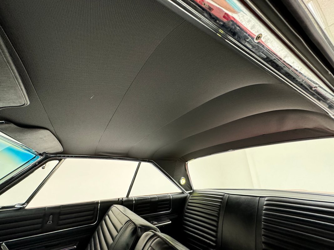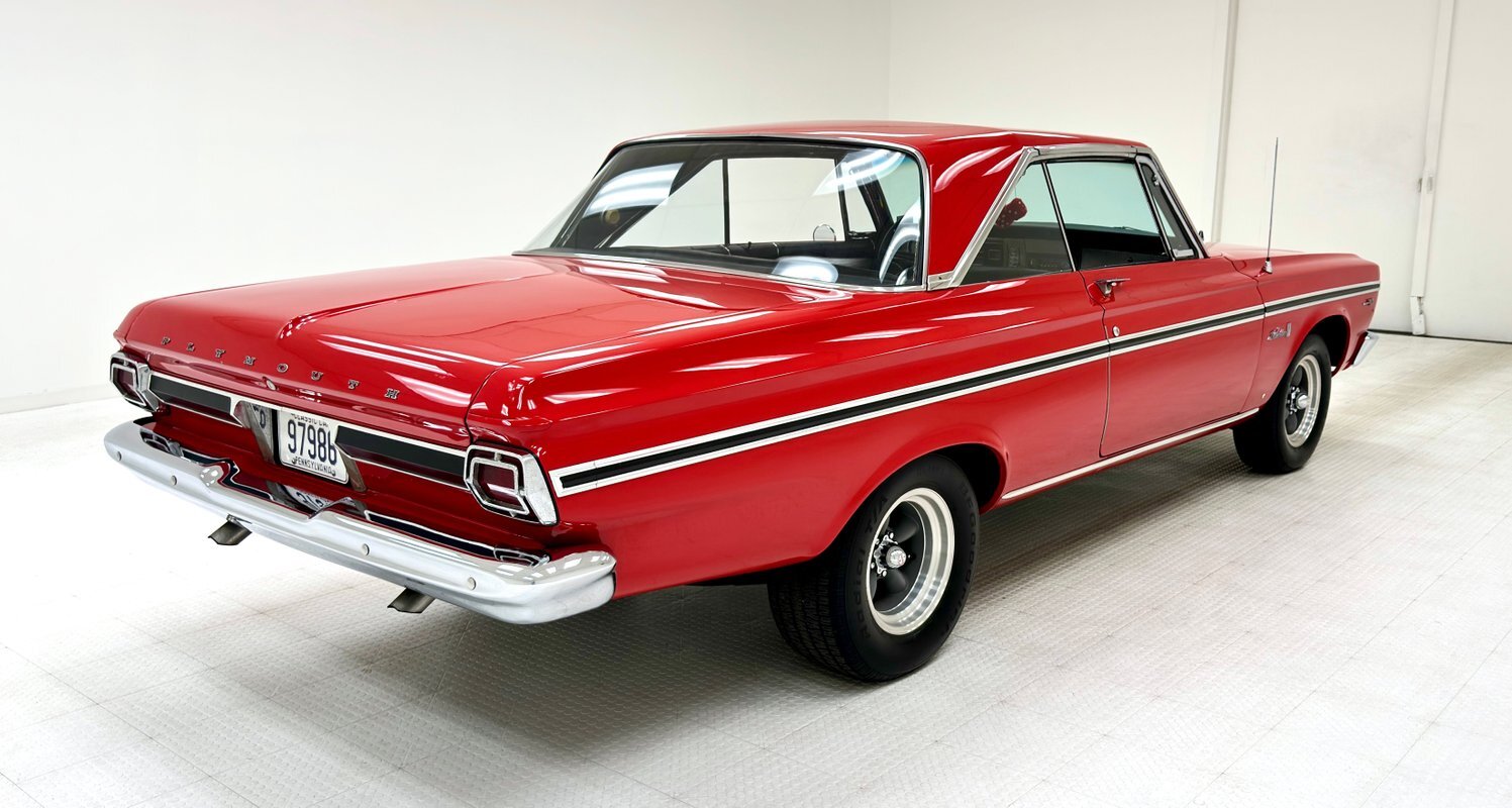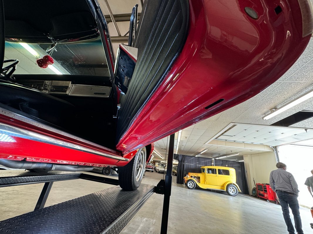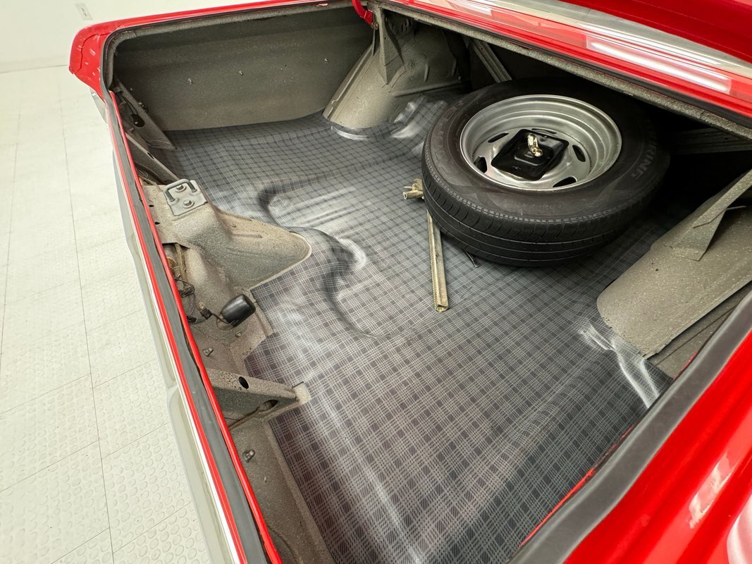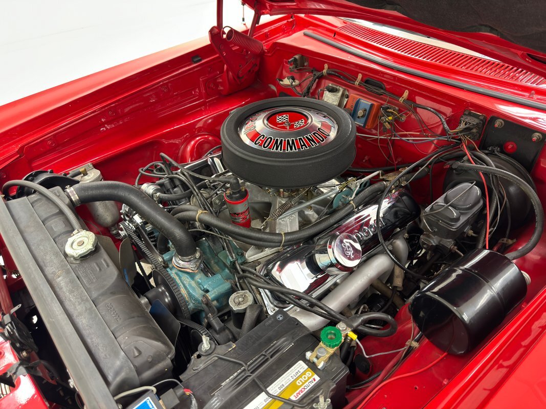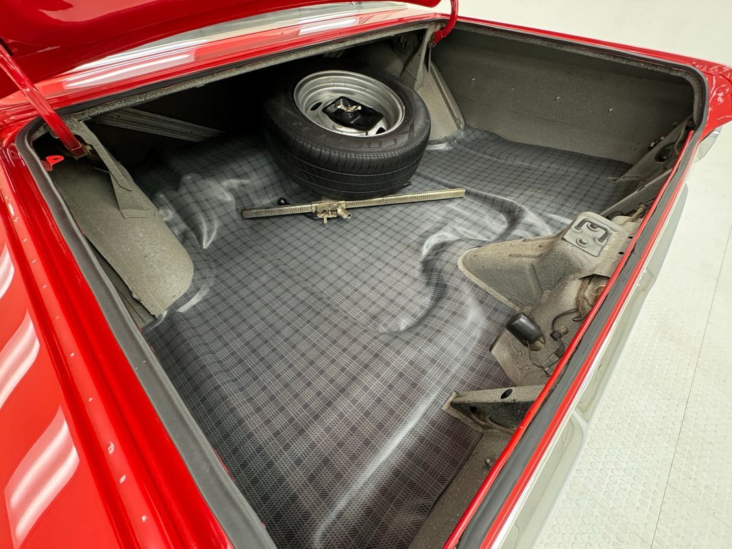 This car wears a two stage coat of Bright Red intersected by a metal trimmed black spear that runs the length of the car on a car that displays a mix of varying angles in its profile. The nose leans forward while the windshield leans back and takes the vent and side windows with it. The C-pillar is vee shaped and leans forward while the curved rear window follows its line, leading to a flat trunk and a rear leaning tail. A wonderfully simple front end has the grid of the grille mirrored in the headlight surround and the more elaborate tail has square taillights and black bar that bridges them. 15-inch American Racing Torque Thrust wheels have staggered size tires that provide a muscular look and outsize what the car came with in 1965 by a wide margin. The paint, brightwork, emblems, and panel gaps are all in excellent condition.