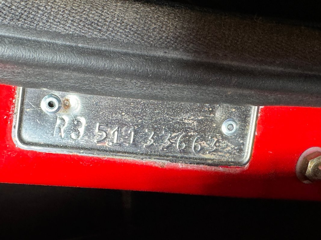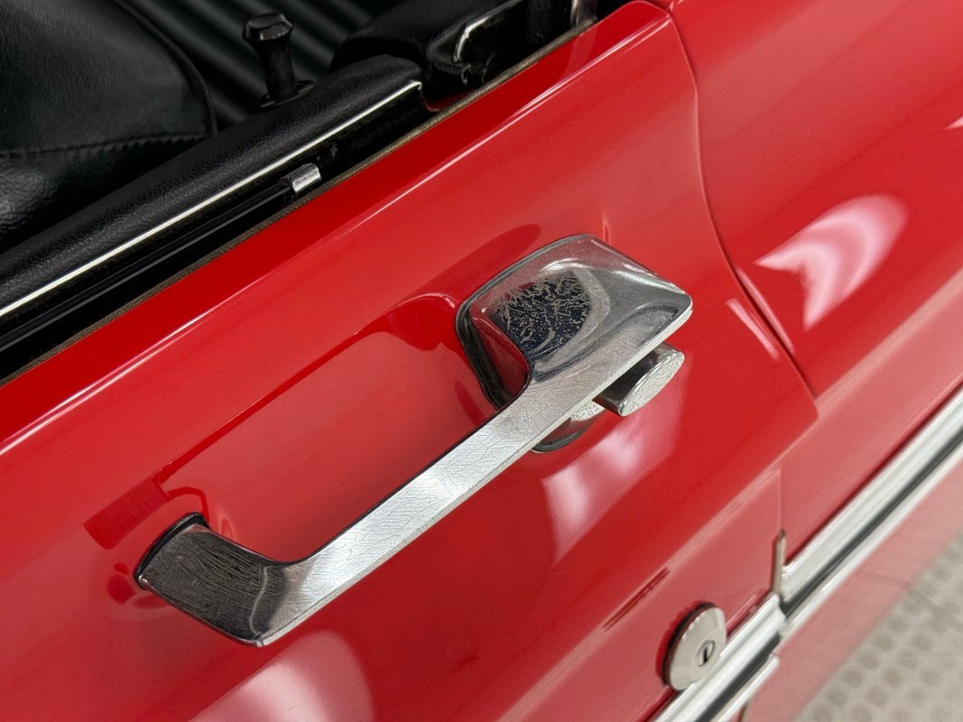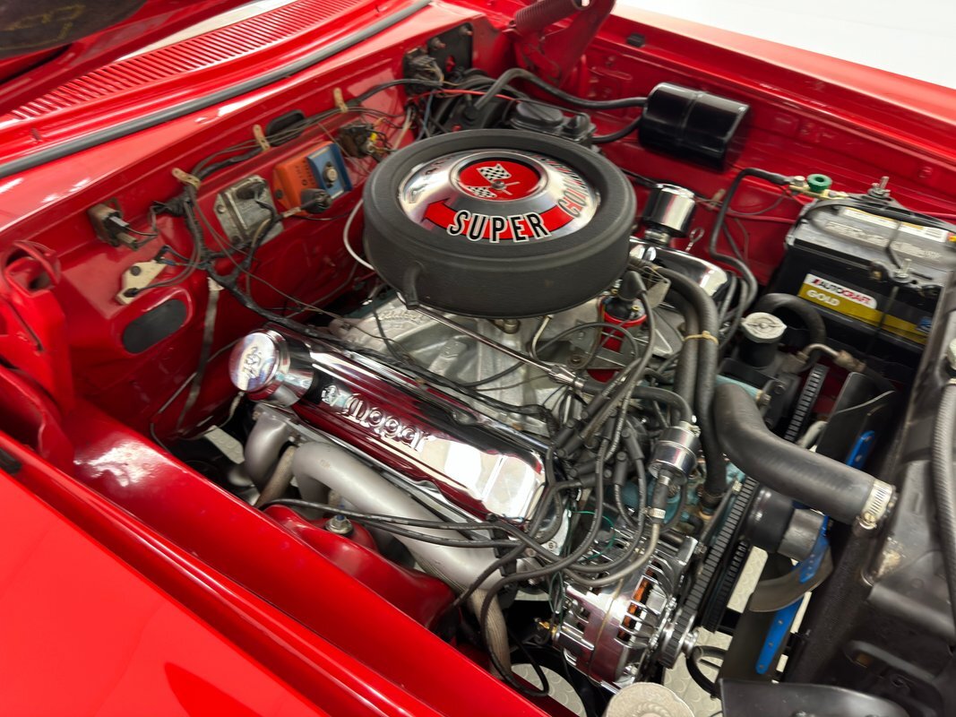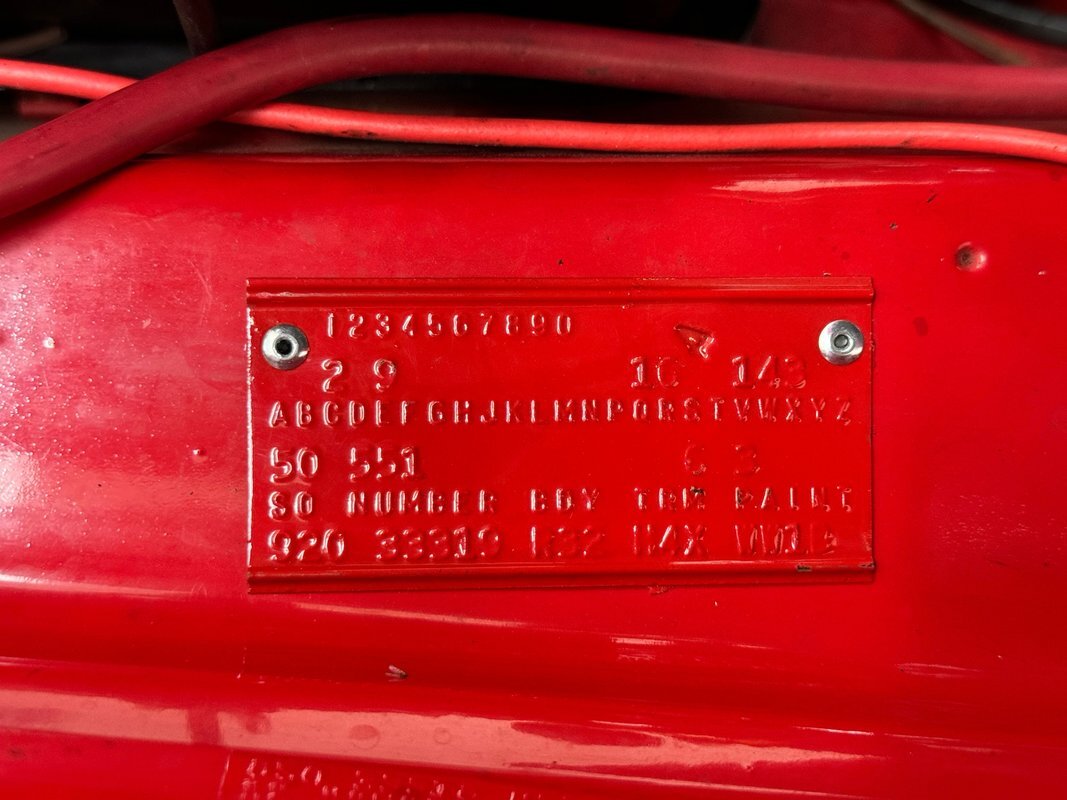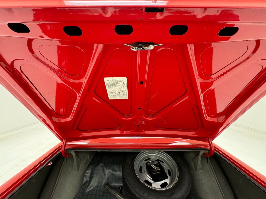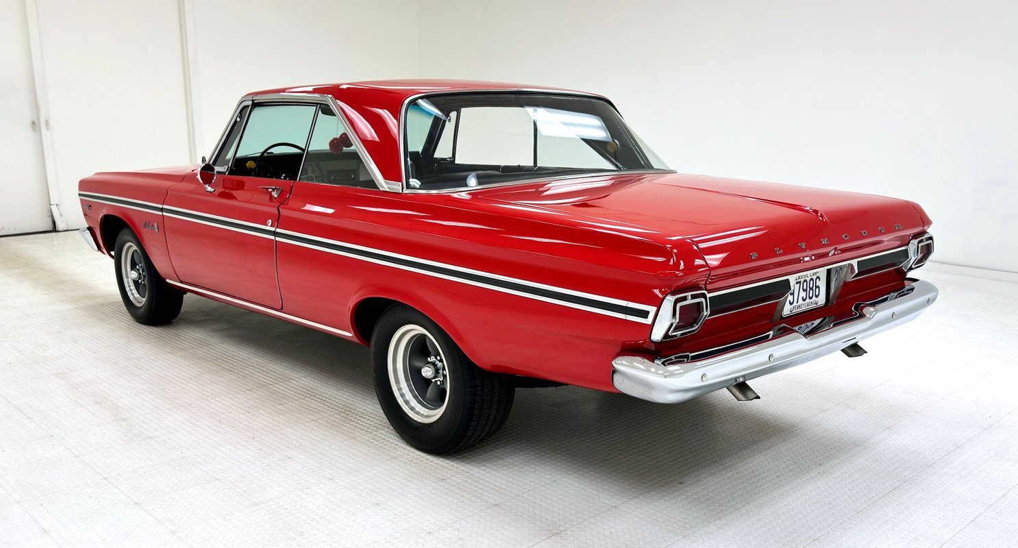 This car wears a two stage coat of Bright Red intersected by a metal trimmed black spear that runs the length of the car on a car that displays a mix of varying angles in its profile. The nose leans forward while the windshield leans back and takes the vent and side windows with it. The C-pillar is vee shaped and leans forward while the curved rear window follows its line, leading to a flat trunk and a rear leaning tail. A wonderfully simple front end has the grid of the grille mirrored in the headlight surround and the more elaborate tail has square taillights and black bar that bridges them. 15-inch American Racing Torque Thrust wheels have staggered size tires that provide a muscular look and outsize what the car came with in 1965 by a wide margin. The paint, brightwork, emblems, and panel gaps are all in excellent condition.