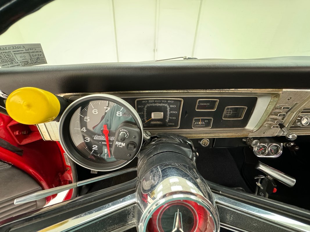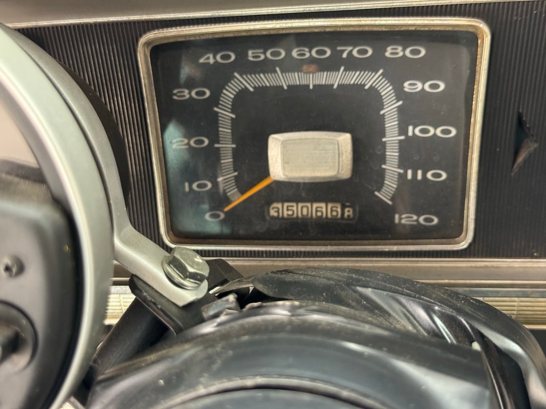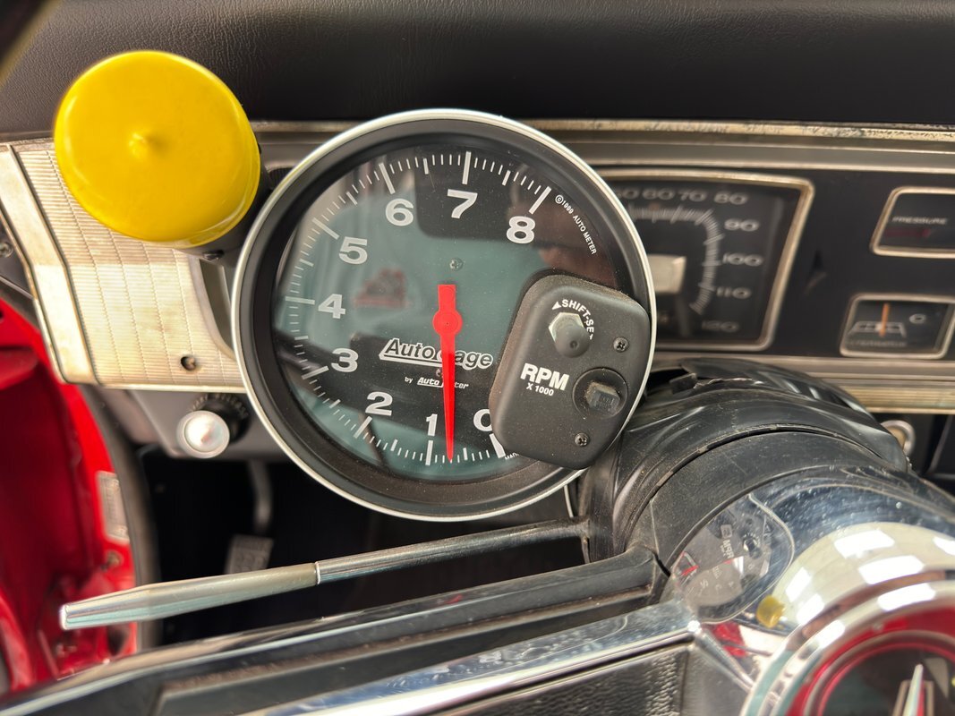 Mixed patterns and texture occupy the black vinyl door cards which are in great shape and lead to thick split bench seat, also in black vinyl and also in great condition. The rear bench seat and the sidewalls are in near mint condition and include the obligatory ash trays because this was 1965 after all. The stock appearing steering wheel shares its narrow column with a big tachometer with yellow shift light while the 120 speedometer on the dashboard and other gauges are square in design, fitting for the period and make. A center AM radio is in place followed by an aluminum glove box and an aftermarket gauge pod underneath. A B&M shifter is floor mounted over black loop carpet, all looking clean. The stitched headliner is in good condition as well along with the trunk which is clean and covered by the period plaid mat.