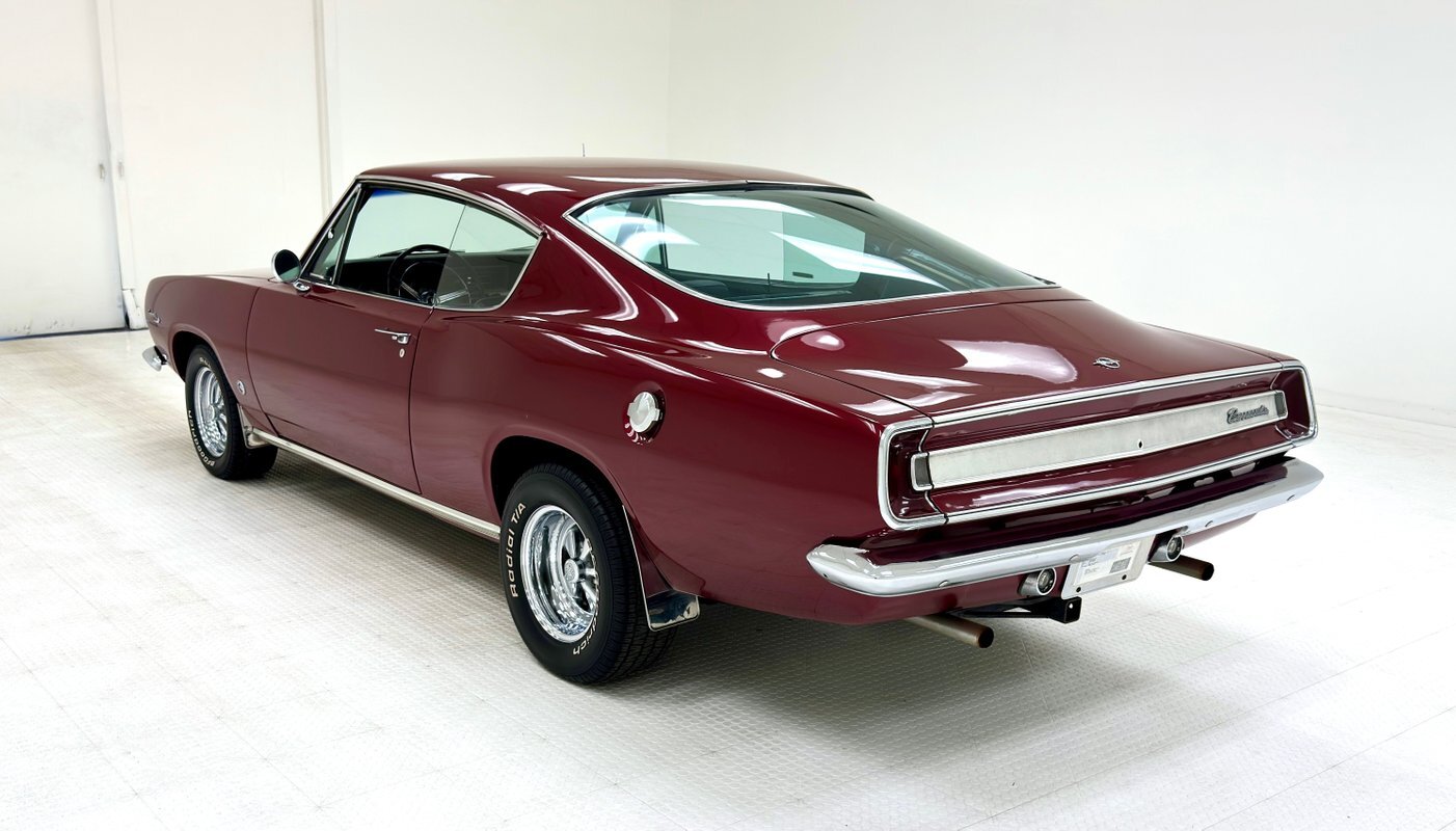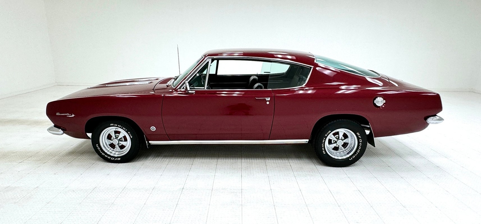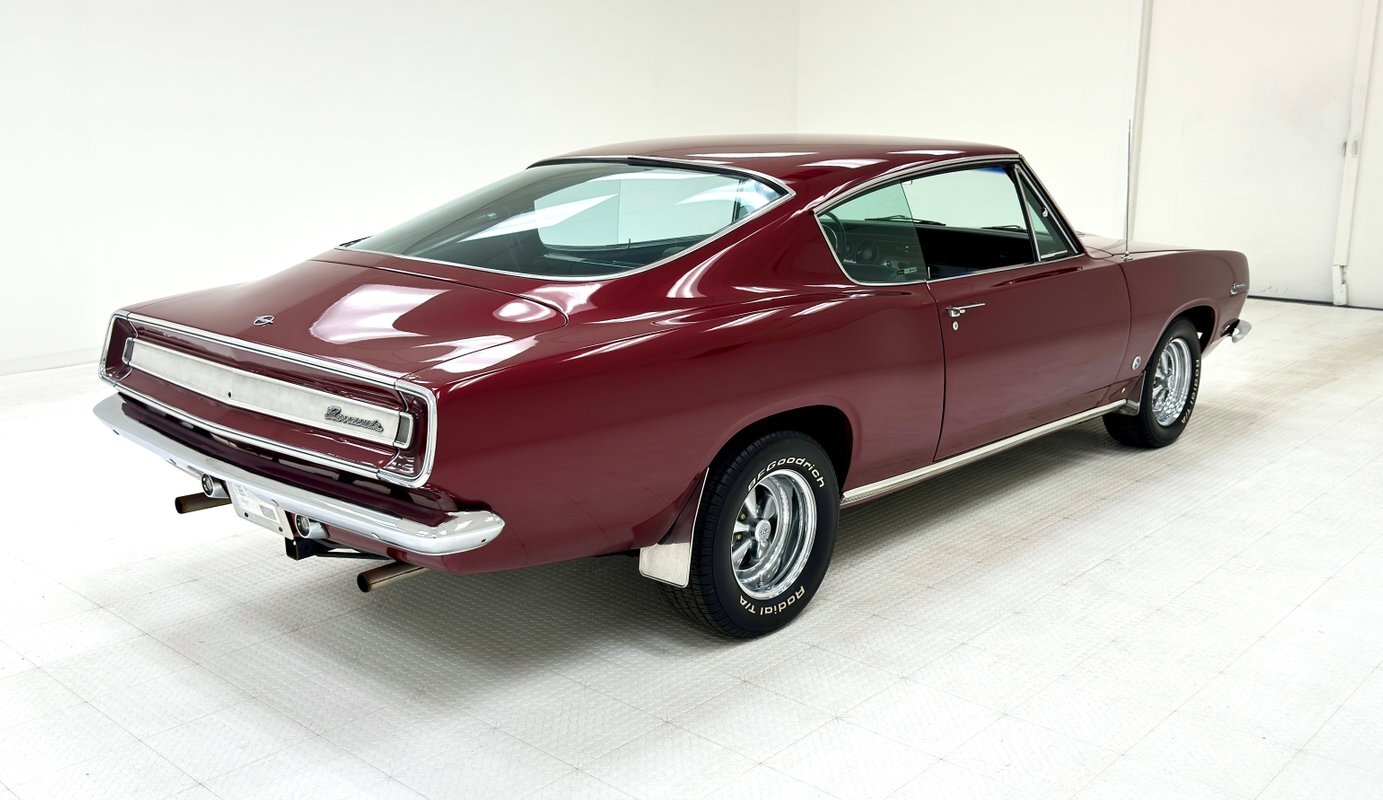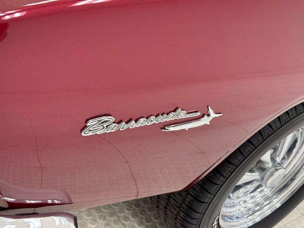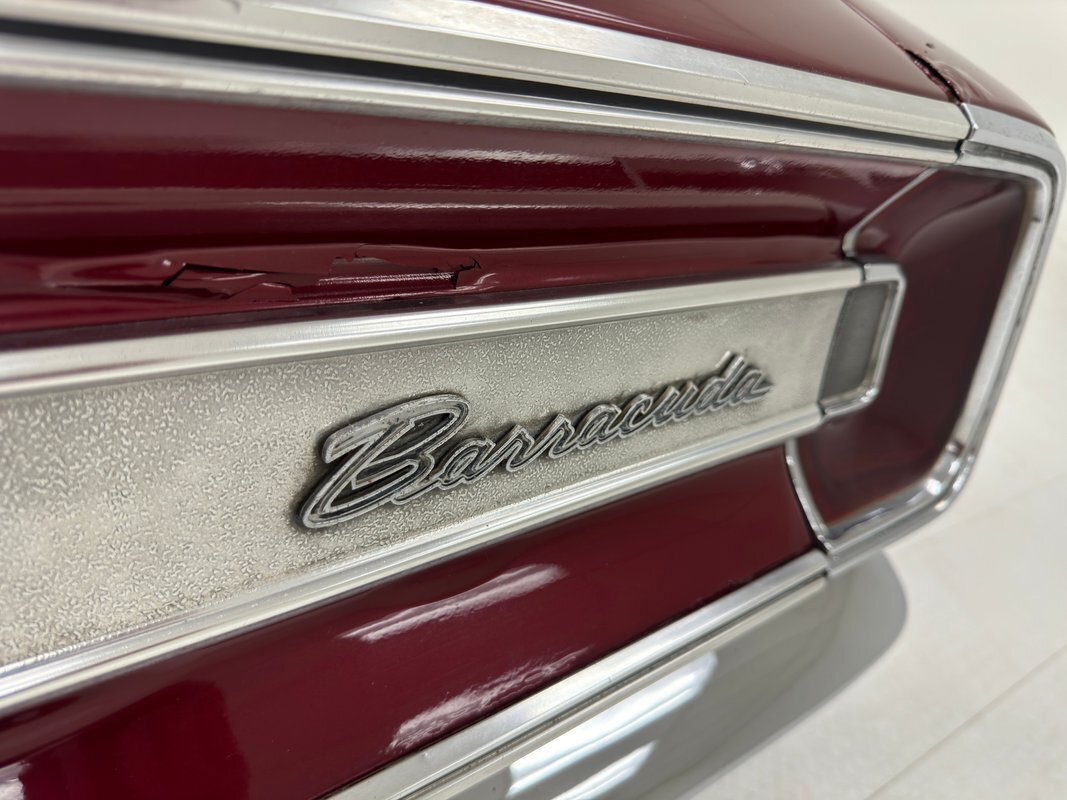 Uniqueness begins at the grille with our Ruby Red Metallic Barracuda, which is really two grilles that mirror each other and point to the middle where the nose forms an hourglass shape. Inset in the grilles are single round headlights and marker lights all underscored by a straight chrome bumper, all in great shape. Slight power bulges on the hood are topped with faux vents and headed by the first of several Barracuda emblems on the nose. Another appears on the front fender along with the name in script and while we're at the side, let's note the fantastic profile of the fastback, the roof widening slightly at the rain guard as it pinches between the window and C-pillar. The rear window curves and slopes to a short rear section while a razor straight shoulder line delineates the rounded top from the fish-like body. 14-inch Cragars fit the car well and the rear view with the full aluminum band into C-shaped tail lights is, for lack of a better word, epic! Now that we've swooned over the design, we're obligated to note some fish flaws. Multiple areas of bubbling in the paint, some significant bubbling in the door jamb with some visible rust in the jamb corner, various scratches and scuffs, rust on the inner decklid, top side of the right rear fender, parts of the roof, and peeling paint above the aforementioned aluminum band.