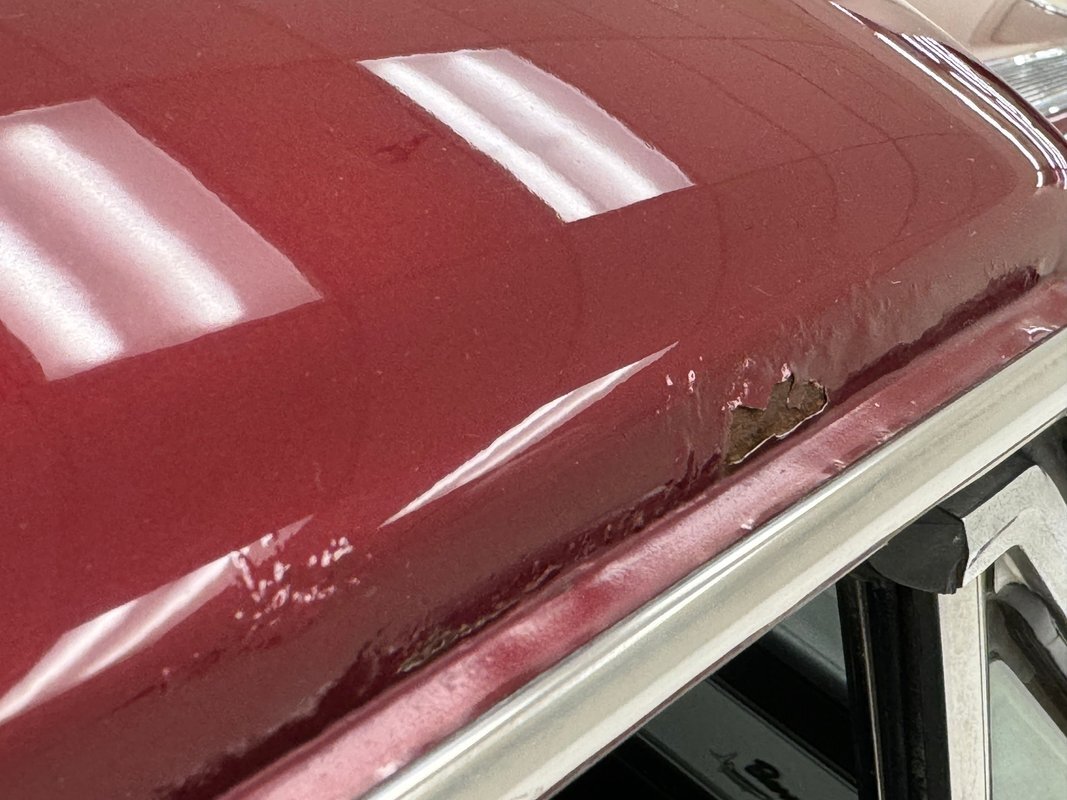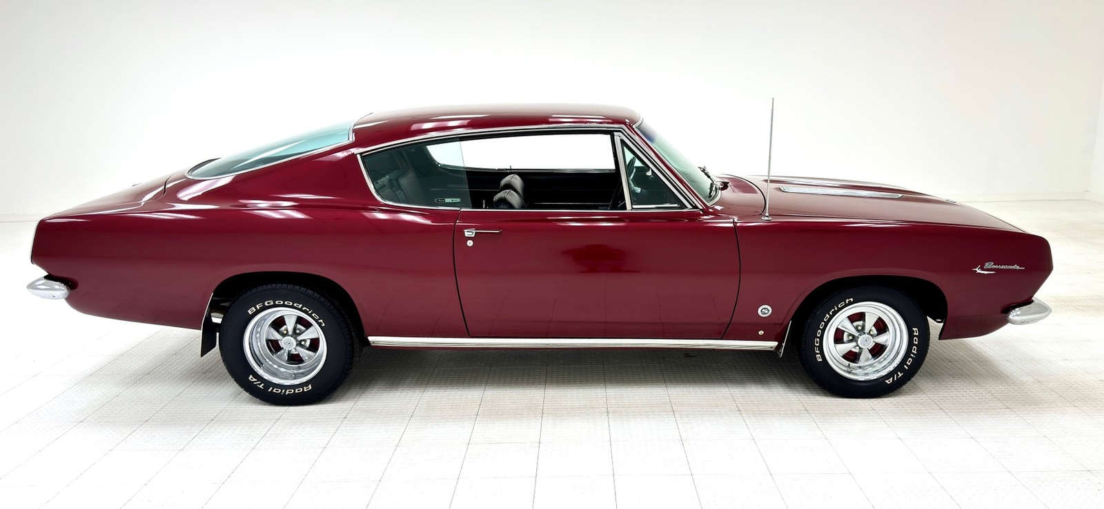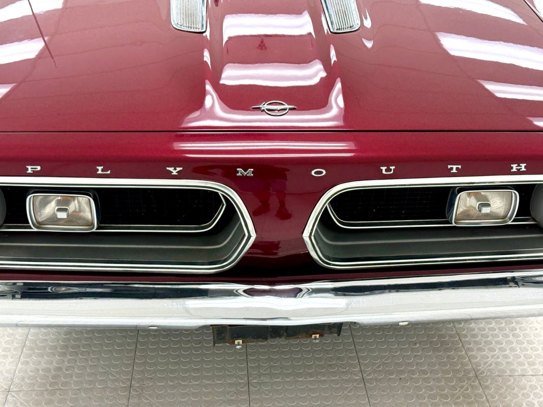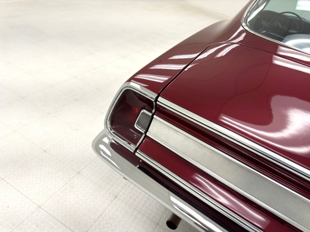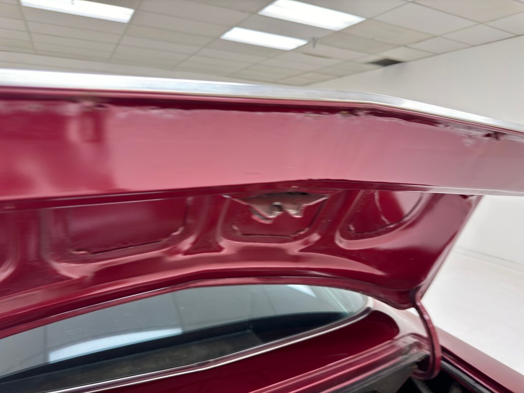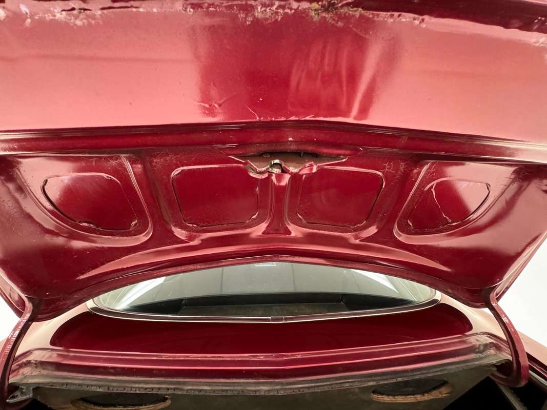 Uniqueness begins at the grille with our Ruby Red Metallic Barracuda, which is really two grilles that mirror each other and point to the middle where the nose forms an hourglass shape. Inset in the grilles are single round headlights and marker lights all underscored by a straight chrome bumper, all in great shape. Slight power bulges on the hood are topped with faux vents and headed by the first of several Barracuda emblems on the nose. Another appears on the front fender along with the name in script and while we're at the side, let's note the fantastic profile of the fastback, the roof widening slightly at the rain guard as it pinches between the window and C-pillar. The rear window curves and slopes to a short rear section while a razor straight shoulder line delineates the rounded top from the fish-like body. 14-inch Cragars fit the car well and the rear view with the full aluminum band into C-shaped tail lights is, for lack of a better word, epic! Now that we've swooned over the design, we're obligated to note some fish flaws. Multiple areas of bubbling in the paint, some significant bubbling in the door jamb with some visible rust in the jamb corner, various scratches and scuffs, rust on the inner decklid, top side of the right rear fender, parts of the roof, and peeling paint above the aforementioned aluminum band.