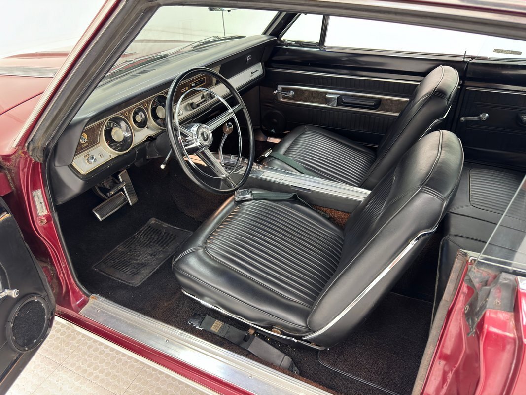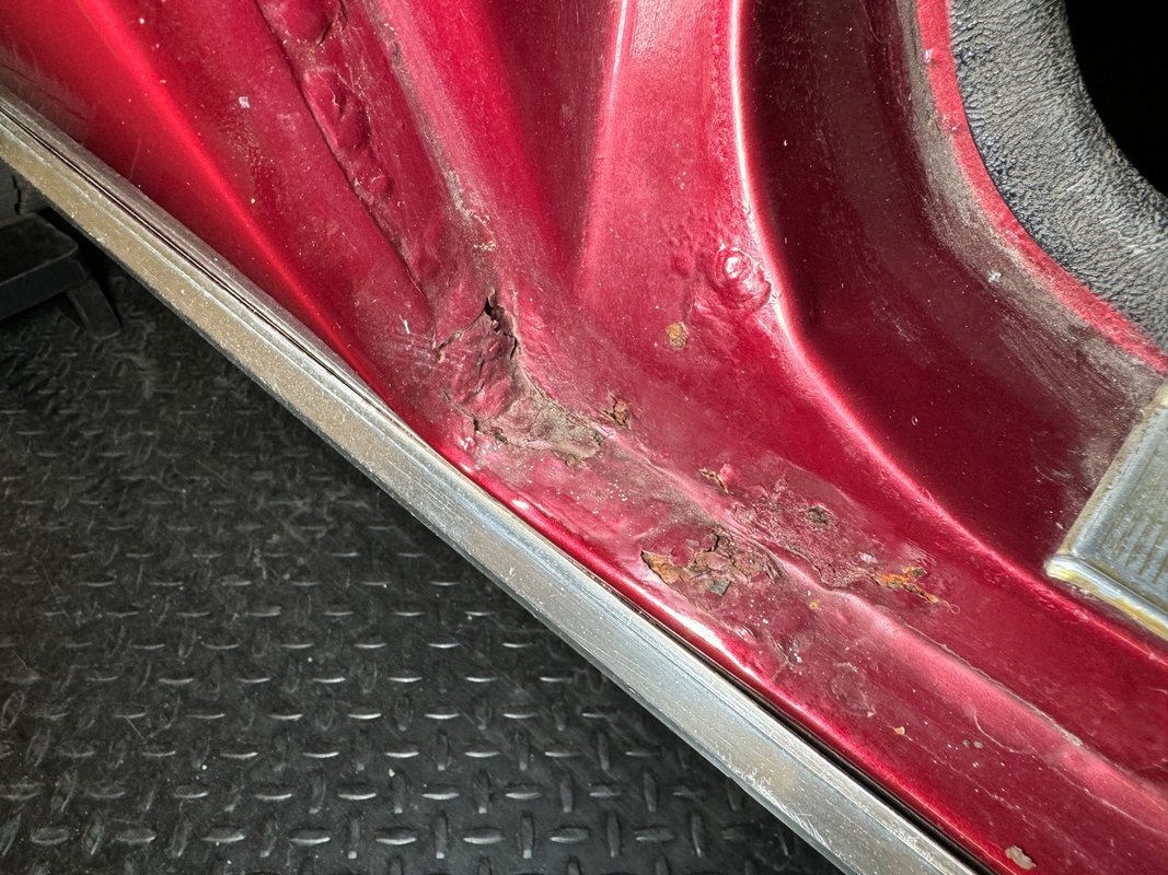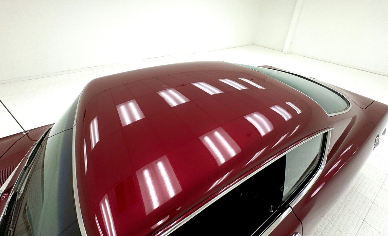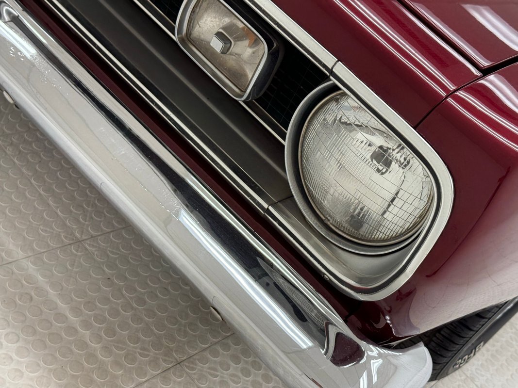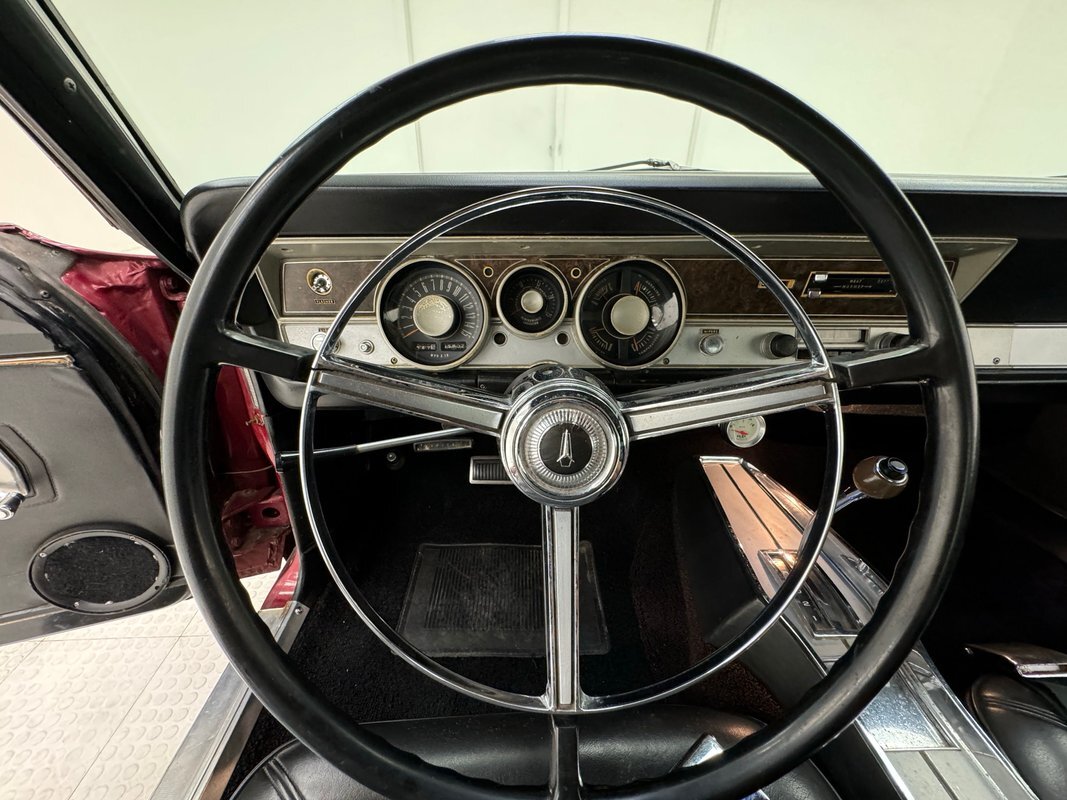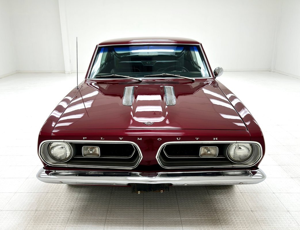 Uniqueness begins at the grille with our Ruby Red Metallic Barracuda, which is really two grilles that mirror each other and point to the middle where the nose forms an hourglass shape. Inset in the grilles are single round headlights and marker lights all underscored by a straight chrome bumper, all in great shape. Slight power bulges on the hood are topped with faux vents and headed by the first of several Barracuda emblems on the nose. Another appears on the front fender along with the name in script and while we're at the side, let's note the fantastic profile of the fastback, the roof widening slightly at the rain guard as it pinches between the window and C-pillar. The rear window curves and slopes to a short rear section while a razor straight shoulder line delineates the rounded top from the fish-like body. 14-inch Cragars fit the car well and the rear view with the full aluminum band into C-shaped tail lights is, for lack of a better word, epic! Now that we've swooned over the design, we're obligated to note some fish flaws. Multiple areas of bubbling in the paint, some significant bubbling in the door jamb with some visible rust in the jamb corner, various scratches and scuffs, rust on the inner decklid, top side of the right rear fender, parts of the roof, and peeling paint above the aforementioned aluminum band.