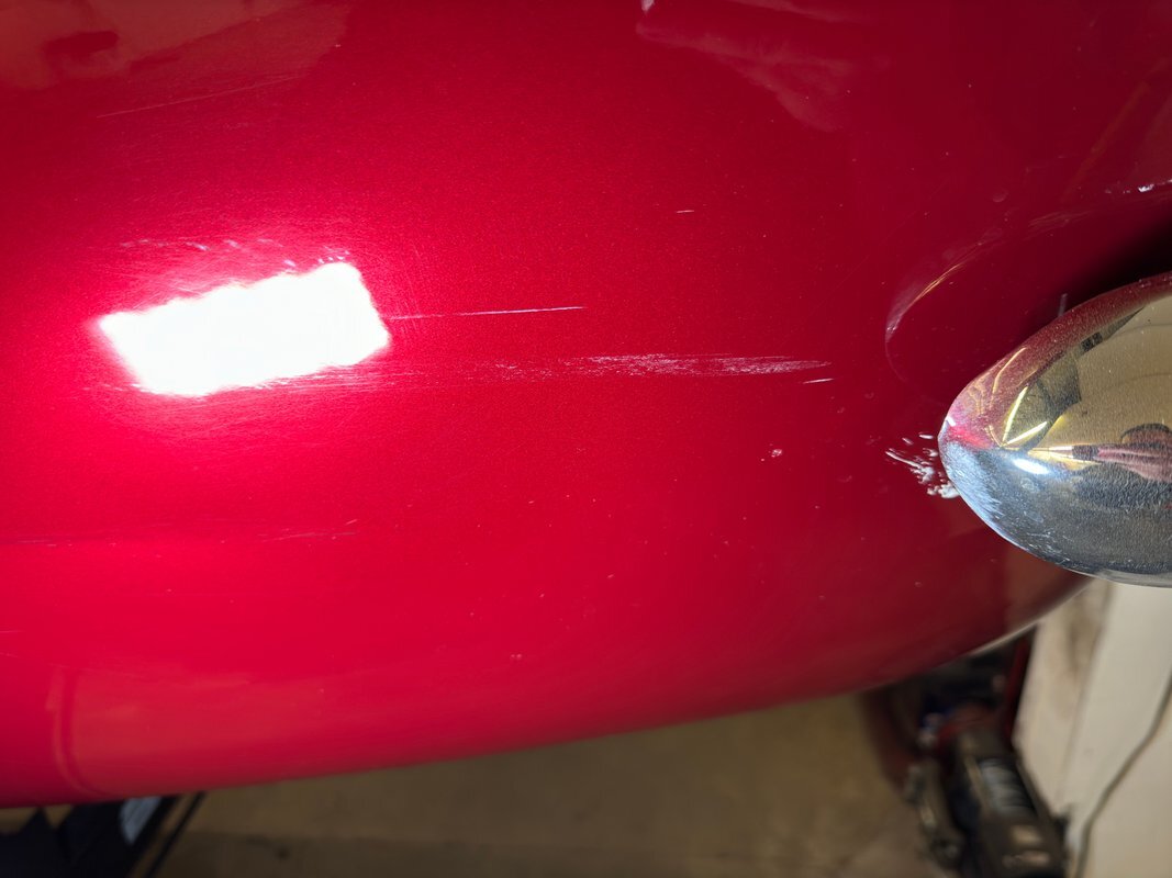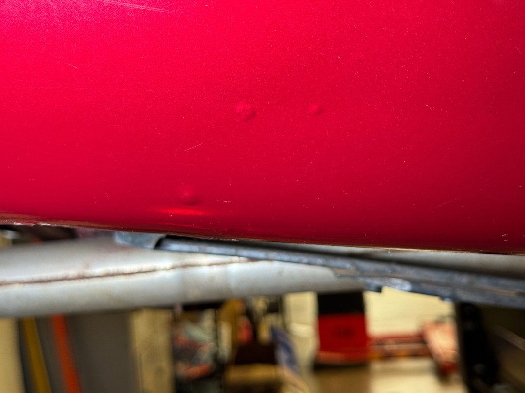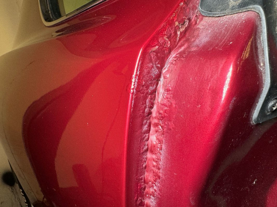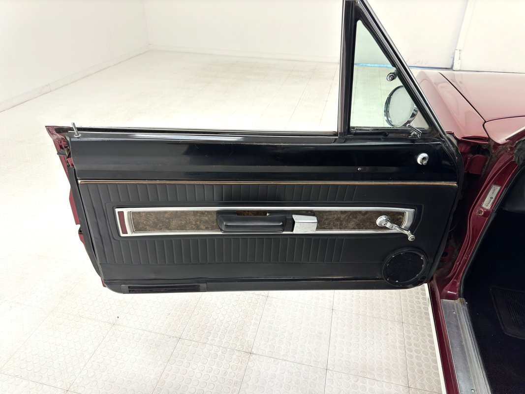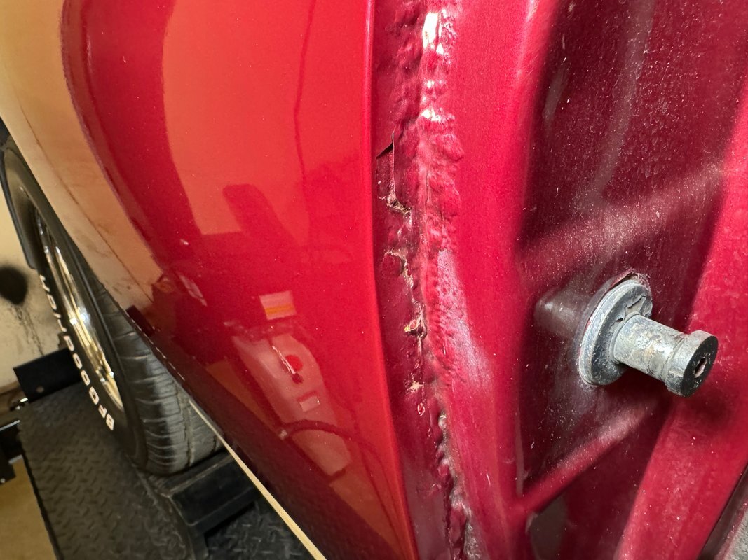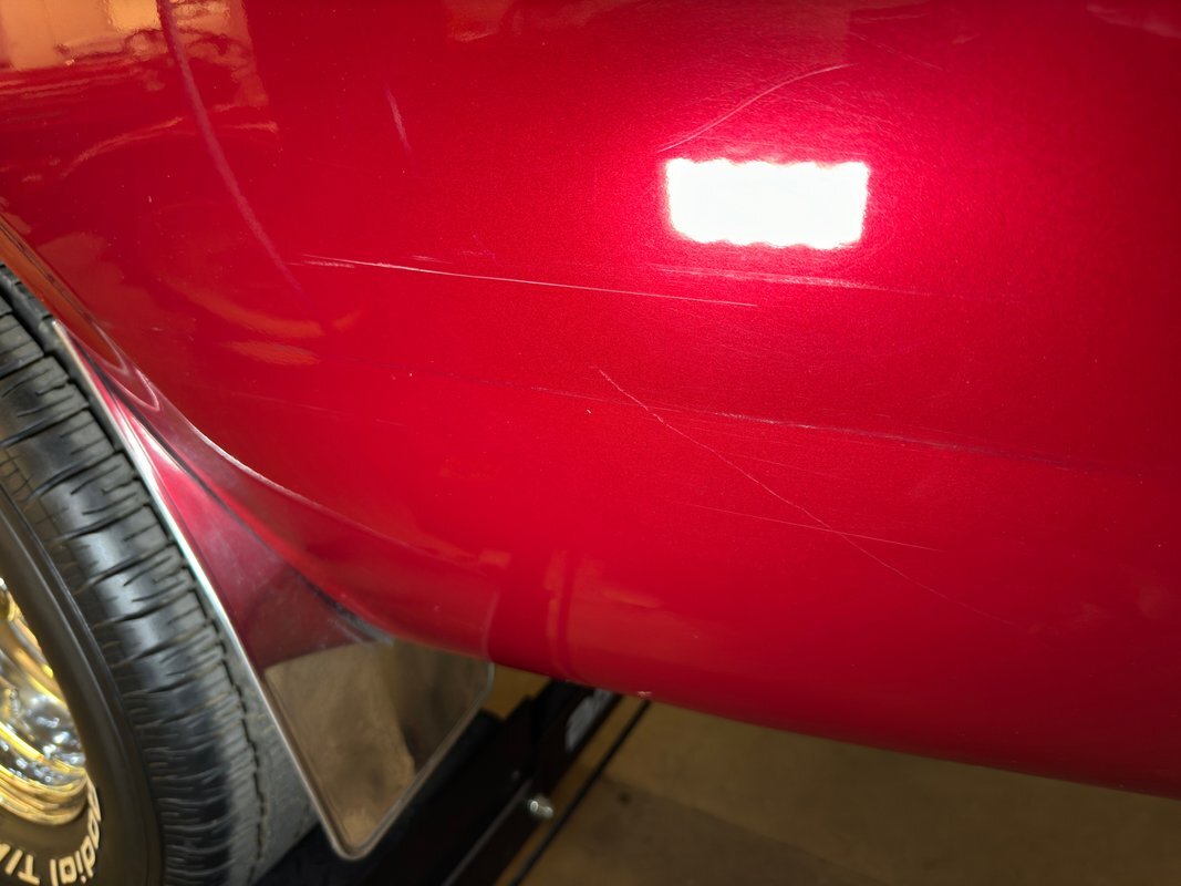 Uniqueness begins at the grille with our Ruby Red Metallic Barracuda, which is really two grilles that mirror each other and point to the middle where the nose forms an hourglass shape. Inset in the grilles are single round headlights and marker lights all underscored by a straight chrome bumper, all in great shape. Slight power bulges on the hood are topped with faux vents and headed by the first of several Barracuda emblems on the nose. Another appears on the front fender along with the name in script and while we're at the side, let's note the fantastic profile of the fastback, the roof widening slightly at the rain guard as it pinches between the window and C-pillar. The rear window curves and slopes to a short rear section while a razor straight shoulder line delineates the rounded top from the fish-like body. 14-inch Cragars fit the car well and the rear view with the full aluminum band into C-shaped tail lights is, for lack of a better word, epic! Now that we've swooned over the design, we're obligated to note some fish flaws. Multiple areas of bubbling in the paint, some significant bubbling in the door jamb with some visible rust in the jamb corner, various scratches and scuffs, rust on the inner decklid, top side of the right rear fender, parts of the roof, and peeling paint above the aforementioned aluminum band.