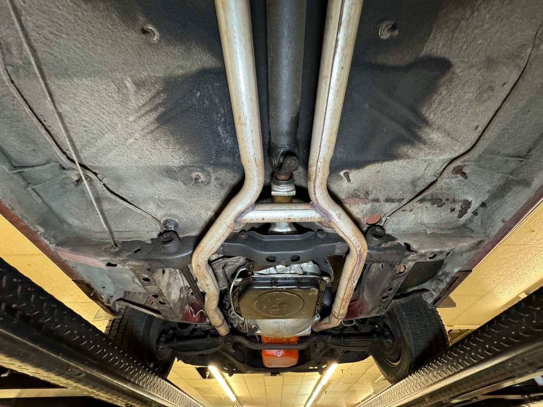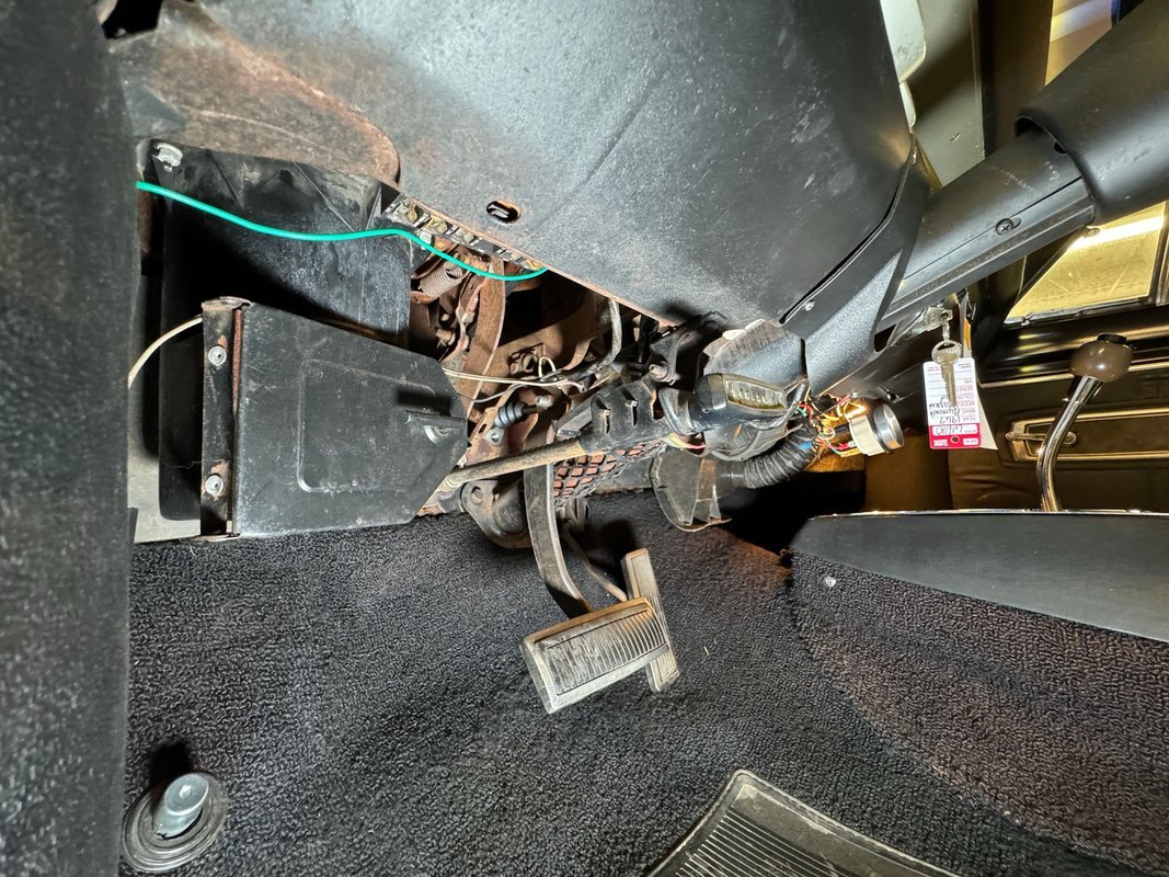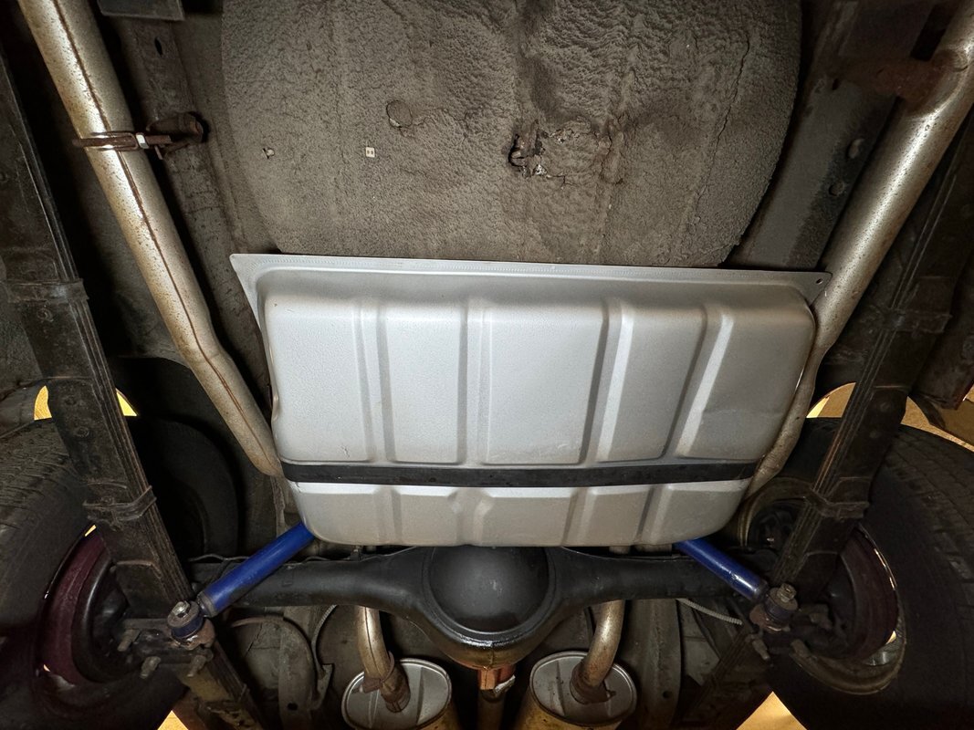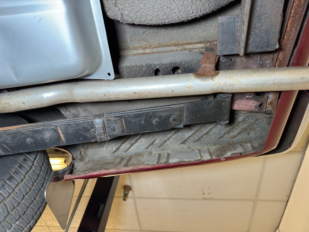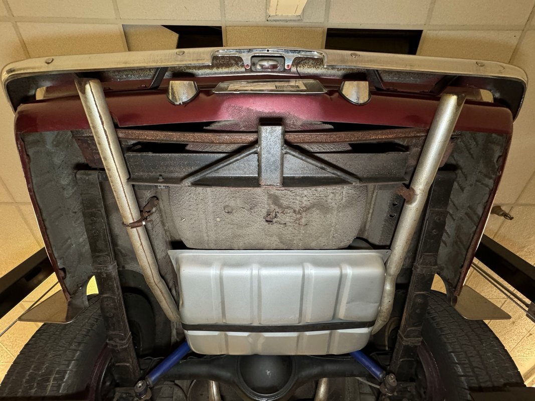 Clean, driver quality underneath with typical surface rust, hints of oil on the flywheel cover and rear differential, and dual exhaust that intersect stock style mufflers before exiting in the rear via straight pipes. Torsion bars suspension is found in the front and the back is equipped with leaf springs. We do note some invasive rust on a floor board where some patchwork has been done, and a bit on the frame rail as well. Our consignor states the gas tank and sending unit are new.