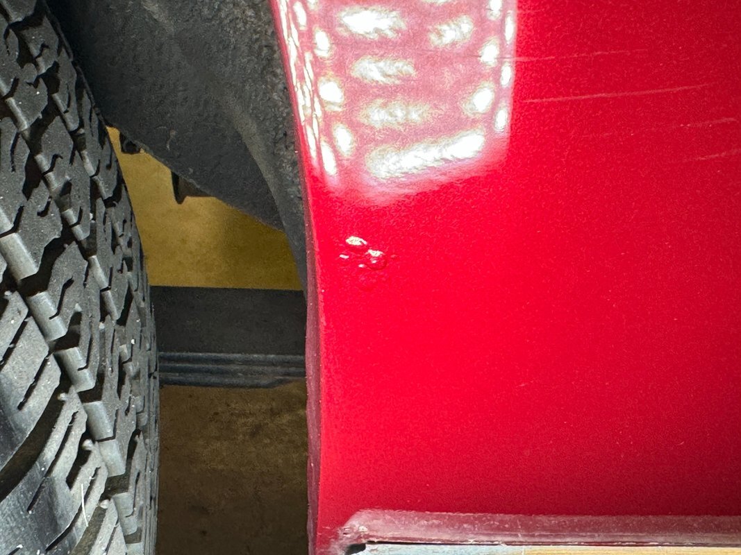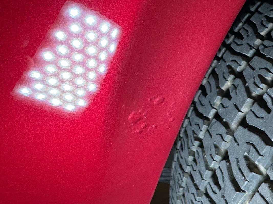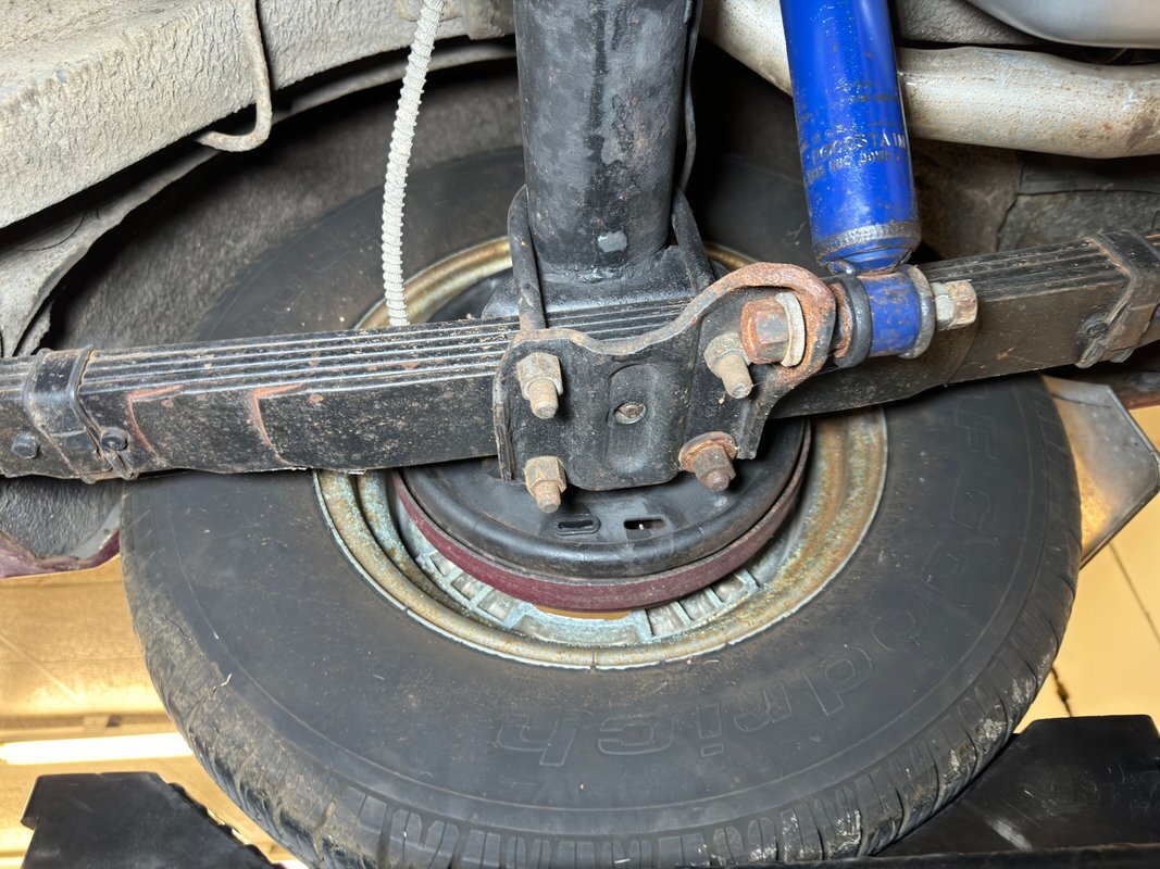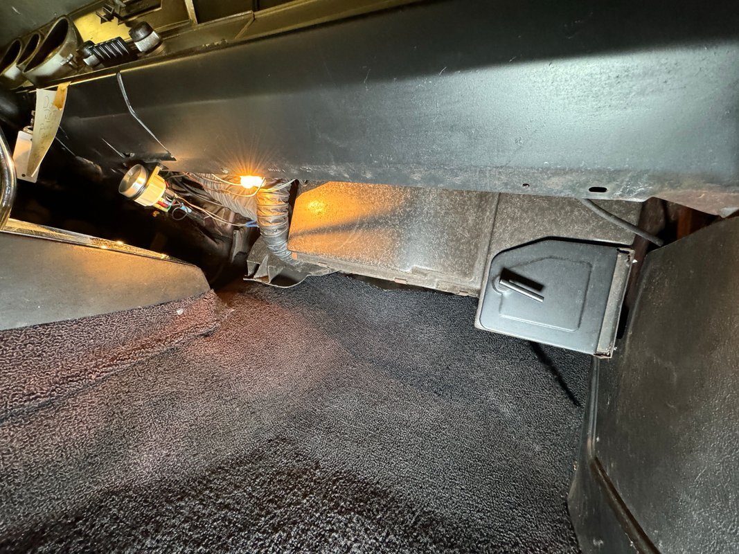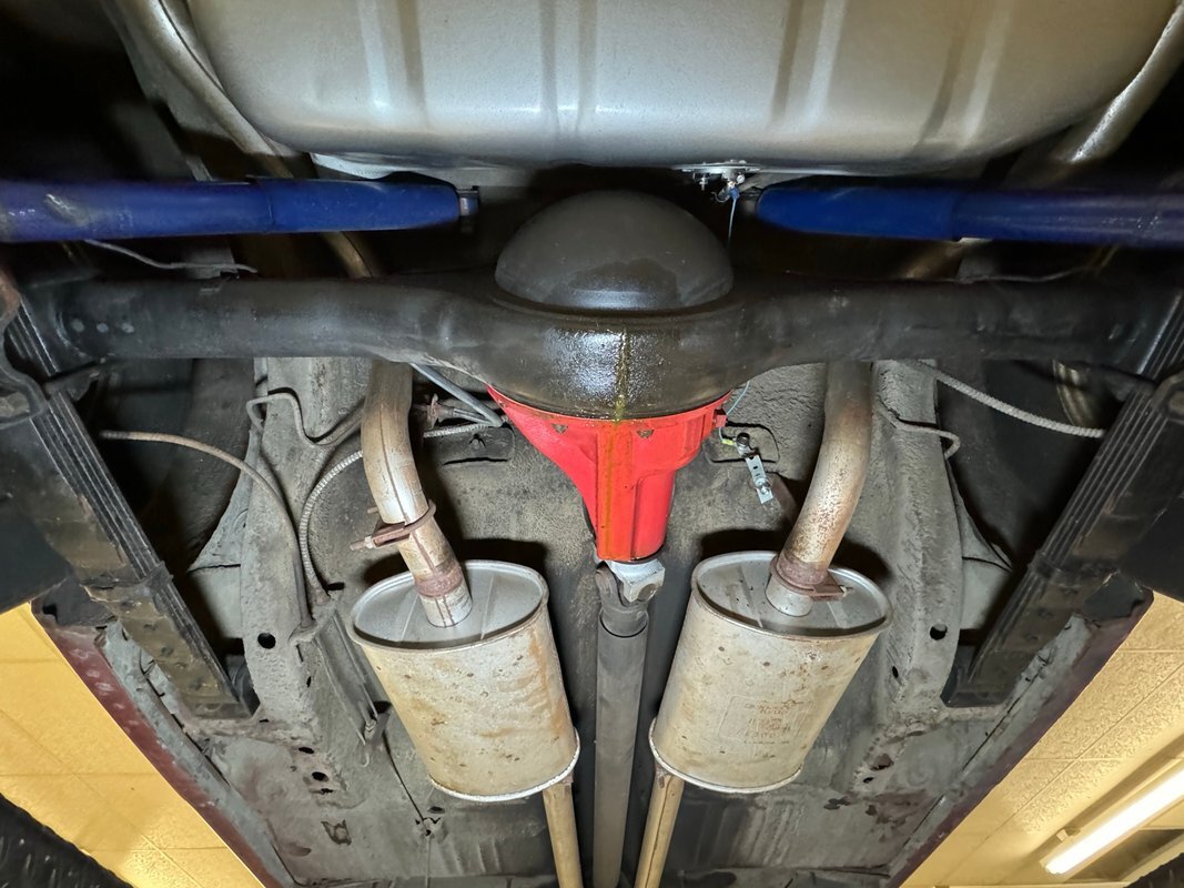 Clean, driver quality underneath with typical surface rust, hints of oil on the flywheel cover and rear differential, and dual exhaust that intersect stock style mufflers before exiting in the rear via straight pipes. Torsion bars suspension is found in the front and the back is equipped with leaf springs. We do note some invasive rust on a floor board where some patchwork has been done, and a bit on the frame rail as well. Our consignor states the gas tank and sending unit are new.