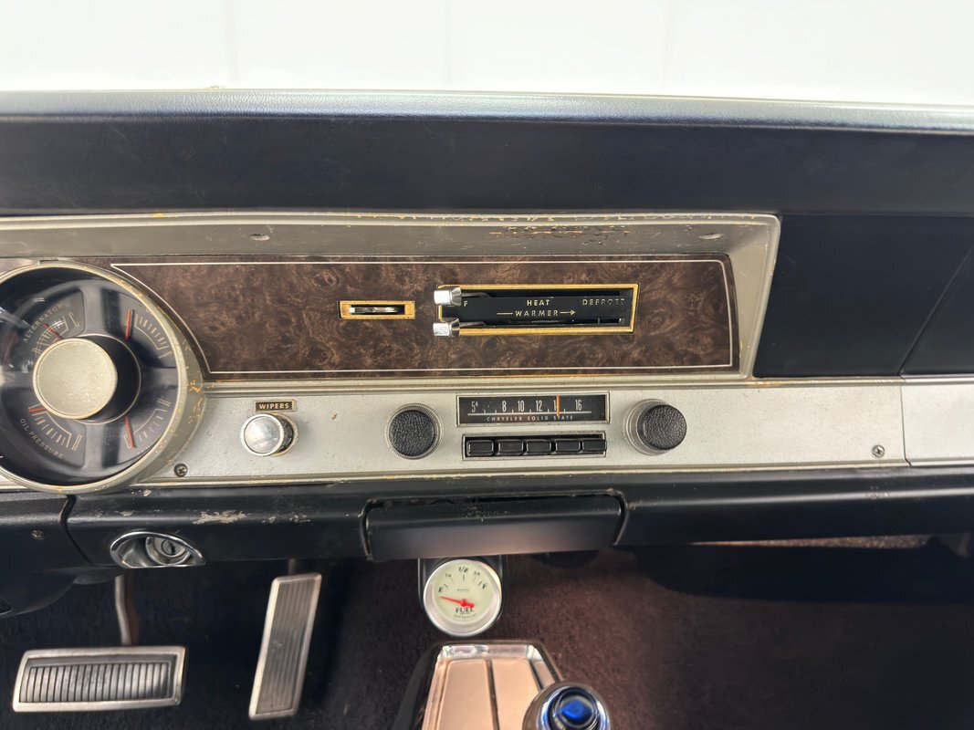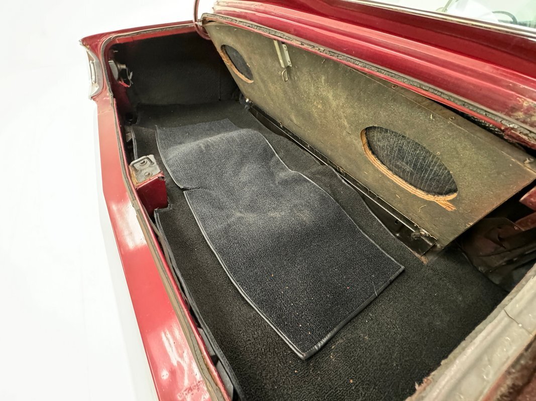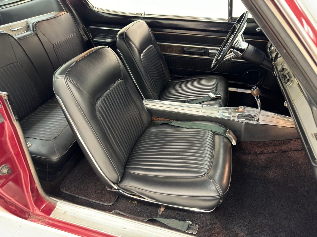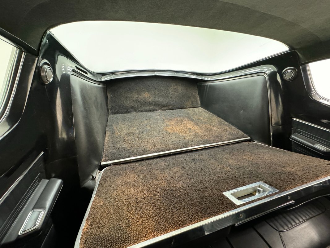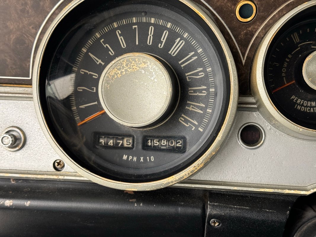 Black patterned vinyl door cards are augmented by a faux burl wood panel and are in decent condition. Low back black vinyl pleated bucket seats occupy the front and present well with robust foam inserts, while the rear bench shows a bit of wear, particularly around the piping. The black plastic steering wheel with metal horn ring is in good shape with just a bit of pitting on the collar. Three gauges appear before the driver split by more faux wood and aluminum and include the "Performance Indicator" which is a vacuum gauge. Simple vent controls and an AM radio are found towards the center and an aftermarket gas gauge has been added under the dash. A contoured center console retains the shifter, a slightly curved stick with a thumb activated top knob, and a flat topped storage bin. Black loop carpet covers the floor and a black stitched headliner, and visors rise above the occupant and it all appears in good condition.