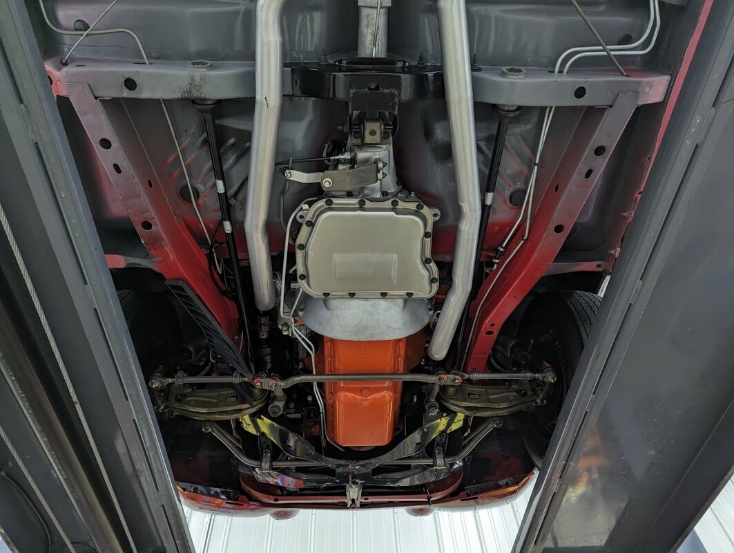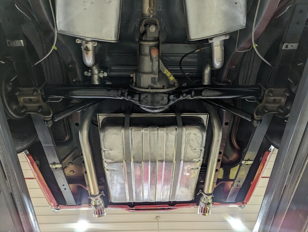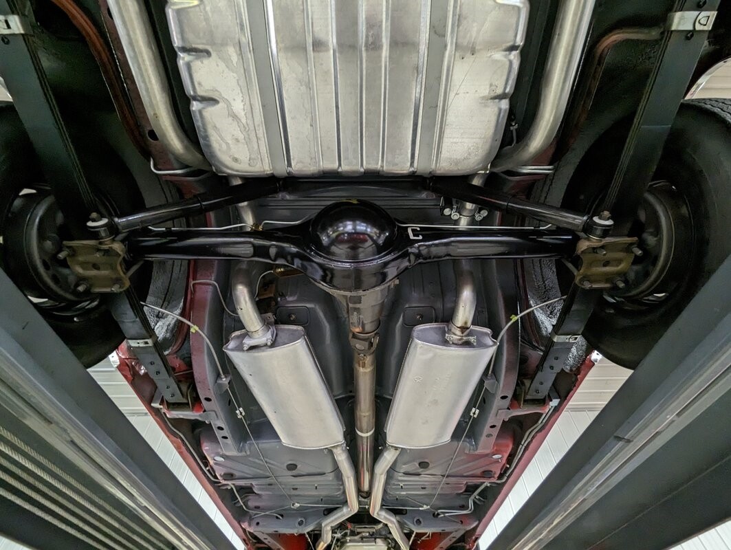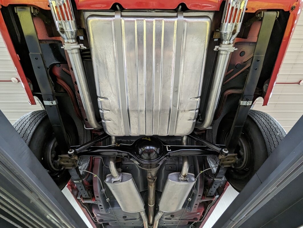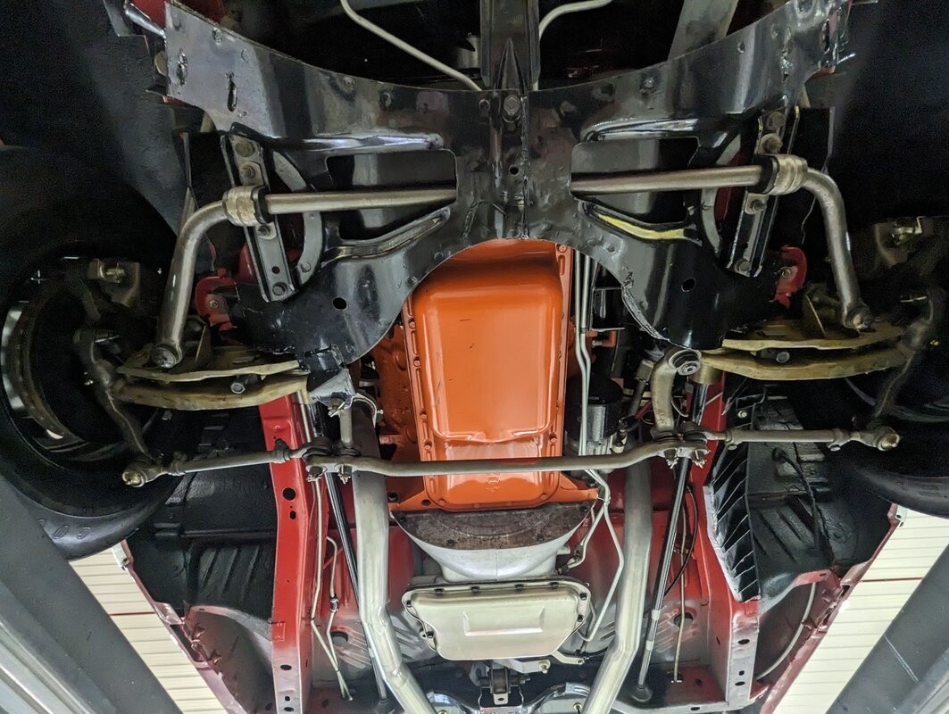 UNDERSIDE: It was flipped on a rotisserie and concourse restored down to assembly line markings. Pristine metal is painted correctly in gray primer with the proper red overspray from the body. Every single item is restored and detailed. Rebuilt suspension and steering. Restored brake system with disc in front. Fuel system was restored. Correct dual exhaust system with optional tips that look like they are off a gun barrel. Looking up at the motor it looks like new. The matching #s are stamped on the pad above the oil pan, casting codes and dates are correct. VIN # matching 727 Torqueflite automatic. Correct 8 3/4 rear end with 3.23 gears.