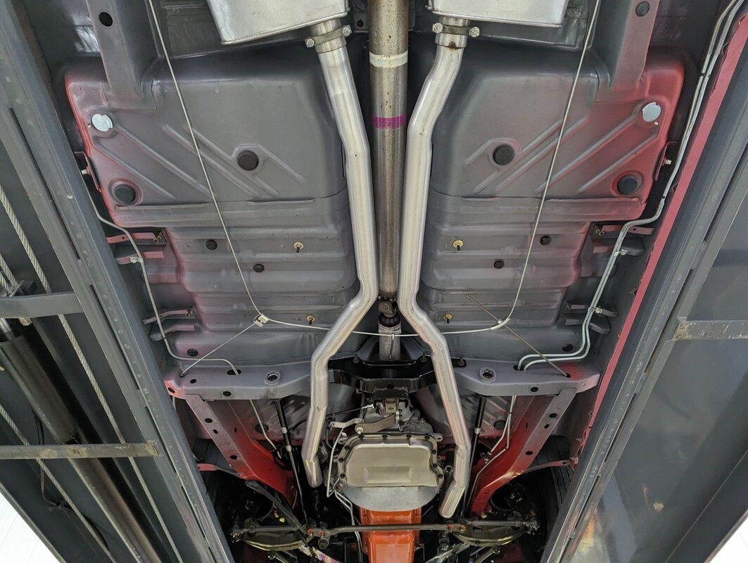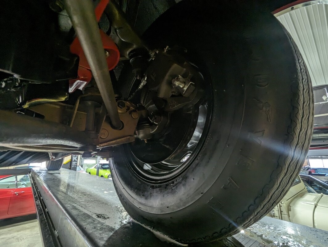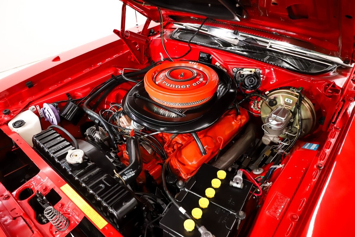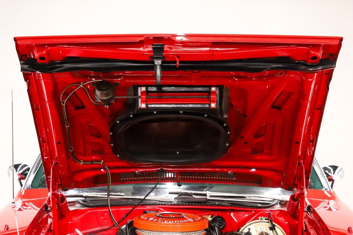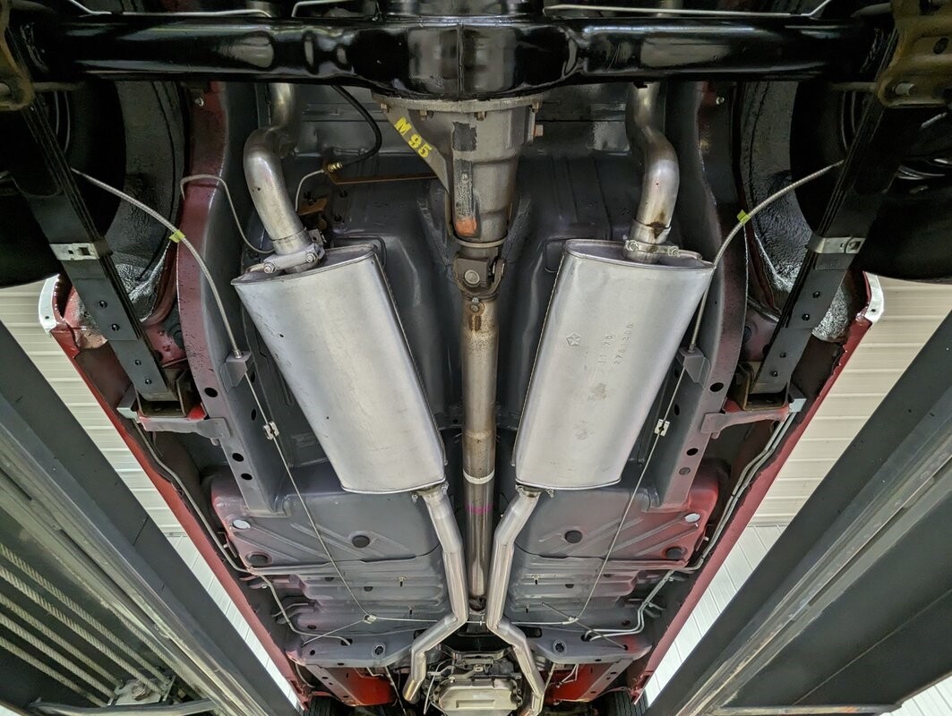 UNDERSIDE: It was flipped on a rotisserie and concourse restored down to assembly line markings. Pristine metal is painted correctly in gray primer with the proper red overspray from the body. Every single item is restored and detailed. Rebuilt suspension and steering. Restored brake system with disc in front. Fuel system was restored. Correct dual exhaust system with optional tips that look like they are off a gun barrel. Looking up at the motor it looks like new. The matching #s are stamped on the pad above the oil pan, casting codes and dates are correct. VIN # matching 727 Torqueflite automatic. Correct 8 3/4 rear end with 3.23 gears.