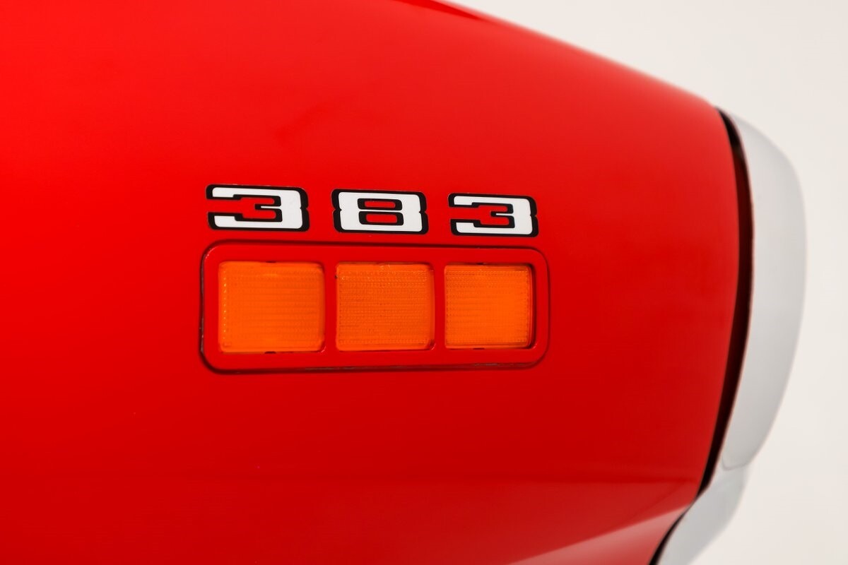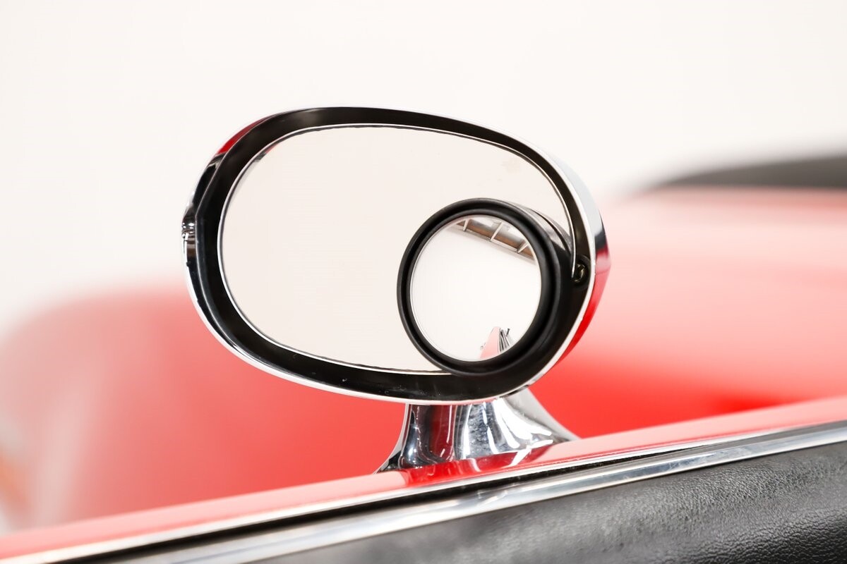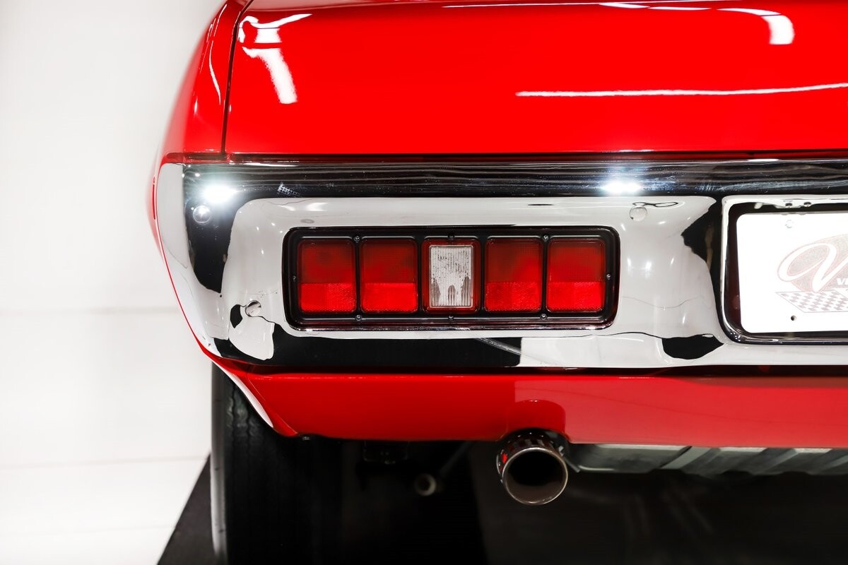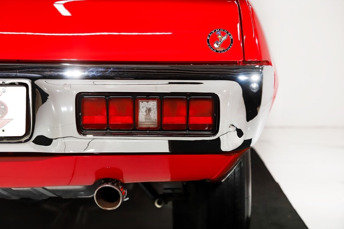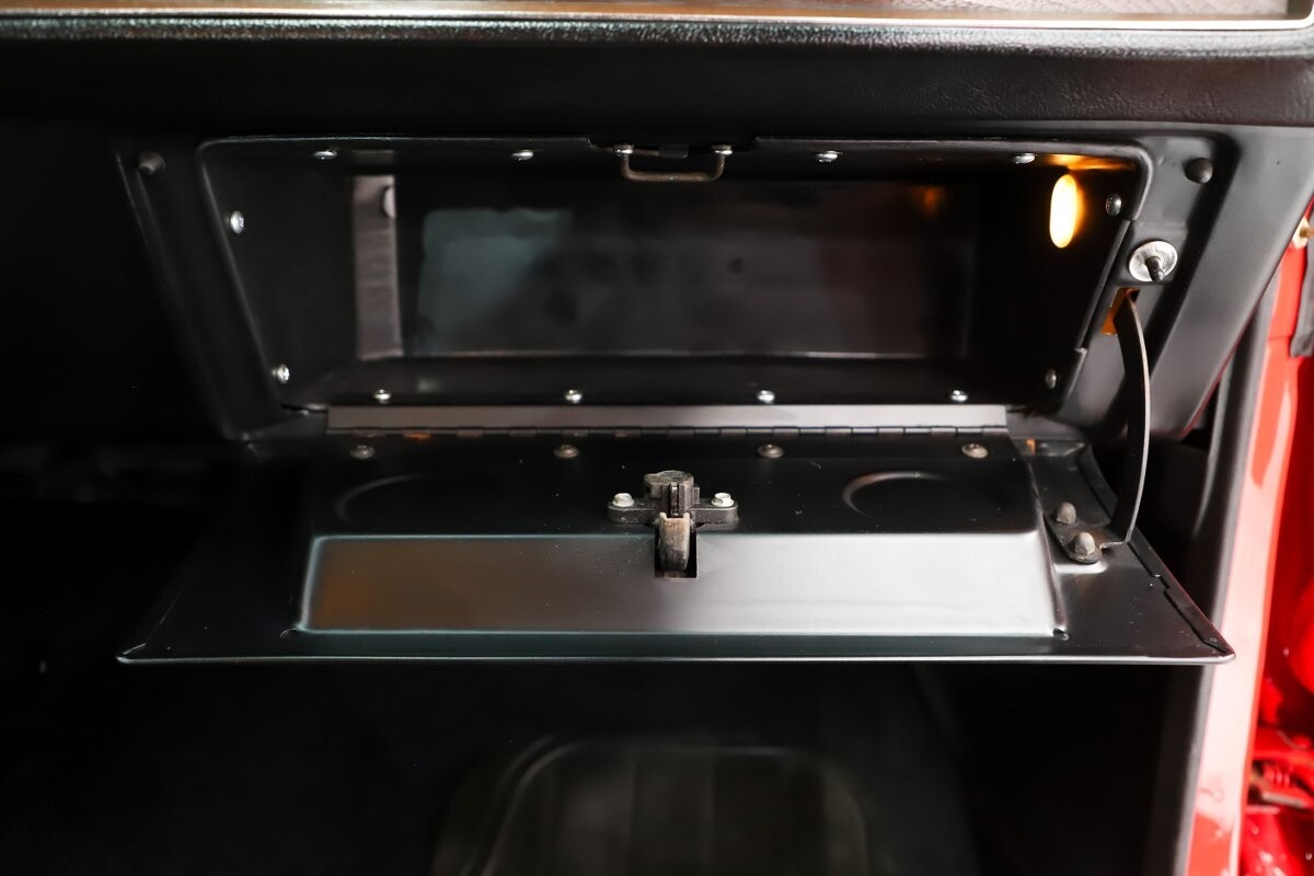EXTERIOR: I'll admit the fit and finish is actually better than when it was at the factory! The body gaps are as tight as a Mercedes, doors open and close like a new car. I found zero rust, bubbles, cracks, or damage. Every inch is laser straight. Repainted its original Rallye Red color and it is polished like glass. The matte finish hood patch is in excellent shape too. In the middle of the hood a vacuum operated door opens to force fresh air into the motor. It is also optioned out with hood pics and, fender mounted turn signals, chrome racing mirrors and a canopy top. The bumpers have show chrome; the stainless trim is straight and polished. The glass is crystal clear, weatherstrips were replaced. It's rolling on a set of restored rallye wheels wearing reproduction Polyglass tires.