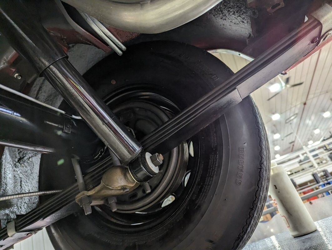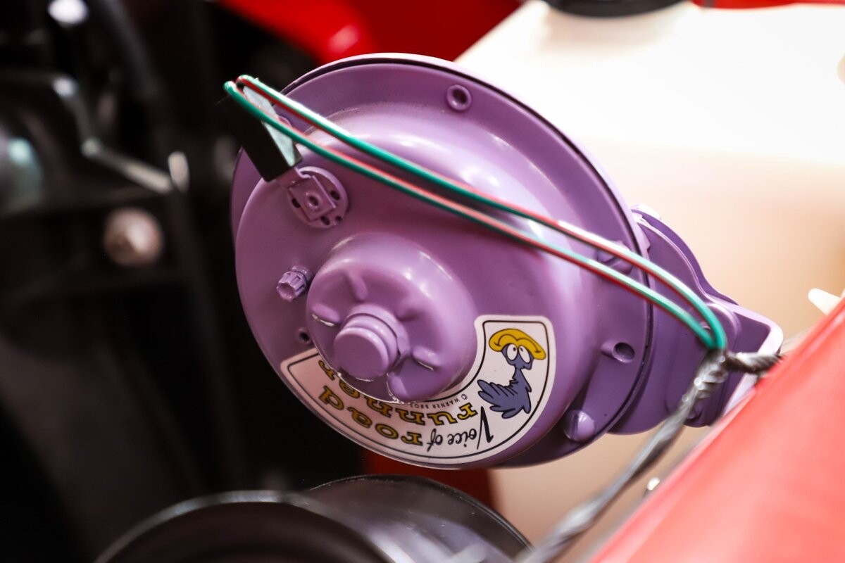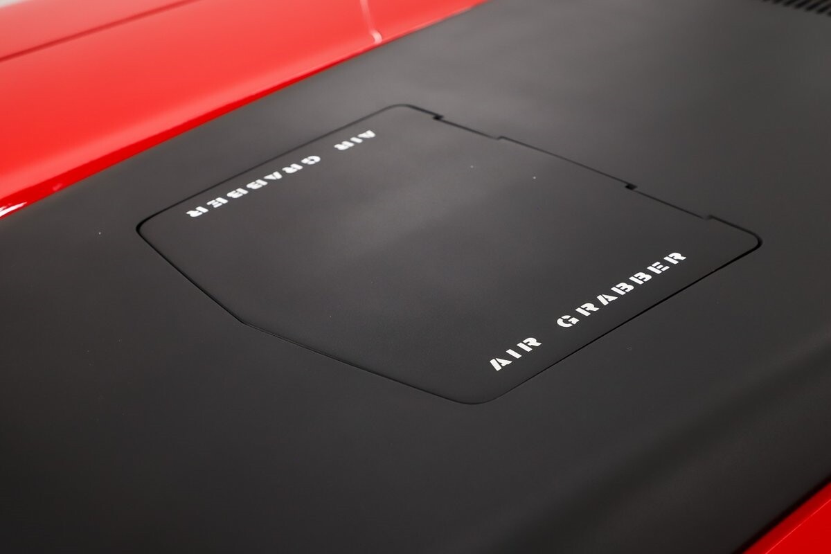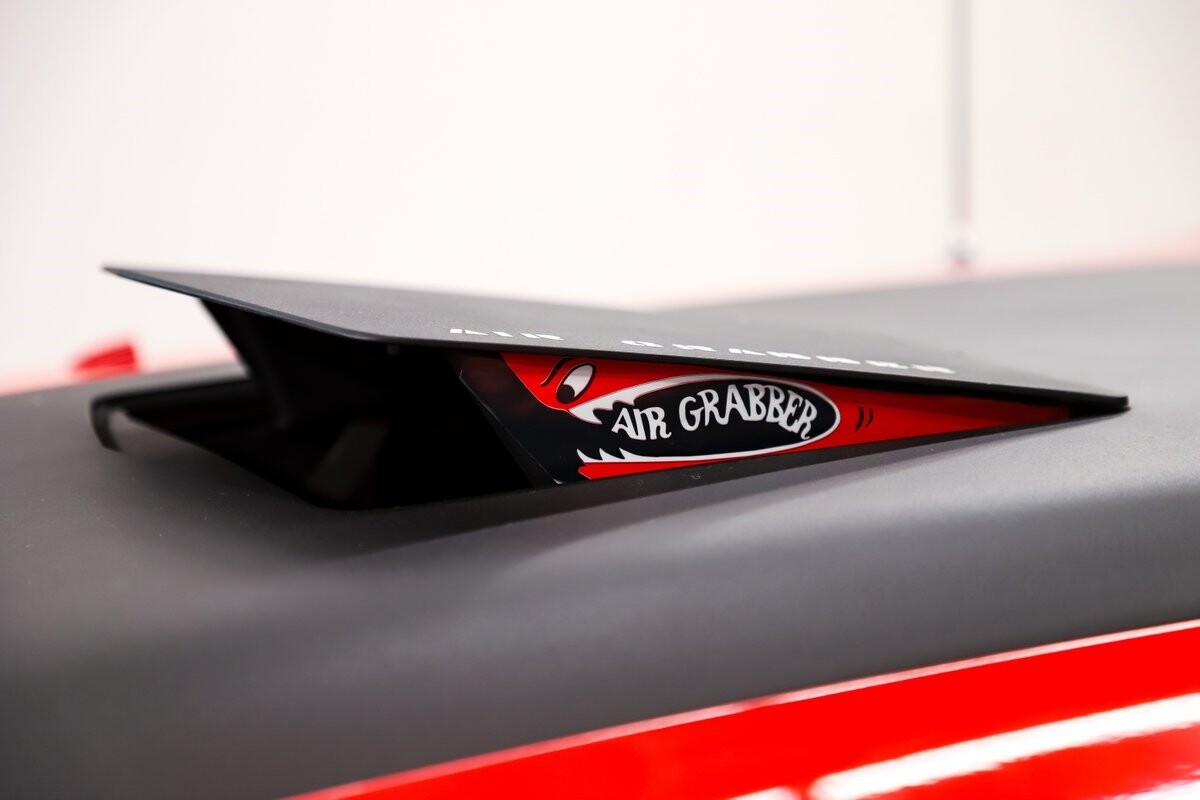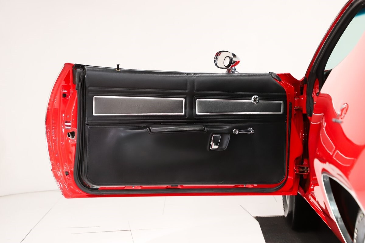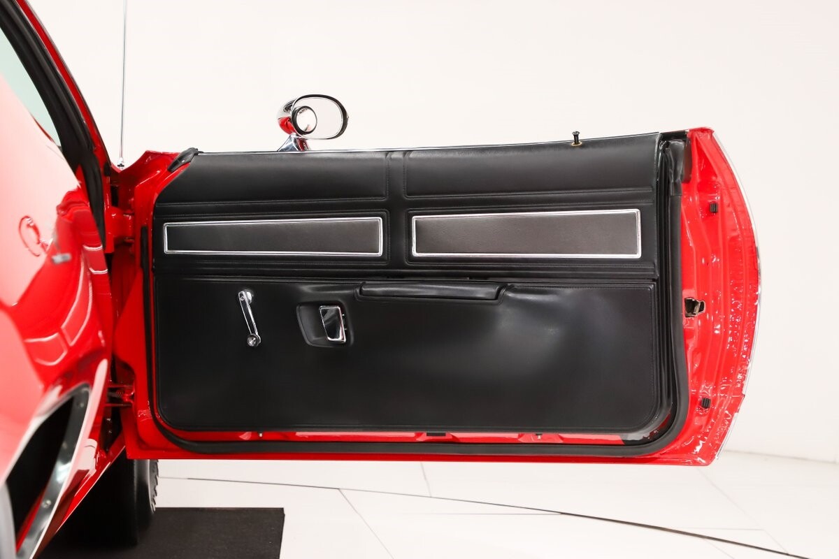 EXTERIOR: I'll admit the fit and finish is actually better than when it was at the factory! The body gaps are as tight as a Mercedes, doors open and close like a new car. I found zero rust, bubbles, cracks, or damage. Every inch is laser straight. Repainted its original Rallye Red color and it is polished like glass. The matte finish hood patch is in excellent shape too. In the middle of the hood a vacuum operated door opens to force fresh air into the motor. It is also optioned out with hood pics and, fender mounted turn signals, chrome racing mirrors and a canopy top. The bumpers have show chrome; the stainless trim is straight and polished. The glass is crystal clear, weatherstrips were replaced. It's rolling on a set of restored rallye wheels wearing reproduction Polyglass tires.