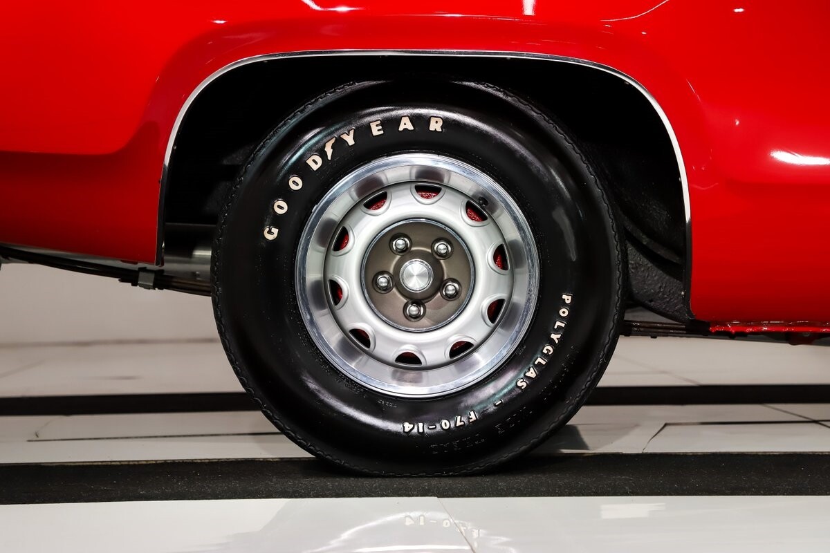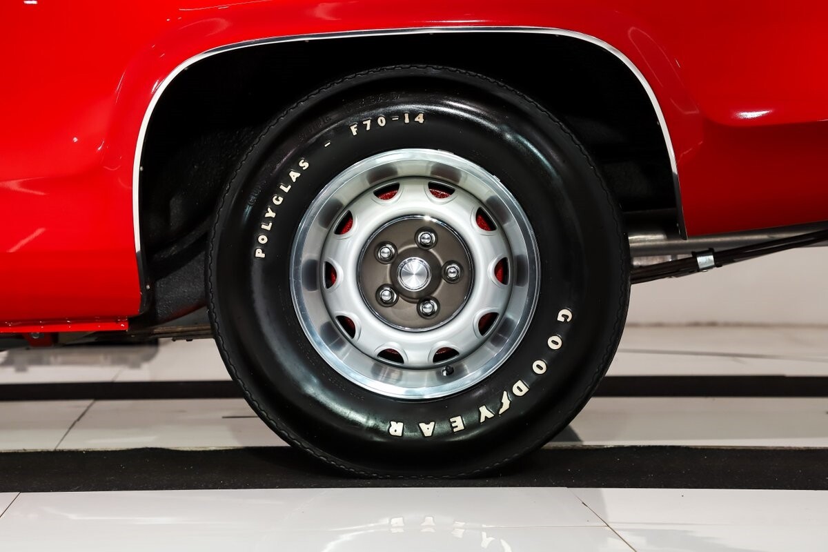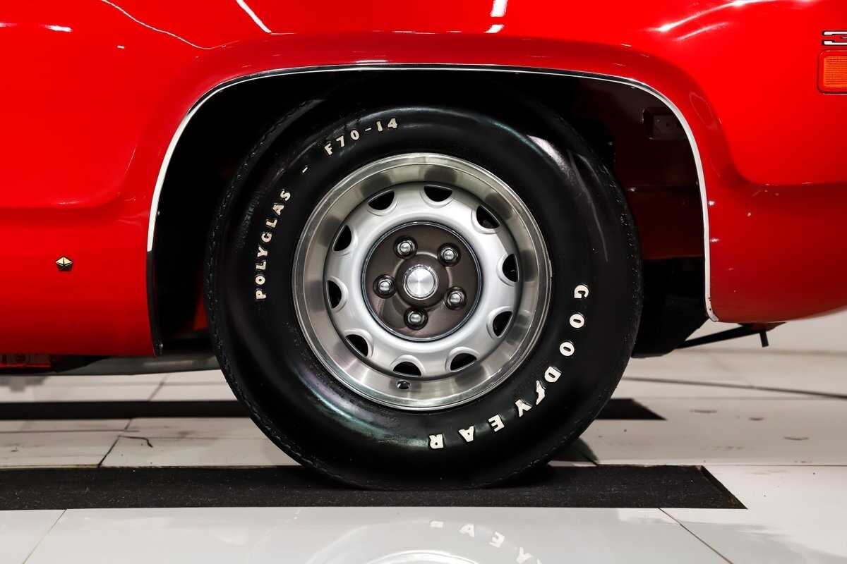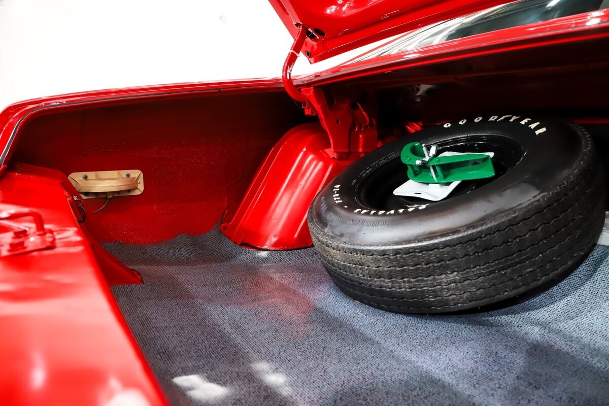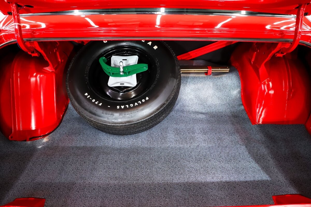 TRUNK COMPARTMENT: You will go straight back to 1971 when you open this trunk. All the metal is spotless and painted a gloss red. It has new weatherstrip, mat, decal etc. Complete jack and spare assembly. It has a matching reproduction polyglass tire on a restored rim, the jack is like new.