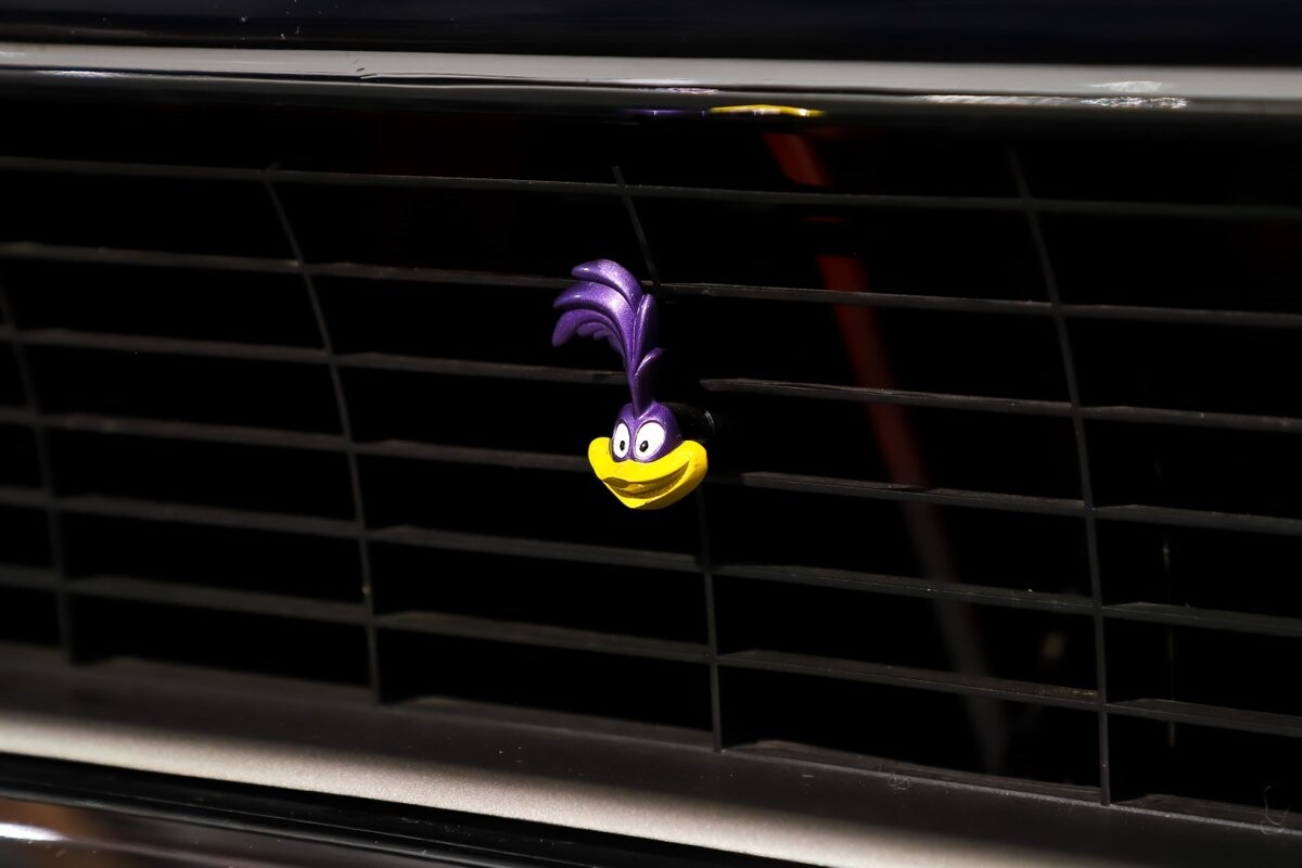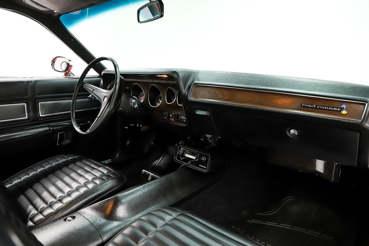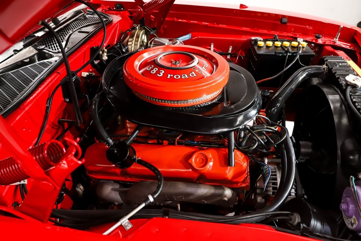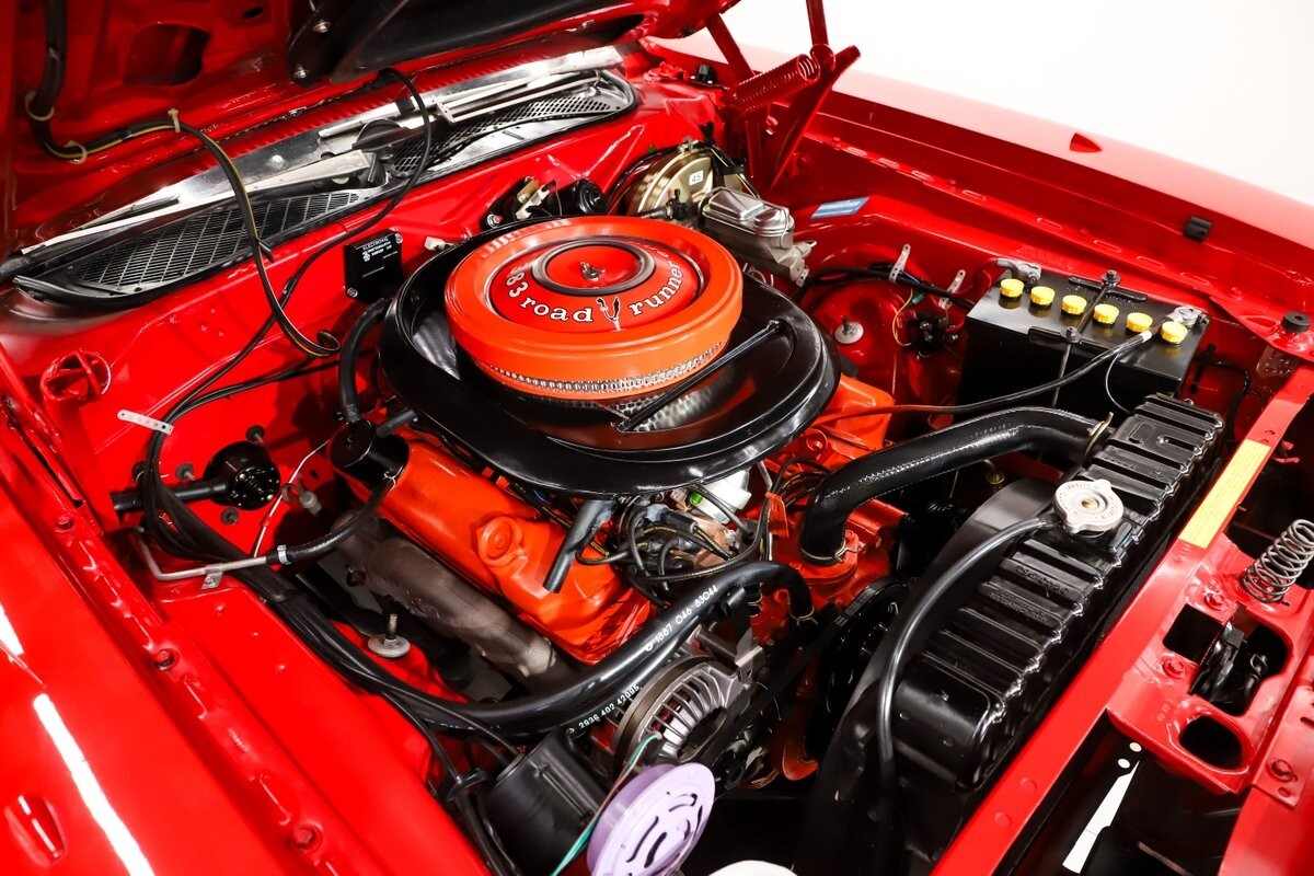 ENGINE COMPARTMENT: Detailed to factory specs right down to dated reproduction plug wires. VIN # matching 383-300 hp motor with a complete and functional N96 Air Grabber. Correct manifolds, air cleaner, valve covers, pulleys etc. Correct Mopar radiator, reproduction clamps and hoses. It's complete from the restored Road Runner horn to the windshield squirters. Detailed in the proper finishes, the orange overspray on the battery cable is actually correct! The VIN on the core support matches the car and the fender tag is attached. It features power steering and brakes.