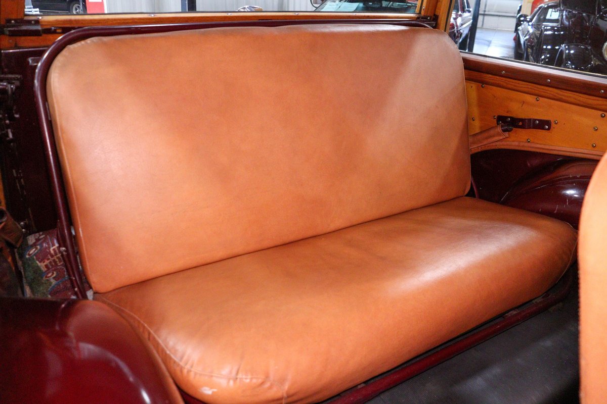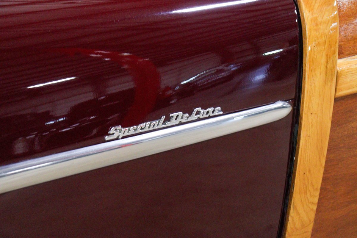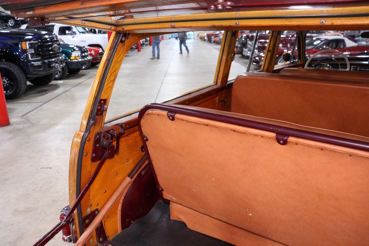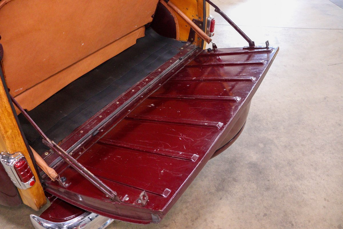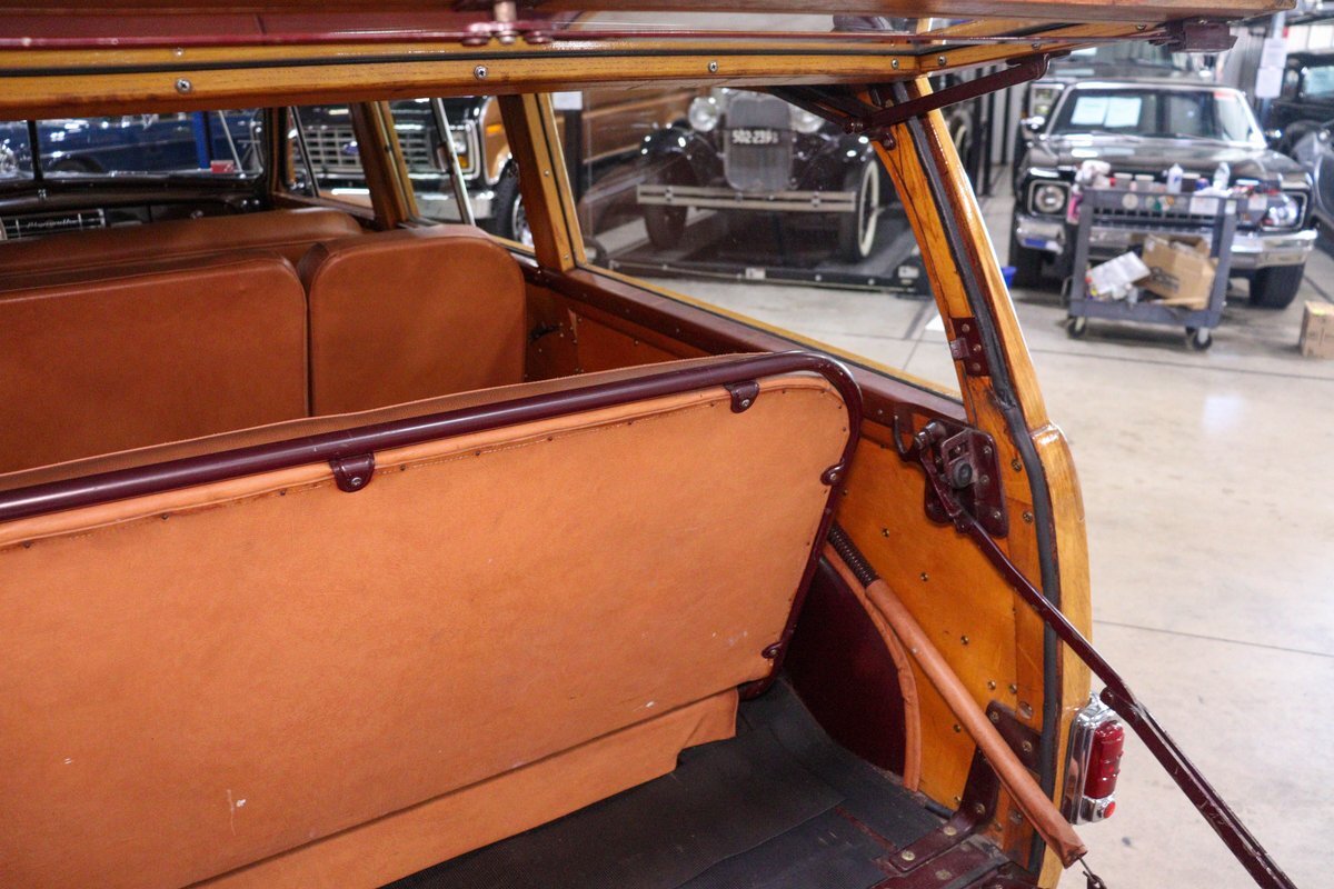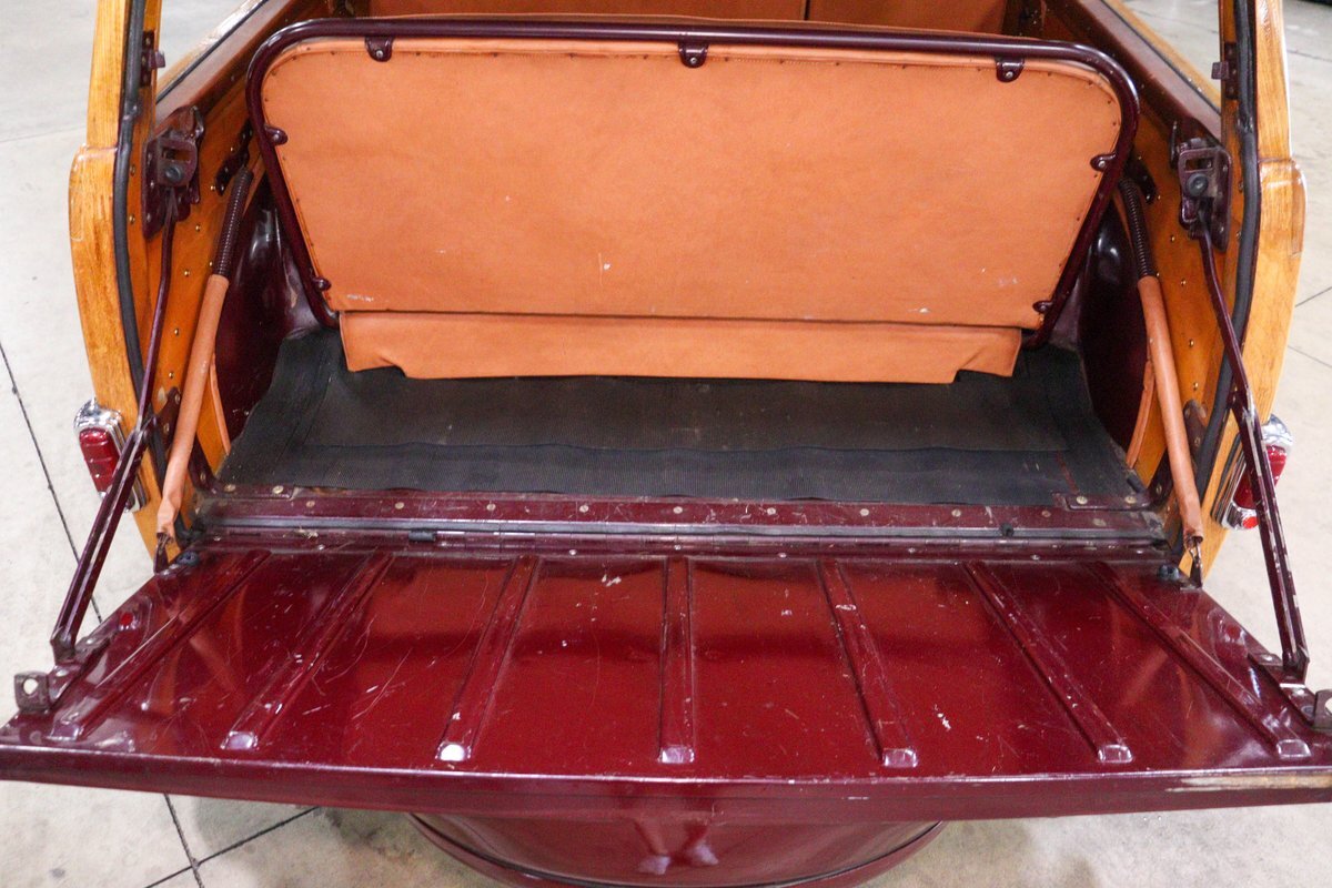 Few vehicles on the road today can capture attention like this Rio Maroon Woody Station Wagon. The deep, lustrous Rio Maroon paint is complemented by exceptional brightwork that gleams from the front bumper and grille to the rear of the vehicle. The wood paneling, a hallmark of the Woody Wagon, remains in excellent condition, with doors that open and close effortlessly without rubbing. The well-preserved wood accents, along with newer Coker white wall tires, contribute to the vehicle's striking and authentic exterior presentation.