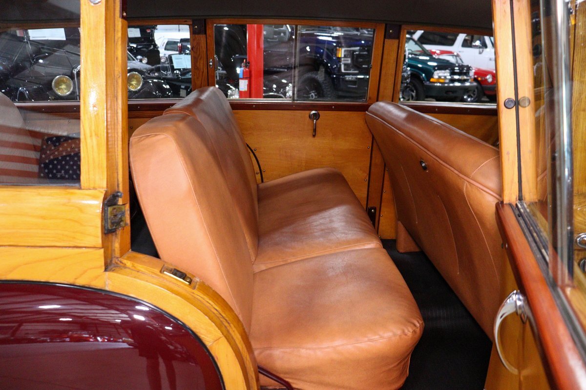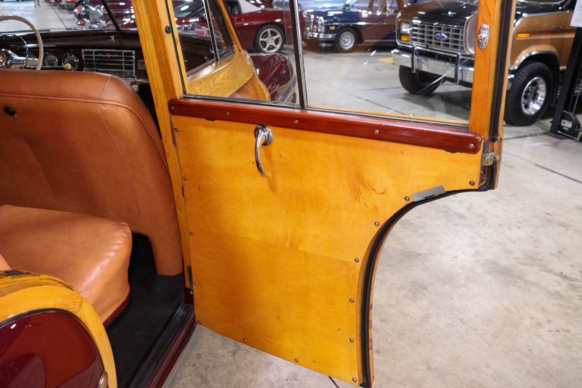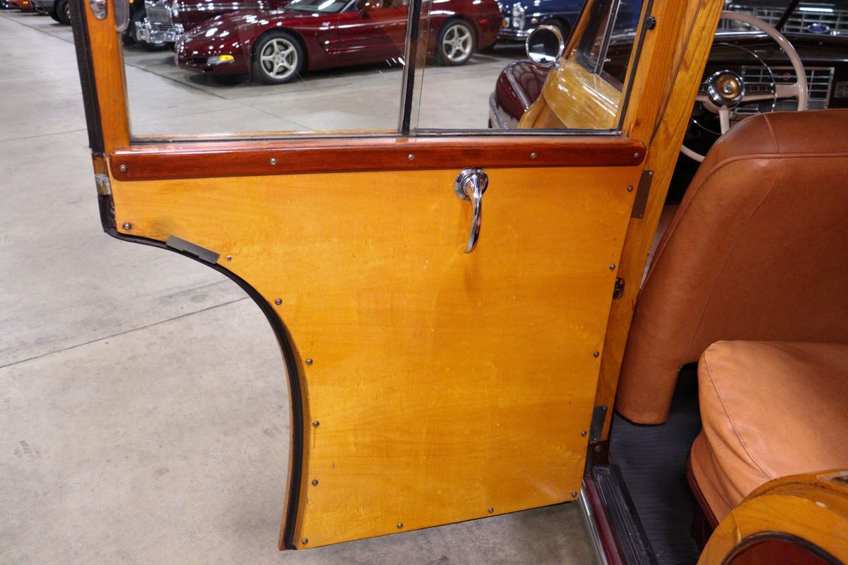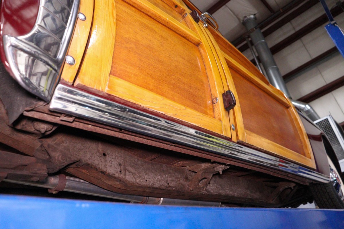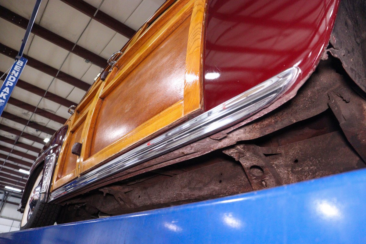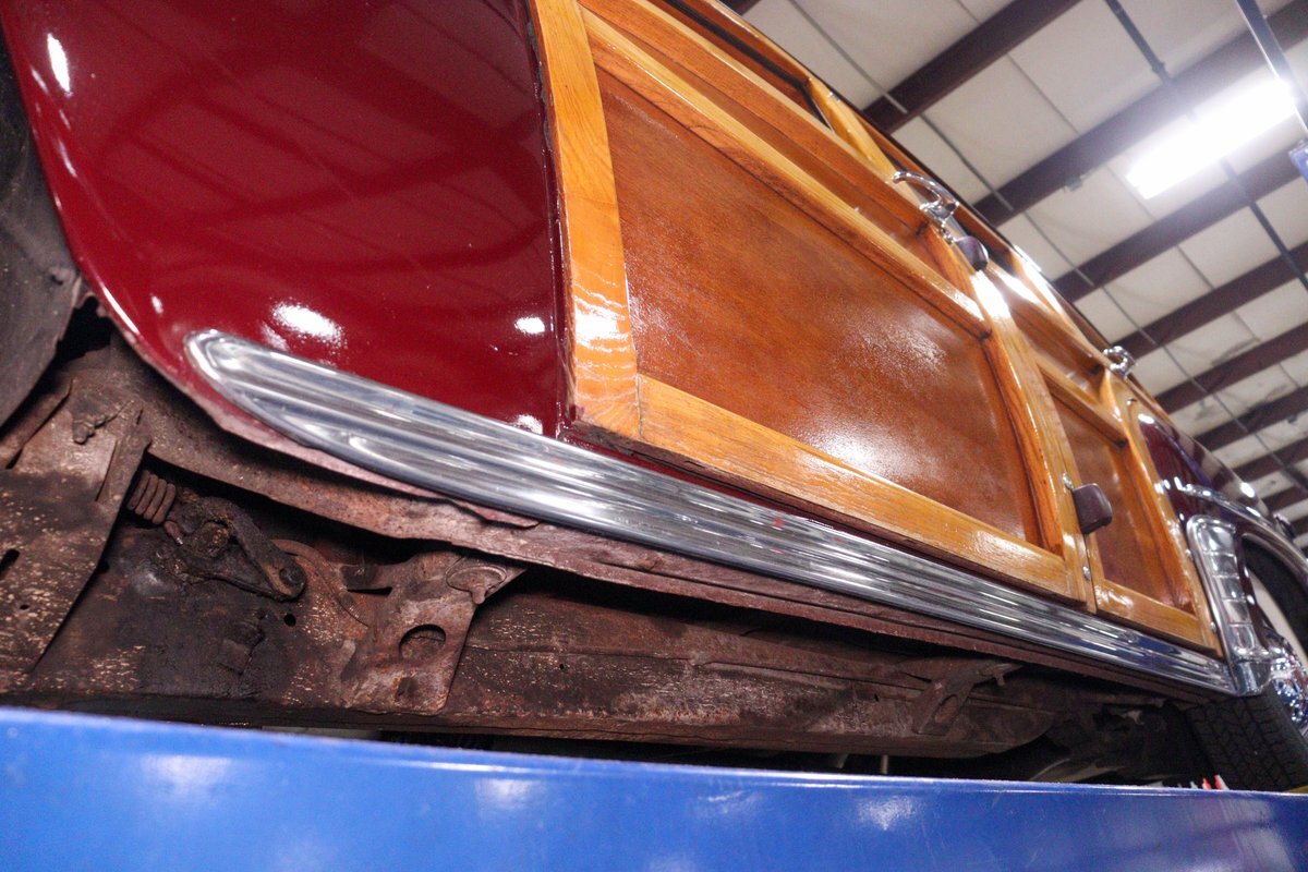 Few vehicles on the road today can capture attention like this Rio Maroon Woody Station Wagon. The deep, lustrous Rio Maroon paint is complemented by exceptional brightwork that gleams from the front bumper and grille to the rear of the vehicle. The wood paneling, a hallmark of the Woody Wagon, remains in excellent condition, with doors that open and close effortlessly without rubbing. The well-preserved wood accents, along with newer Coker white wall tires, contribute to the vehicle's striking and authentic exterior presentation.