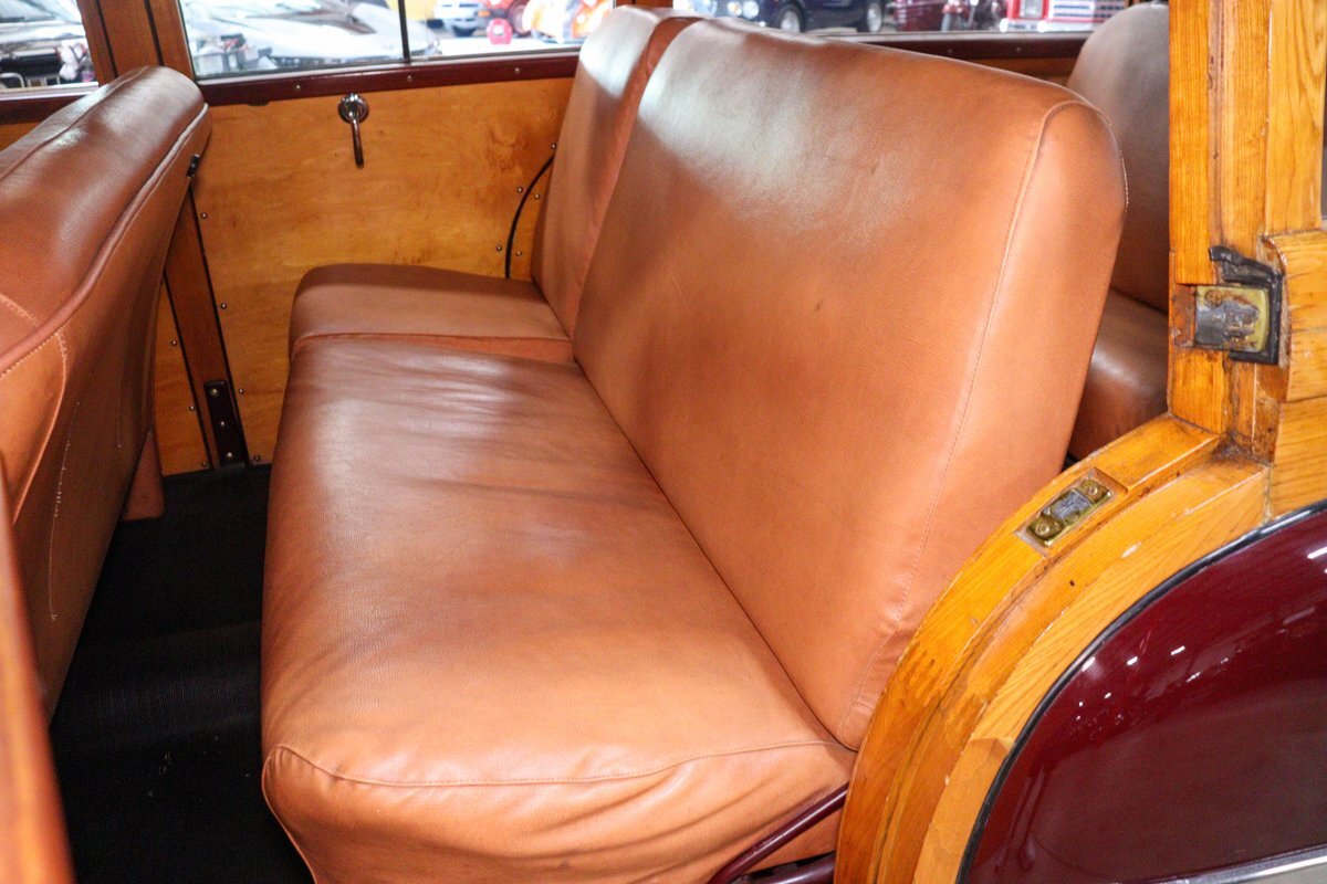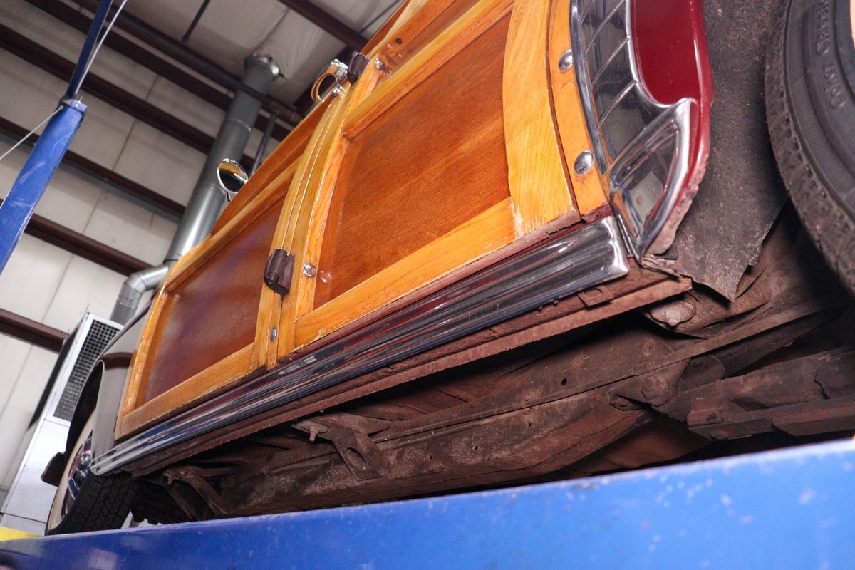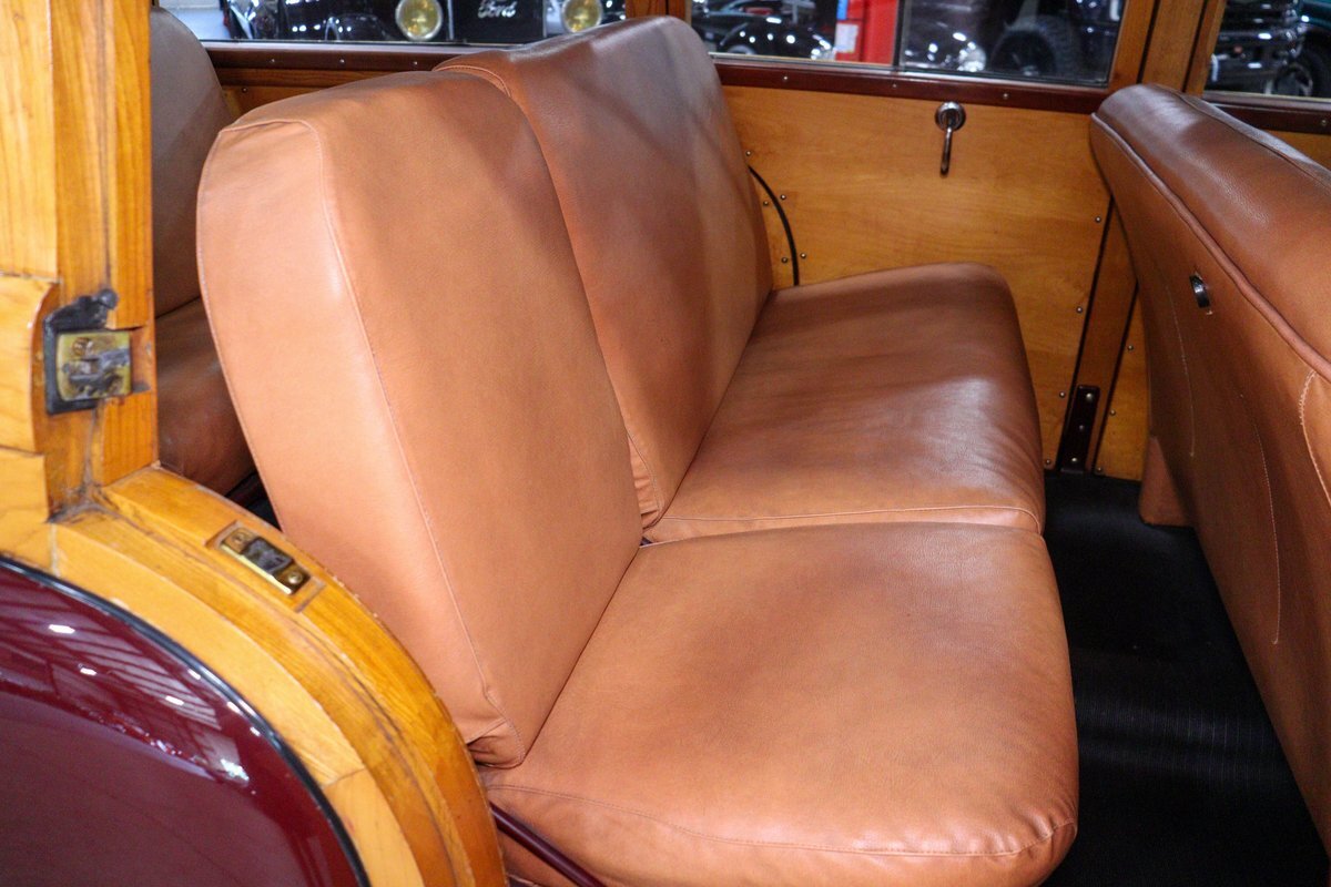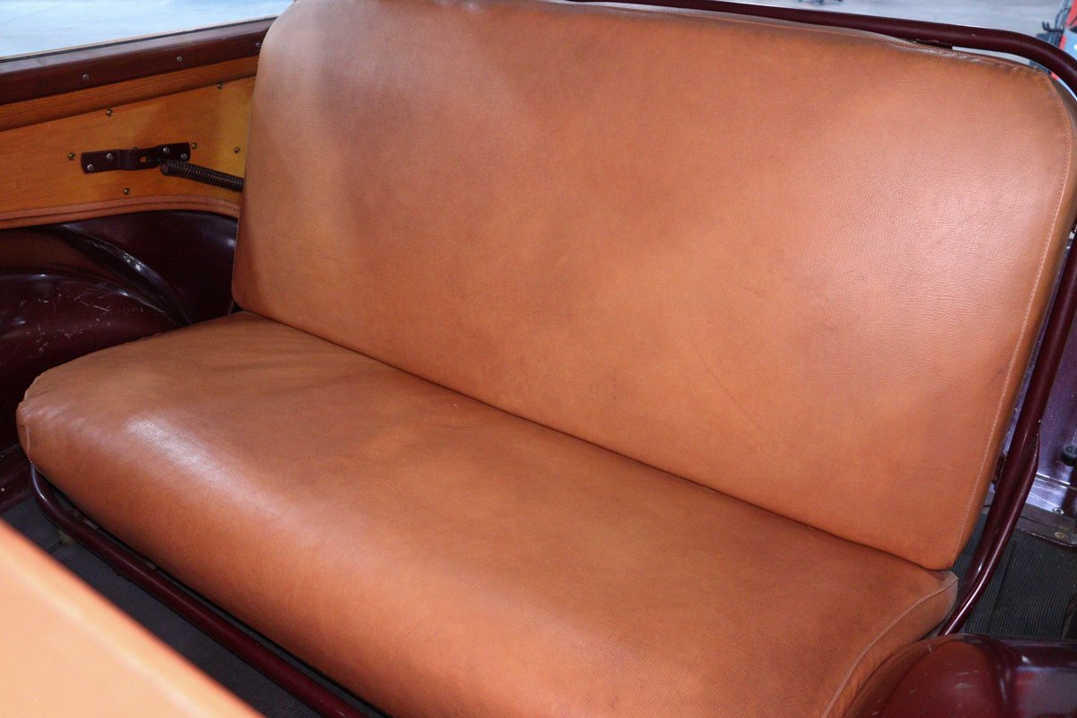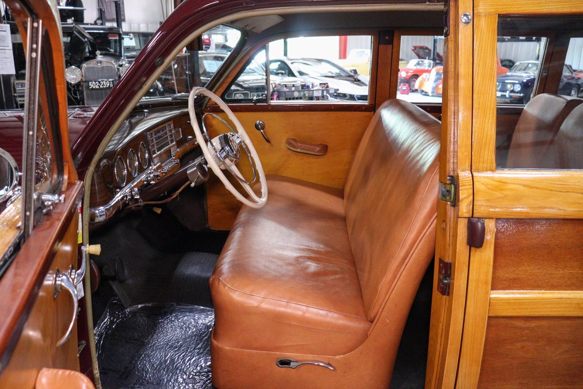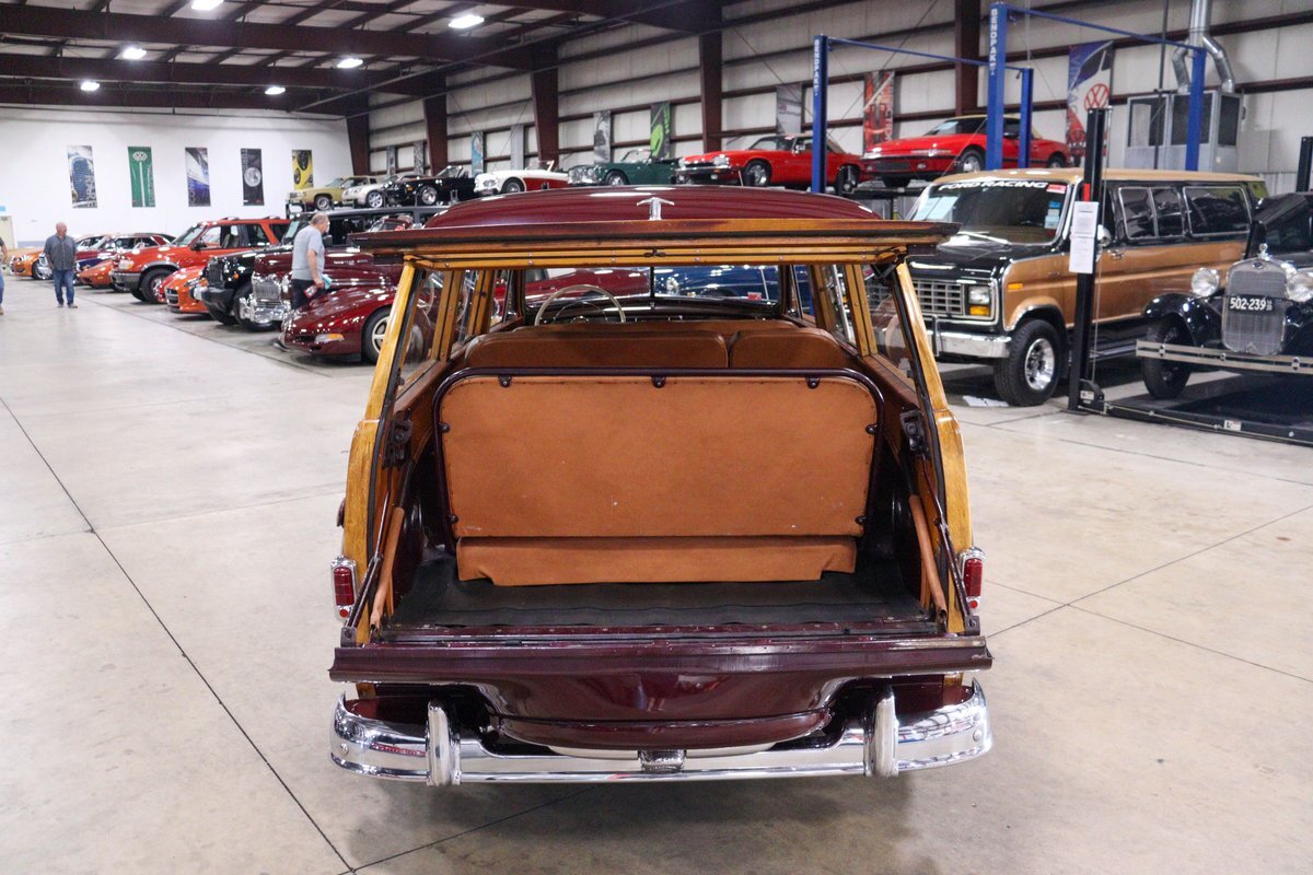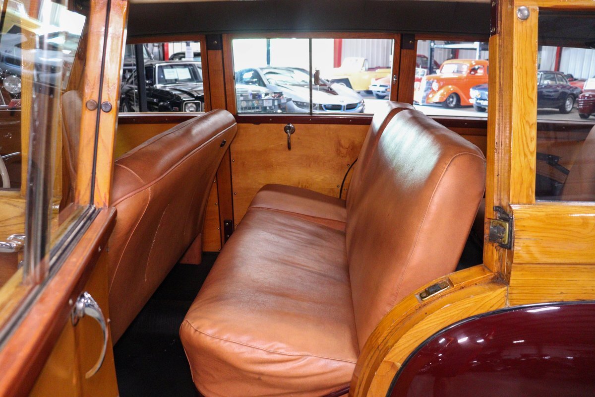 Few vehicles on the road today can capture attention like this Rio Maroon Woody Station Wagon. The deep, lustrous Rio Maroon paint is complemented by exceptional brightwork that gleams from the front bumper and grille to the rear of the vehicle. The wood paneling, a hallmark of the Woody Wagon, remains in excellent condition, with doors that open and close effortlessly without rubbing. The well-preserved wood accents, along with newer Coker white wall tires, contribute to the vehicle's striking and authentic exterior presentation.