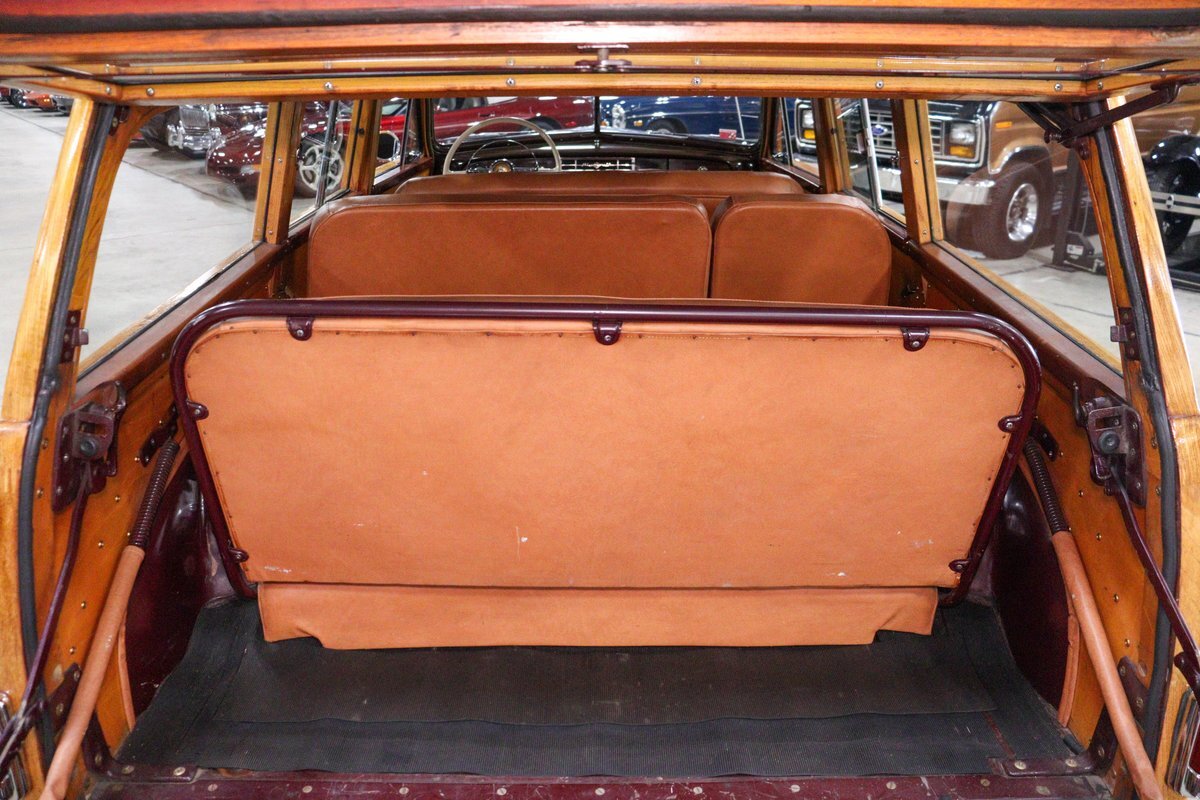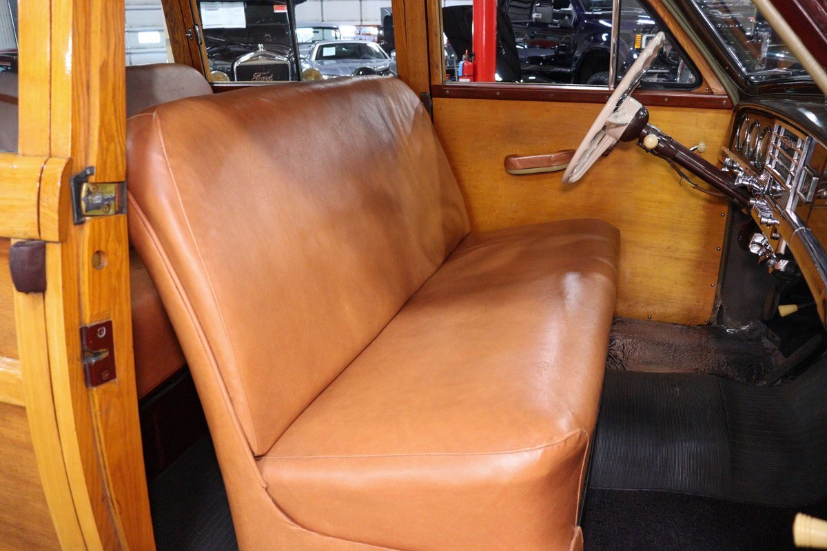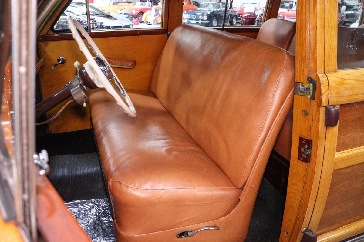 Inside, this Woody Wagon offers a spacious three-row seating arrangement, perfect for family outings or cruising with friends. Unique period-correct features are present, including a functional original AM radio, factory heater, and a heavy-duty air cleaner, enhancing the vehicle's nostalgic charm. The interior layout provides ample space and comfort, ensuring a pleasurable ride for all occupants.