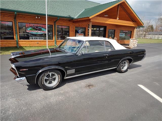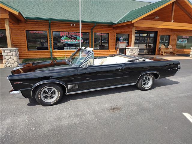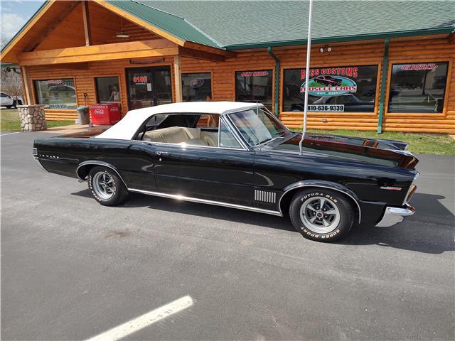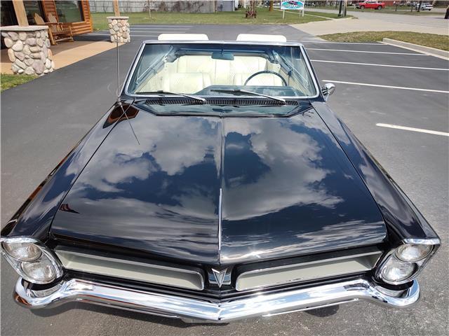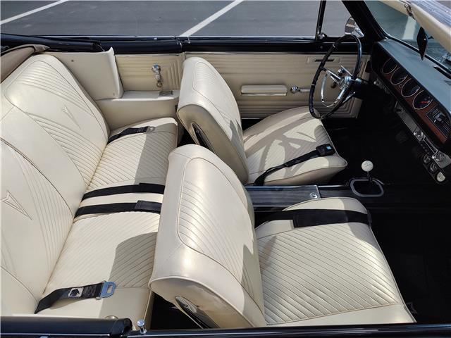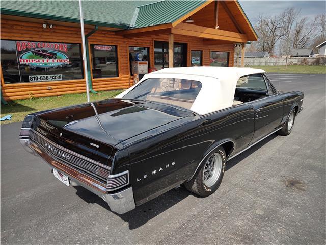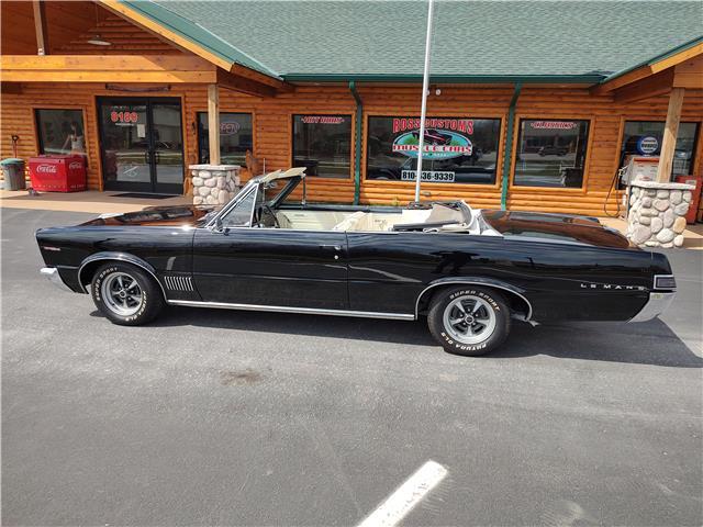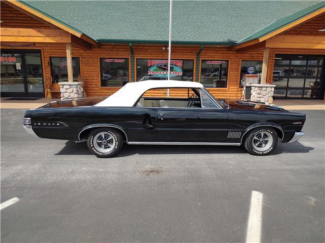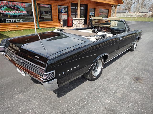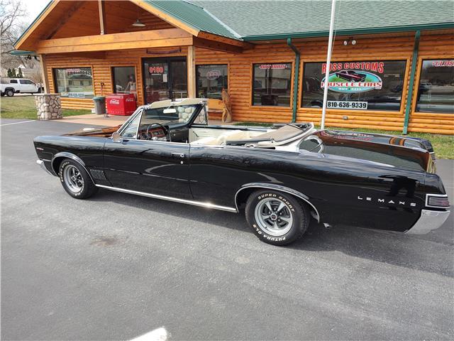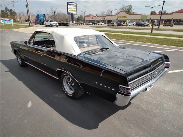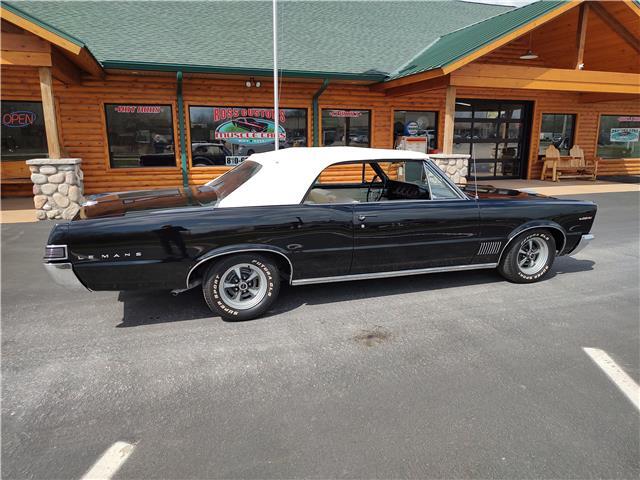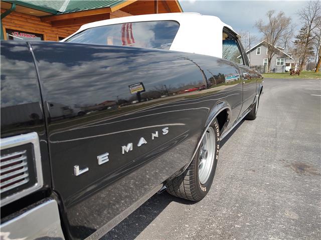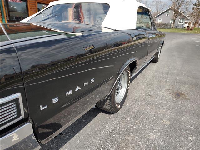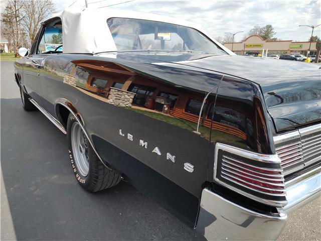 This is a very nice, clean, original panel 65 LeMans convertible, done in "Slick" Tuxedo Black, basecoat clearcoat, sanded and wheeled smooth, at time of restoration had new white power convertible top in excellent condition, also at time of restoration had new tinted windshield; all other glass is original factory softray tint in excellent condition, plastic rear window with no yellowing, all window stainless and upper door stainless is original in excellent condition, new weather stripping and window felts, new side view mirror, new door handles, original grills in excellent condition, original headlight bezels in very good condition, re-chromed front bumper, original wheel well and rocker moldings in excellent condition, new emblems, taillights and tail panel applique in good condition, original rear bumper in very good condition.