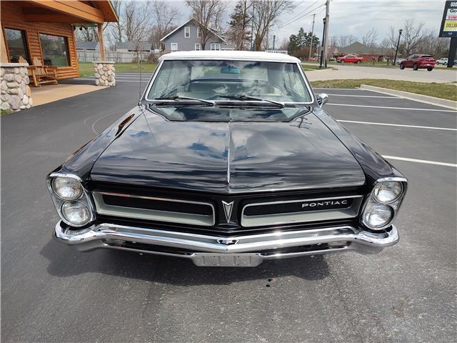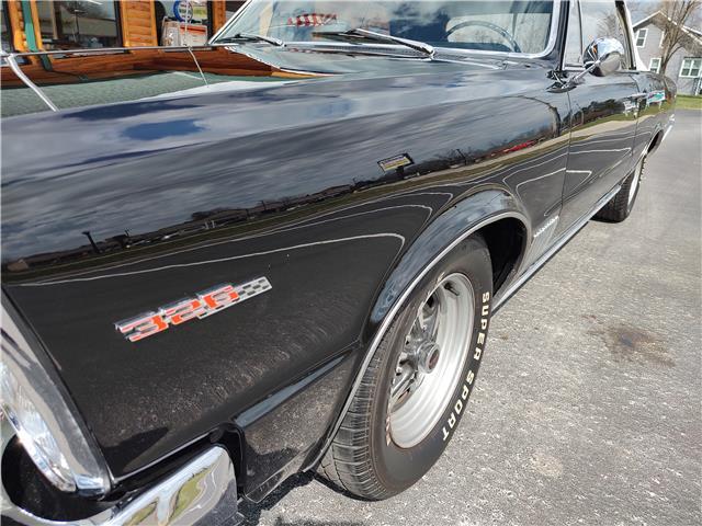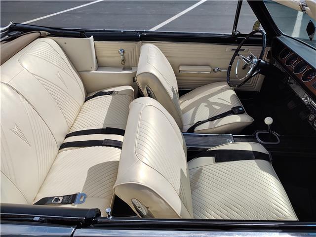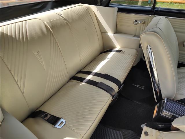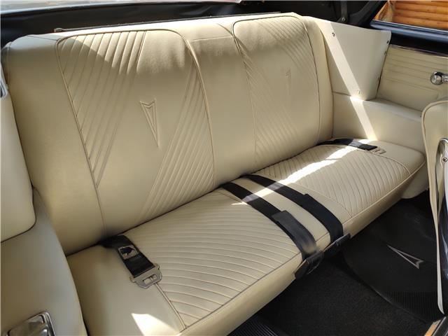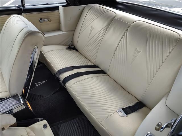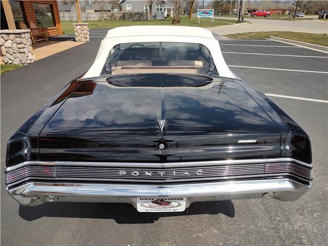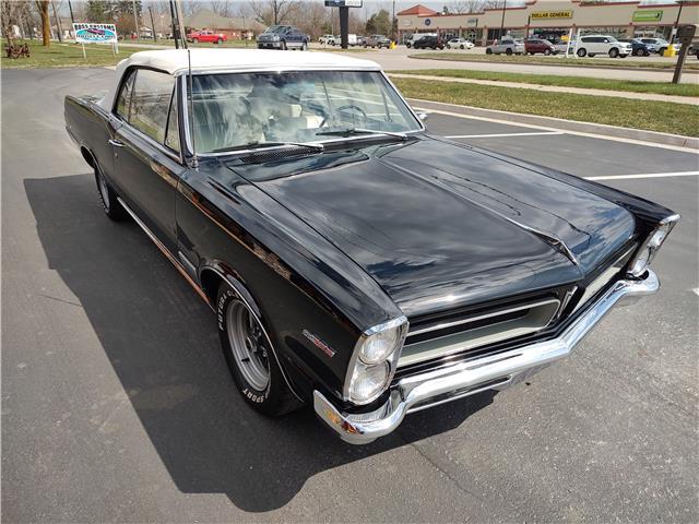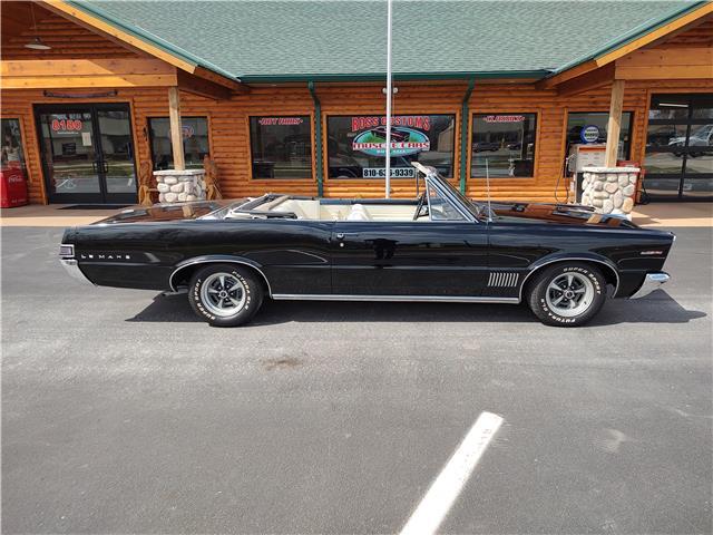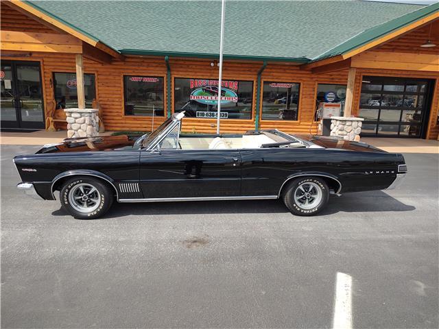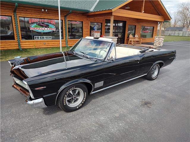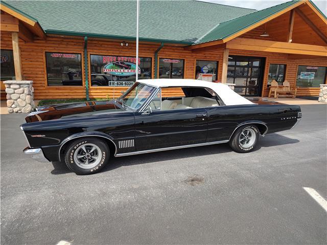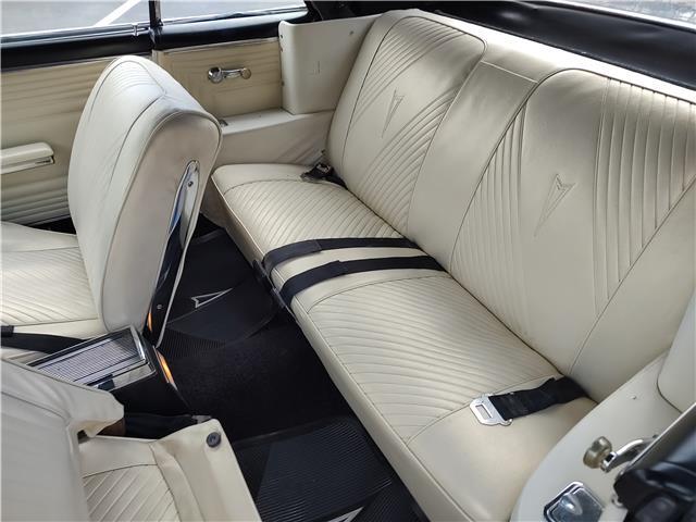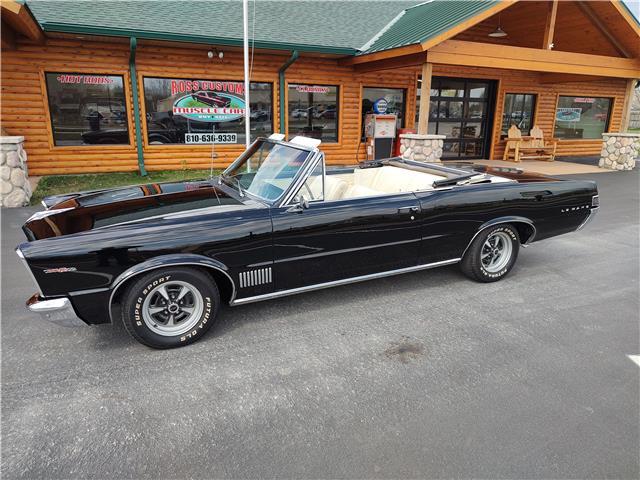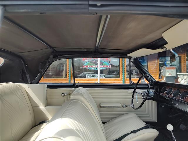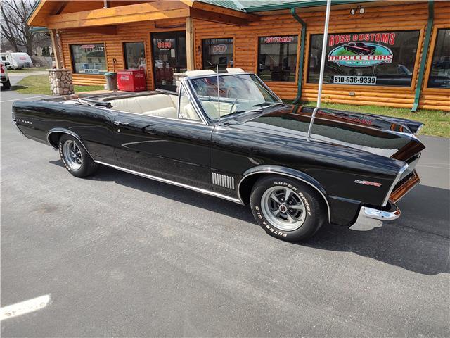 This is a very nice, clean, original panel 65 LeMans convertible, done in "Slick" Tuxedo Black, basecoat clearcoat, sanded and wheeled smooth, at time of restoration had new white power convertible top in excellent condition, also at time of restoration had new tinted windshield; all other glass is original factory softray tint in excellent condition, plastic rear window with no yellowing, all window stainless and upper door stainless is original in excellent condition, new weather stripping and window felts, new side view mirror, new door handles, original grills in excellent condition, original headlight bezels in very good condition, re-chromed front bumper, original wheel well and rocker moldings in excellent condition, new emblems, taillights and tail panel applique in good condition, original rear bumper in very good condition.