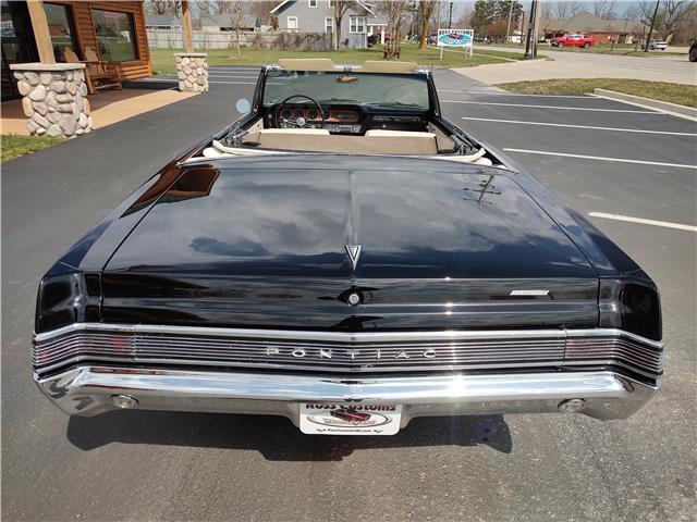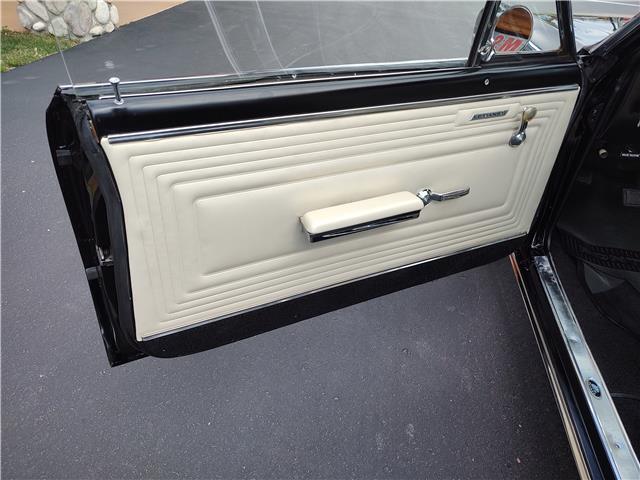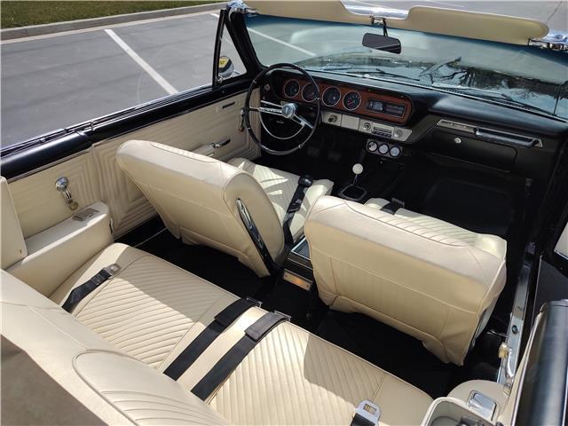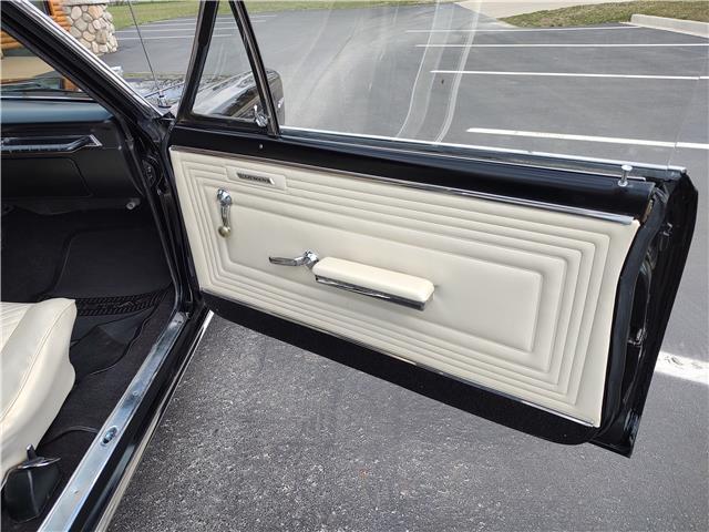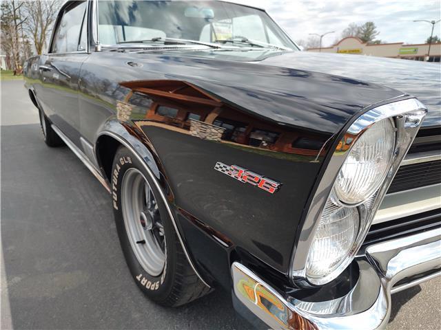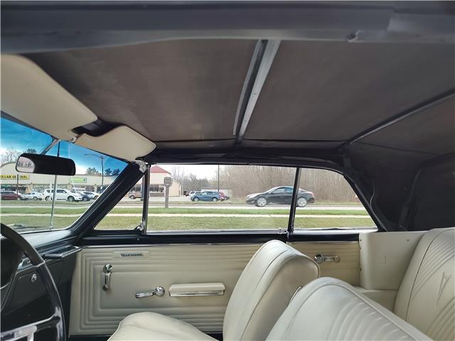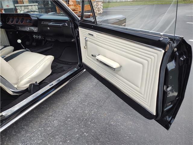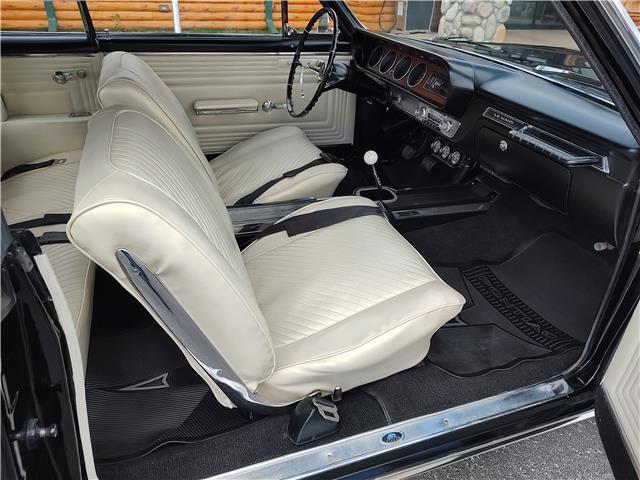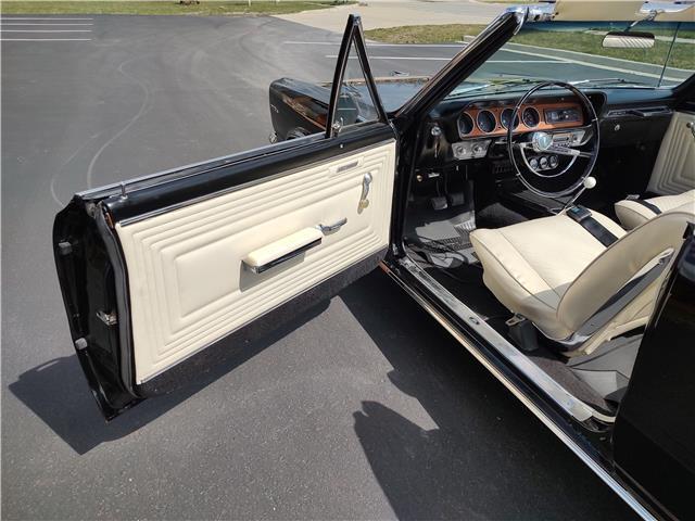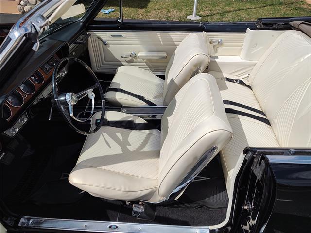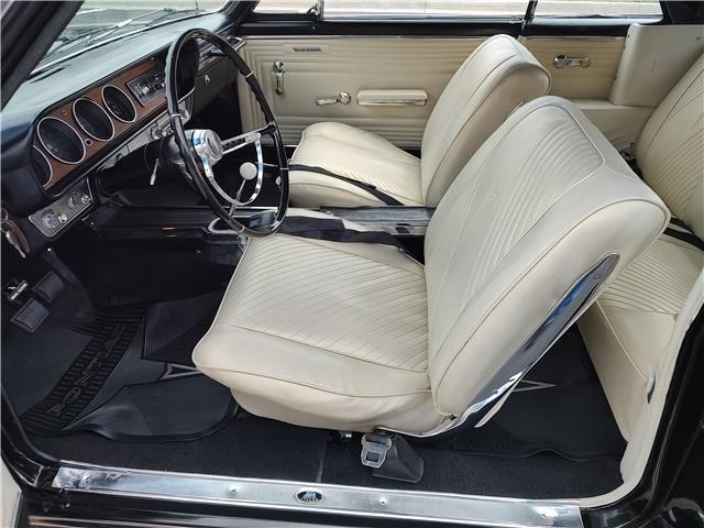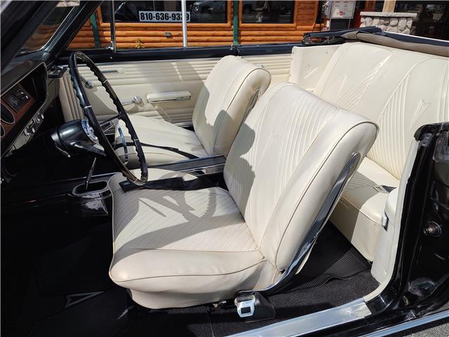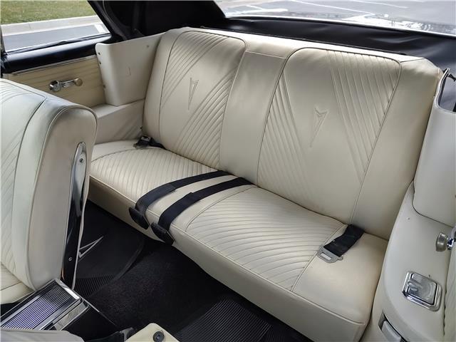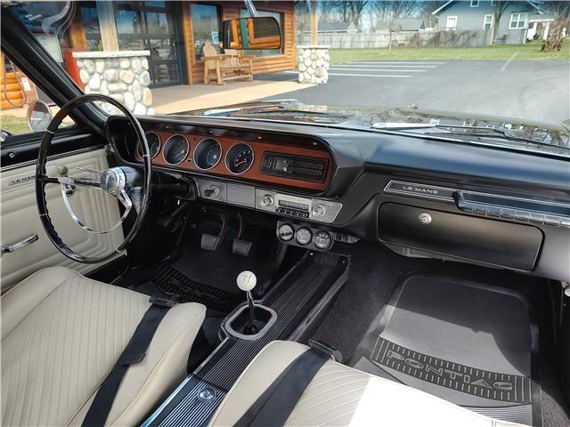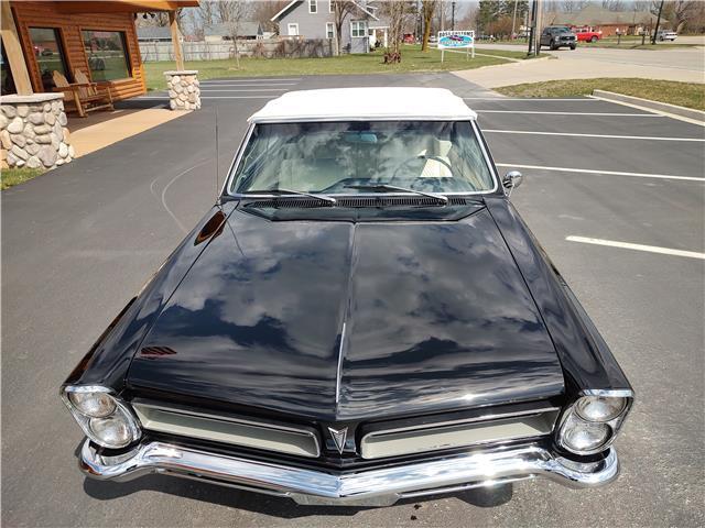 This is a very nice, clean, original panel 65 LeMans convertible, done in "Slick" Tuxedo Black, basecoat clearcoat, sanded and wheeled smooth, at time of restoration had new white power convertible top in excellent condition, also at time of restoration had new tinted windshield; all other glass is original factory softray tint in excellent condition, plastic rear window with no yellowing, all window stainless and upper door stainless is original in excellent condition, new weather stripping and window felts, new side view mirror, new door handles, original grills in excellent condition, original headlight bezels in very good condition, re-chromed front bumper, original wheel well and rocker moldings in excellent condition, new emblems, taillights and tail panel applique in good condition, original rear bumper in very good condition.