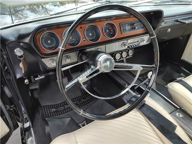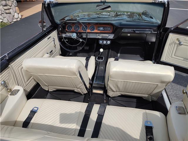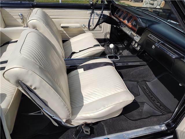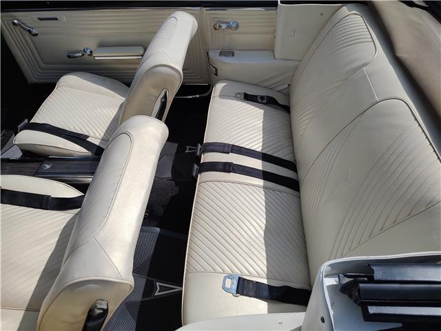 Factory parchment bucket seat console interior, dash has been refinished, original instrument cluster with factory in dash tach in very good condition, wood grain has been replaced, factory optional passenger grab handle, original AM radio - which still works, trio of gauges nicely mounted under dash, original deluxe steering wheel in excellent condition, new front door panels, arm rest and bases, rear door panels and arm rest are original in good condition; passenger side has a tare and wrinkles, new front and rear seat covers, updated front and rear seat belts, original 4 speed center console in good condition, new carpet and deluxe floor mats, new sill plates.