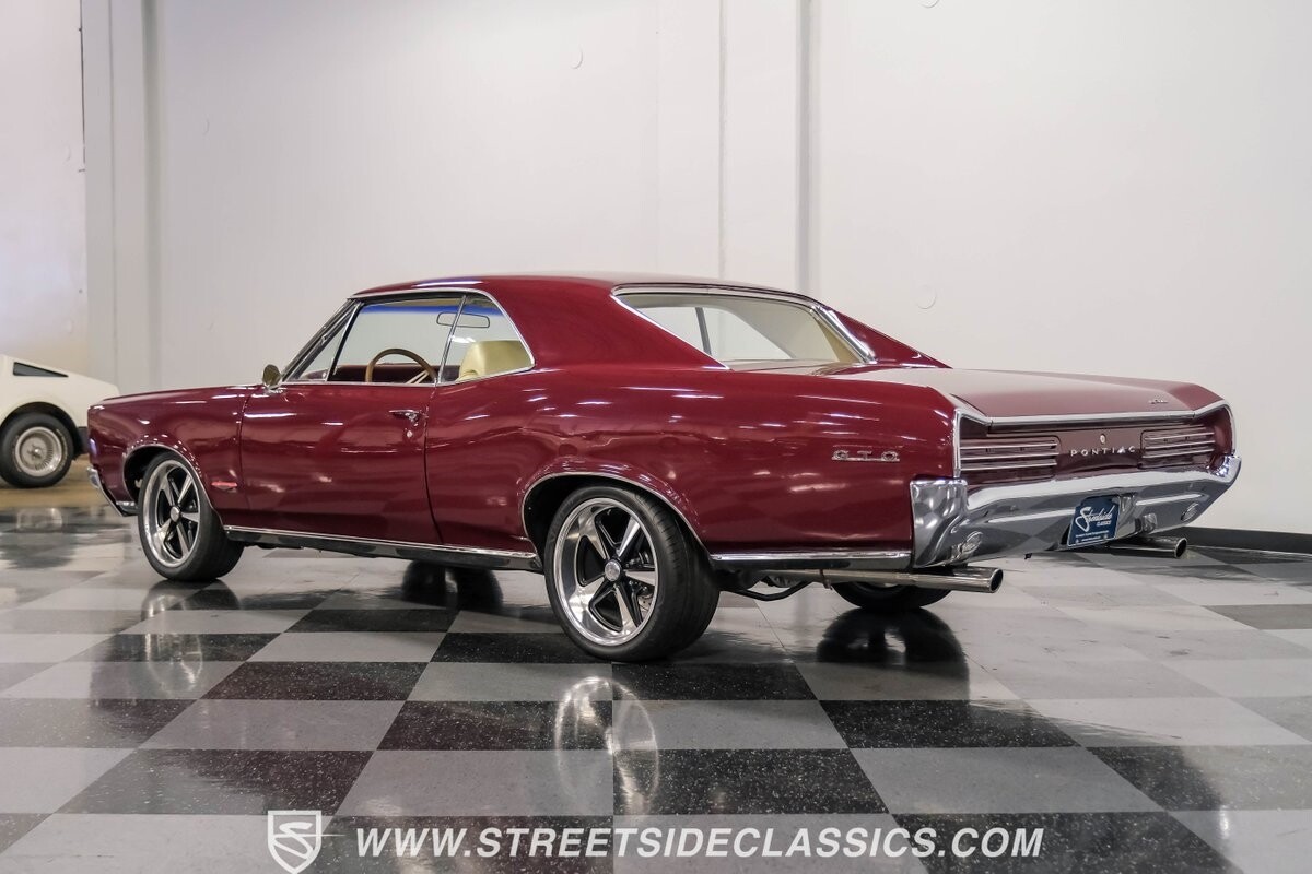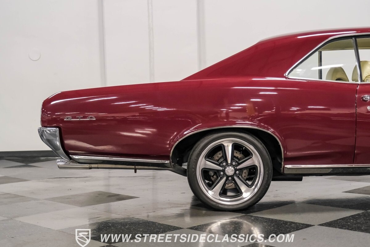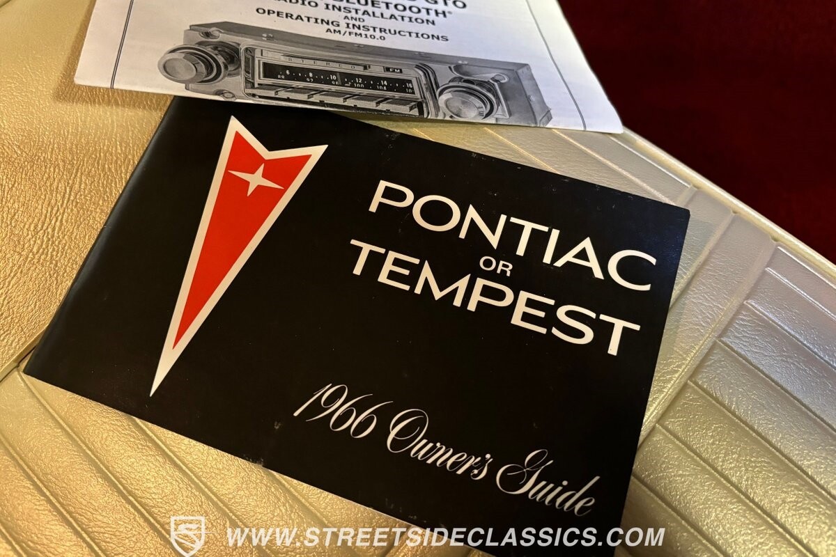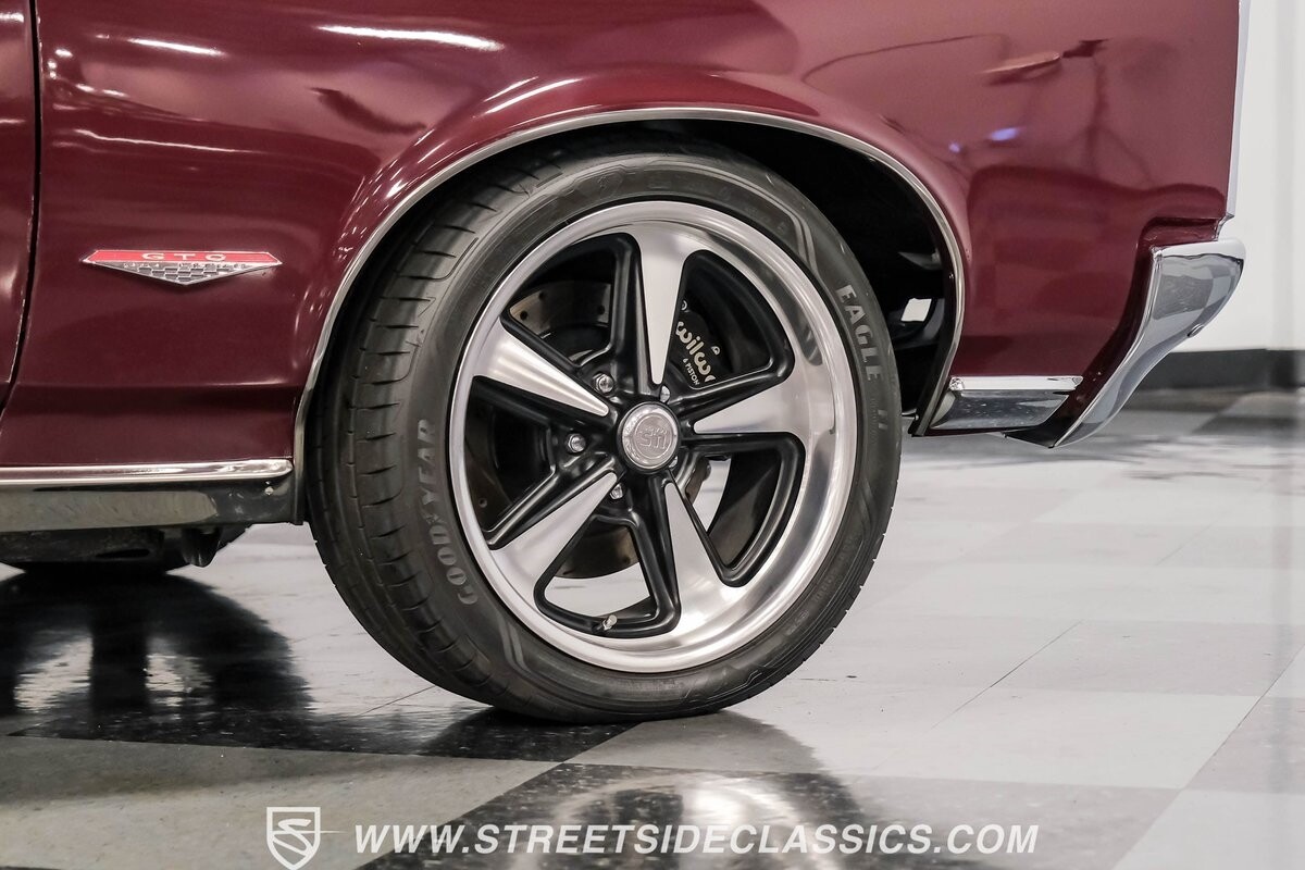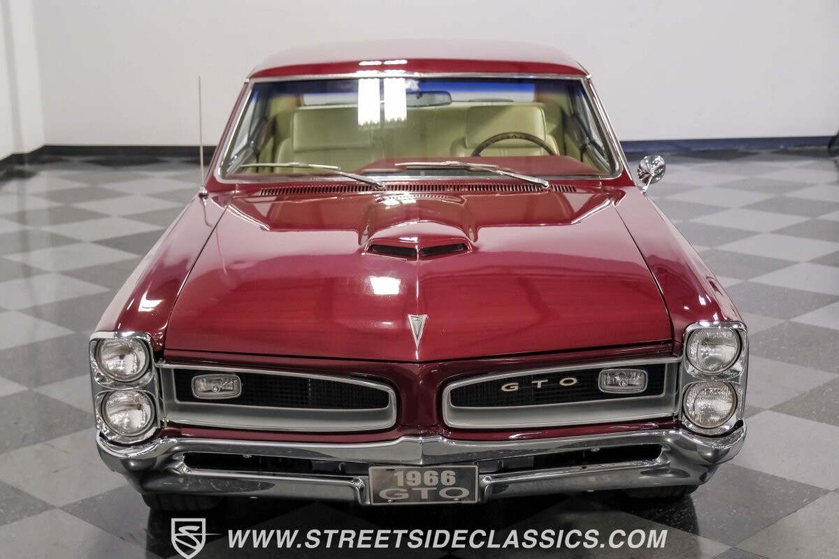 The Pontiac GTO was the original muscle car. Introduced in 1964, the GTO was restyled for 1966, which featured a sleek and aggressive body that showcased Pontiac's "Coke Bottle" styling that looks as exciting now as when it was new. This exceptional 1966 Pontiac GTO is finished strikingly in is original color, Burgundy (code N - as indicated on its trim tag). The rich Burgundy color highlights this GTO's dramatic styling that features louvered taillights, Pontiac's famous split grill and iconic hood scoop. The muscle car look is enhanced by a set of 18-inch US Mags that cleverly resemble the original Pontiac Rally ll wheels wrapped with Goodyear Eagle FI performance tires staggered 245/45R18 front and 265/35R18 rear that fill in the fender wells and create just the right stance for this classic GTO.