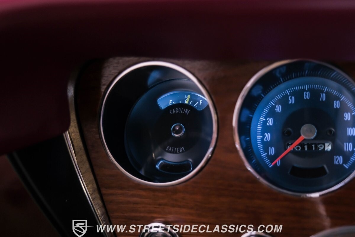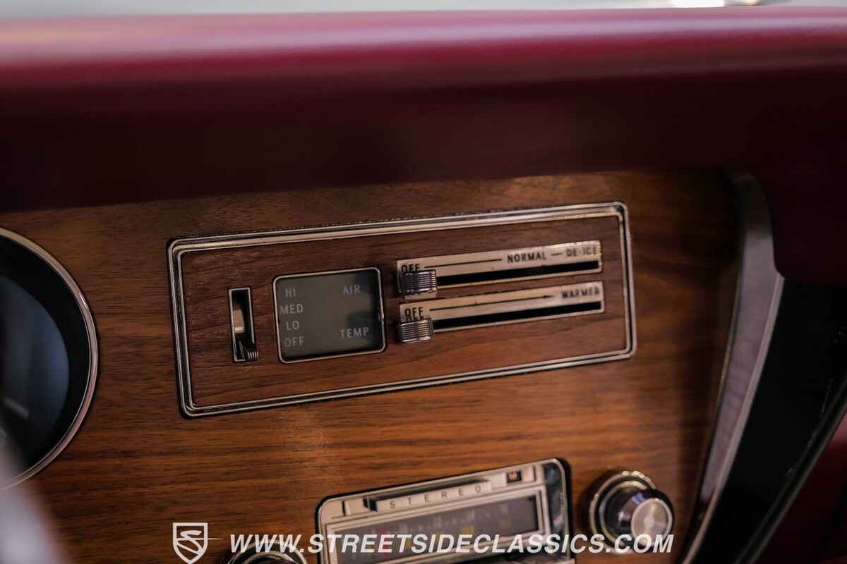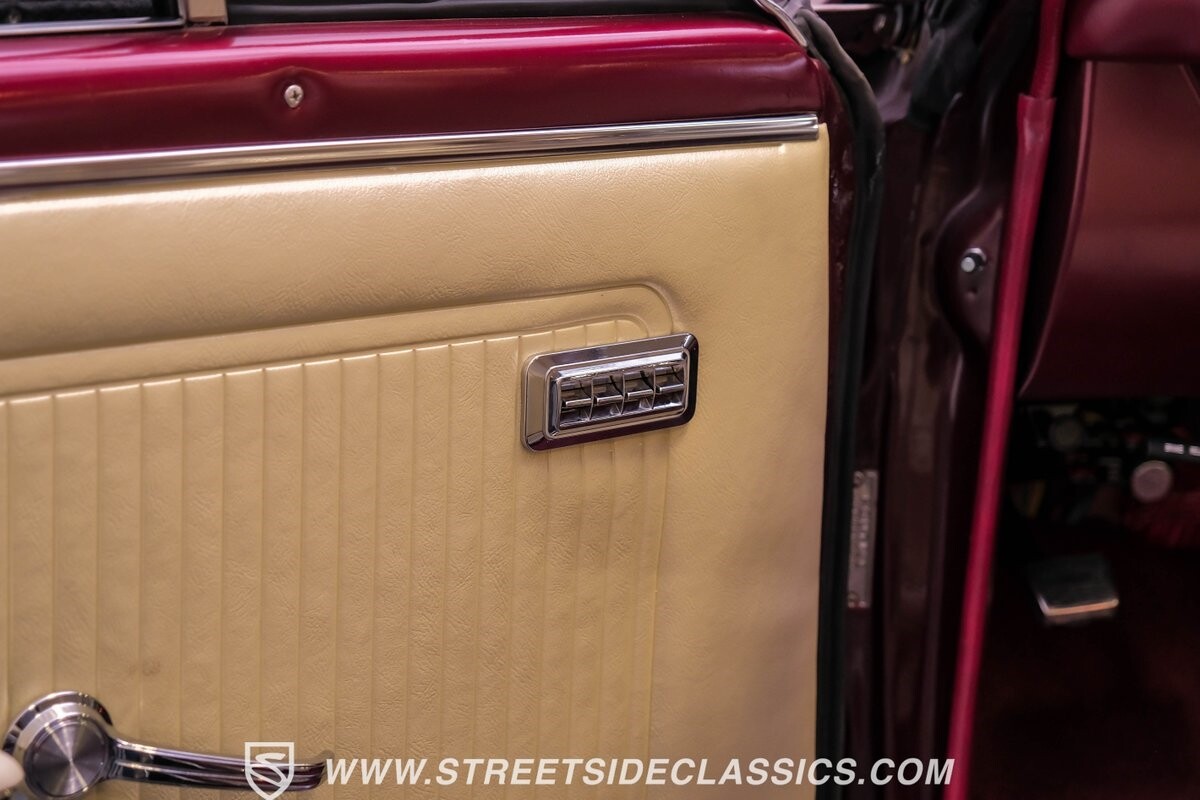 The interior has been completely restored with correct style Parchment upholstery with contrasting Burgundy dash, carpets and seatbelts. The factory bucket seats have the very rare headrest option. Other interior highlights include power windows, optional factory console with floor shifter, tilt steering column, upgraded wood-rimmed steering wheel, factory tachometer and gauge package with beautiful blue LED backlighting and a retro-style AM/FM/Bluetooth radio that at a glance looks just like a factory AM/FM radio.
