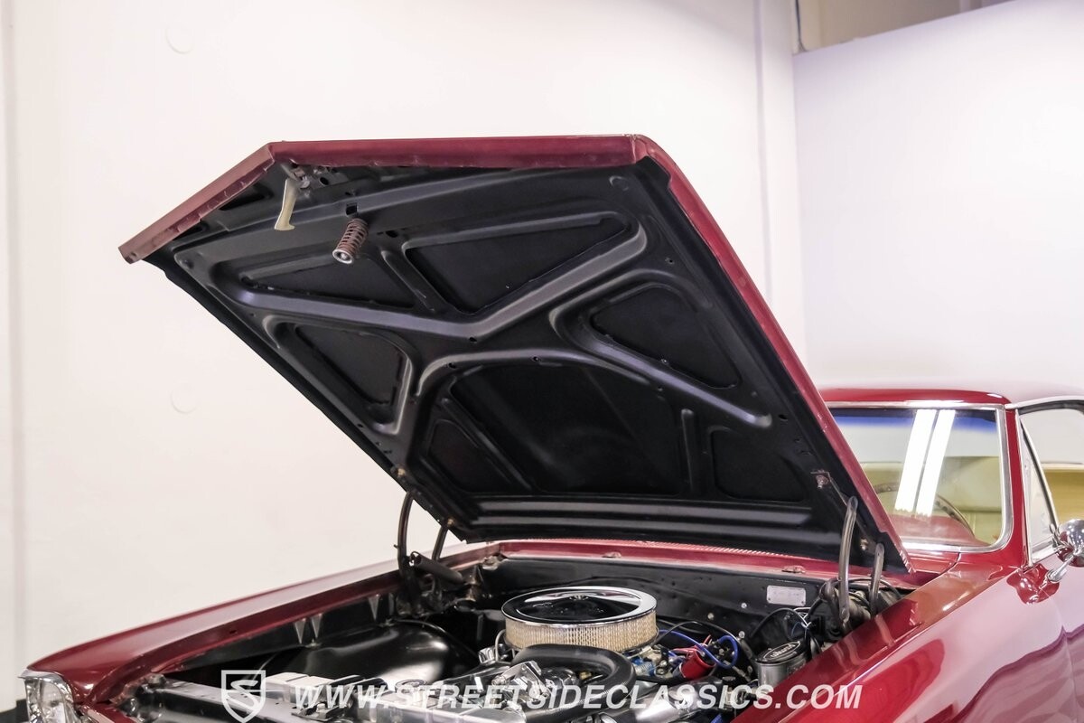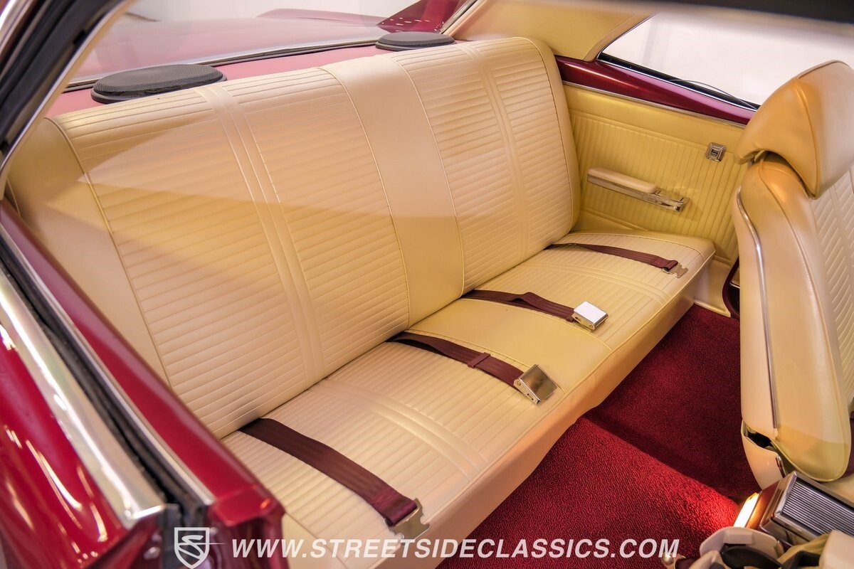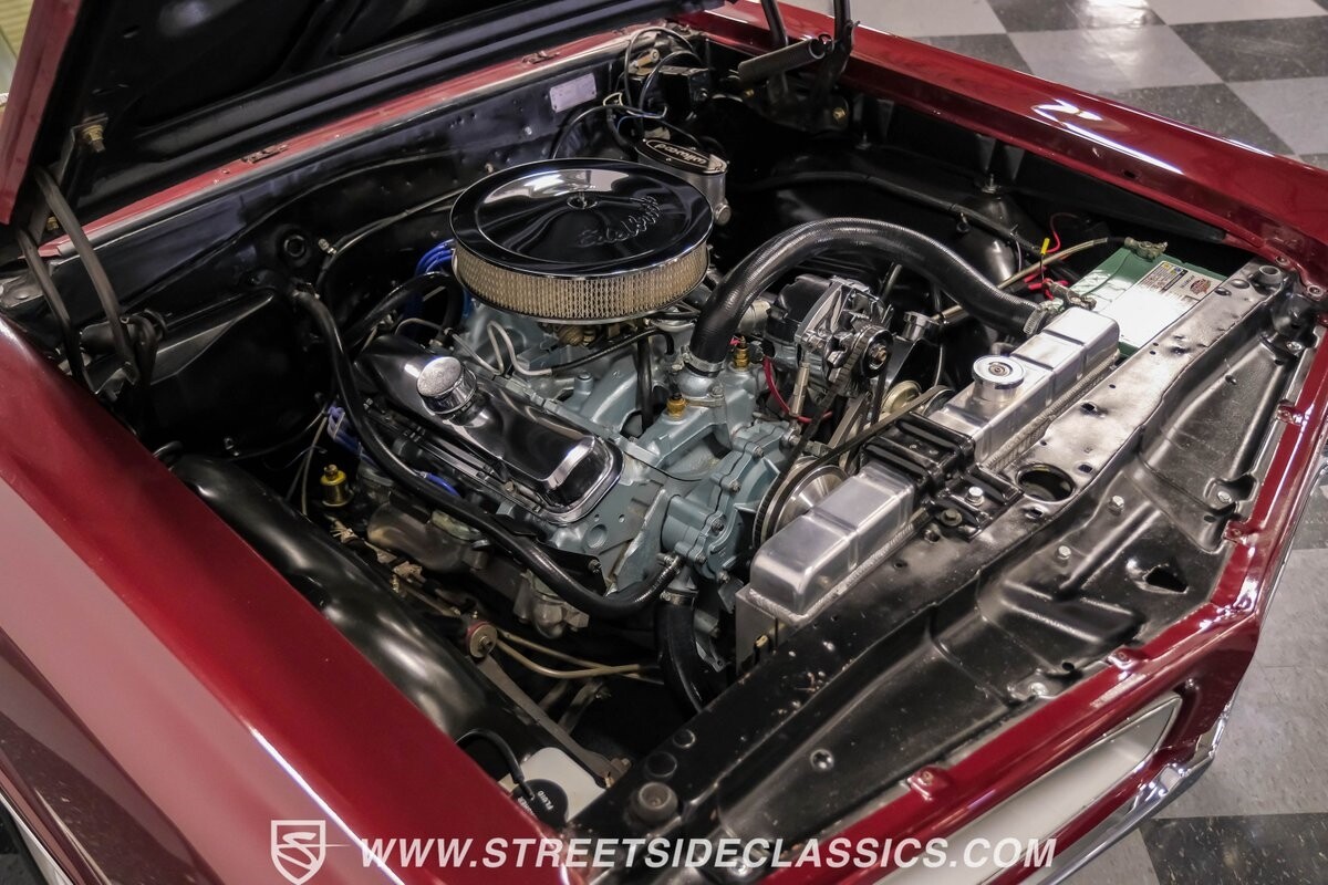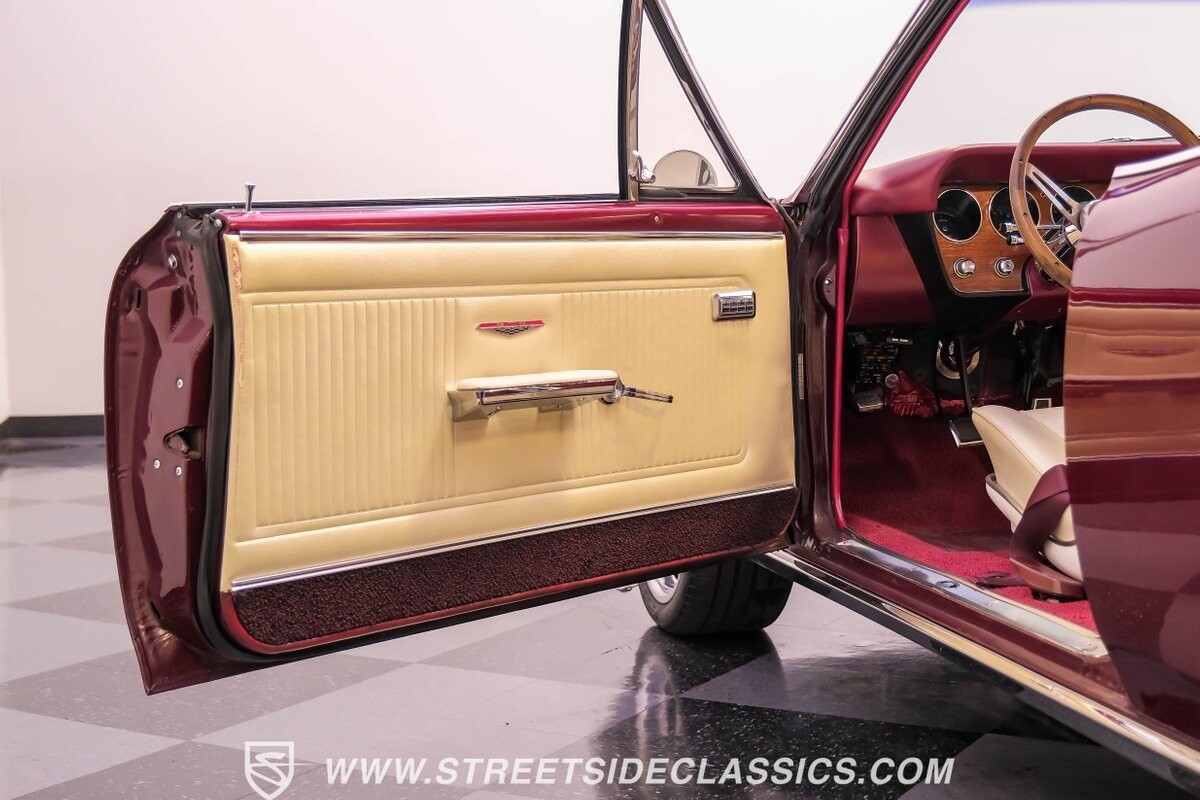 The interior has been completely restored with correct style Parchment upholstery with contrasting Burgundy dash, carpets and seatbelts. The factory bucket seats have the very rare headrest option. Other interior highlights include power windows, optional factory console with floor shifter, tilt steering column, upgraded wood-rimmed steering wheel, factory tachometer and gauge package with beautiful blue LED backlighting and a retro-style AM/FM/Bluetooth radio that at a glance looks just like a factory AM/FM radio.