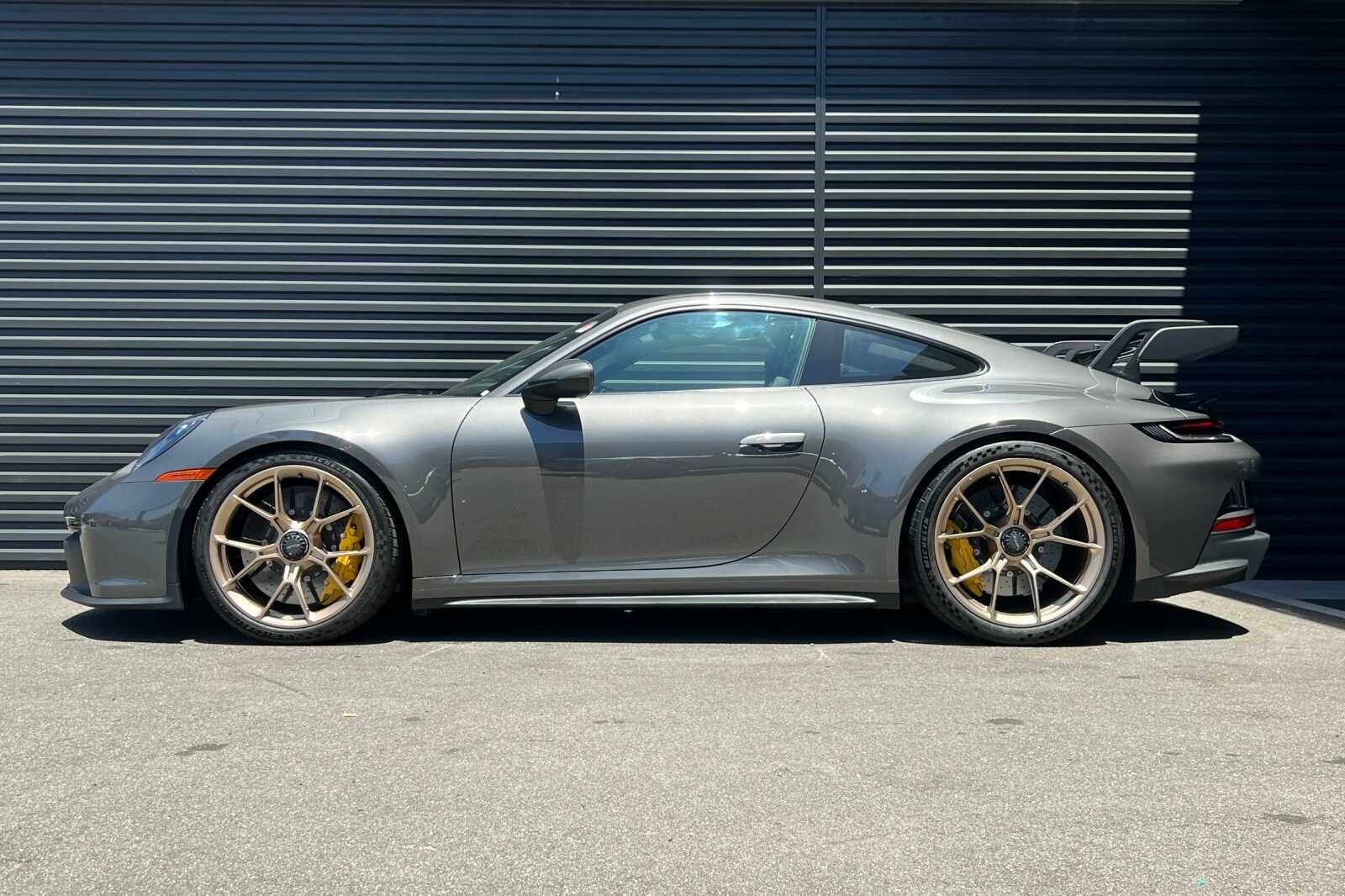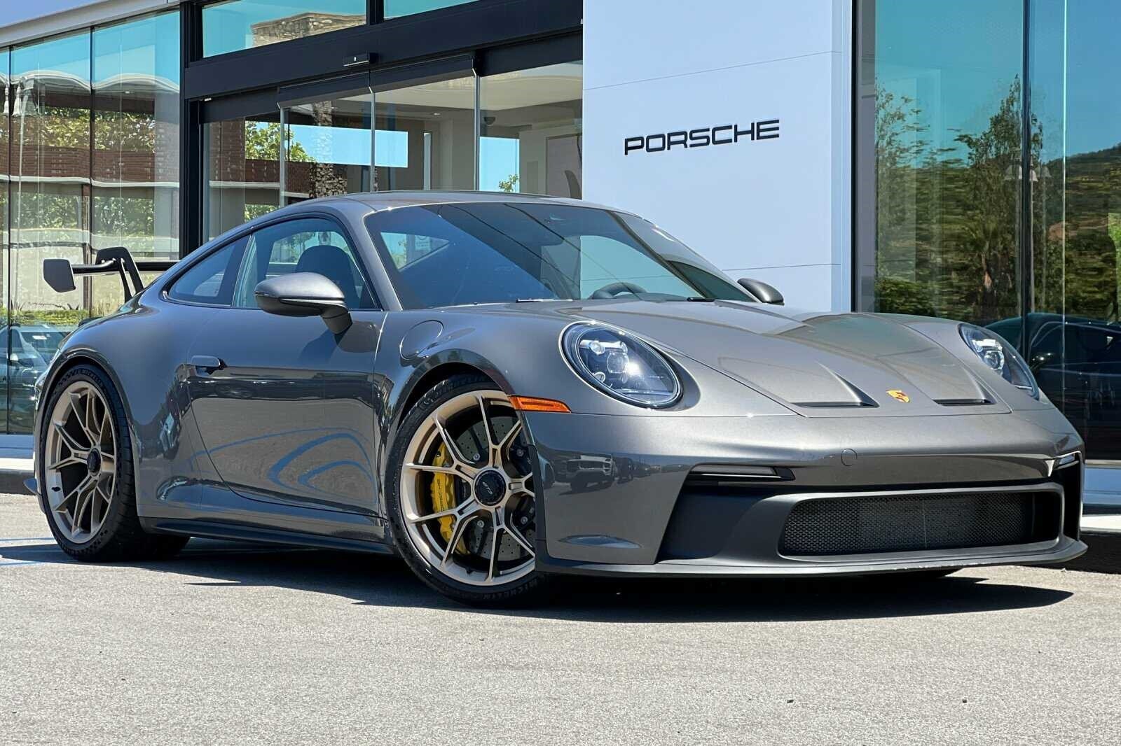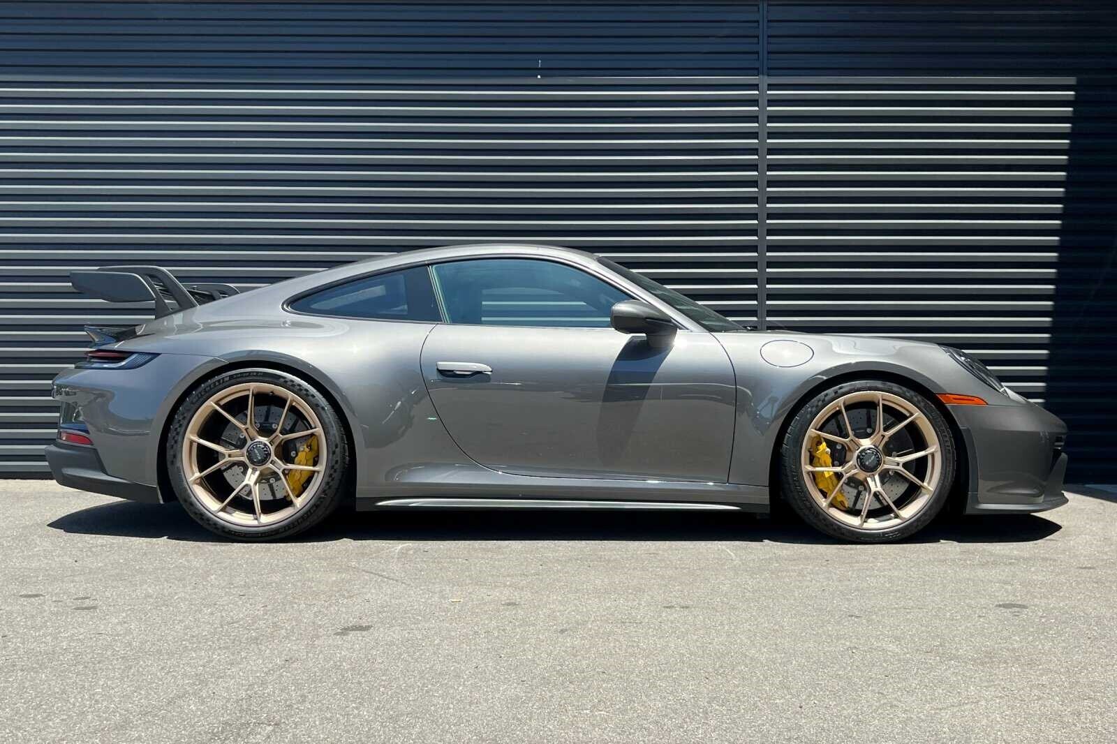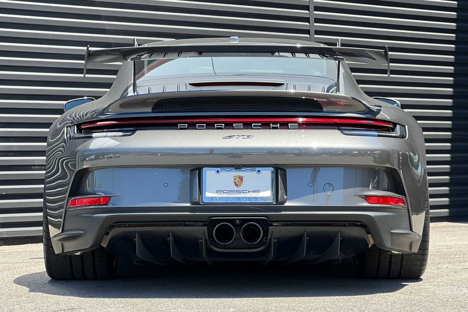 This Porsche San Luis Obispo 2022 Agate Grey Metallic Porsche 911 GT3 RWD is well equipped and includes these features and benefits: Chrono Package w/Preparation for Lap Trigger, Porsche Approved Certified Pre-Owned Certified, BOSE Surround Sound System, Front Axle Lift System, Porsche Ceramic Composite Brakes (PCCB) in Yellow, 4-Way Sport Seats Plus, 4-Wheel Disc Brakes, 8 Speakers, ABS brakes, Adaptive suspension, Air Conditioning, Alloy wheels, Automatic temperature control, Brake assist, Bumpers: body-color, Delay-off headlights, Driver door bin, Driver vanity mirror, Dual front impact airbags, Dual front side impact airbags, Electronic Stability Control, Exterior Parking Camera Rear, Four wheel independent suspension, Front anti-roll bar, Front Bucket Seats, Front Center Armrest, Front dual zone A/C, Front reading lights, Fully automatic headlights, Garage door transmitter: HomeLink, Heated door mirrors, Heated front seats, Illuminated entry, Low tire pressure warning, Navigation system: Porsche Communication Management (PCM), Occupant sensing airbag, Outside temperature display, Overhead airbag, Overhead console, Passenger door bin, Passenger vanity mirror, Porsche Communication Management, Power door mirrors, Power driver seat, Power passenger seat, Power steering, Power windows, Radio data system, Rear anti-roll bar, Rear fog lights, Rear window defroster, Remote keyless entry, Security system, Speed control, Speed-sensing steering, Spoiler, Sport steering wheel, Steering wheel mounted audio controls, Tachometer, Telescoping steering wheel, Tilt steering wheel, Traction control, Trip computer, Variably intermittent wipers, and Wheels: 20 Front/21 Rear 911 GT3. BOSE Surround Sound System, Chrono Package w/Preparation for Lap Trigger, Front Axle Lift System, Porsche Ceramic Composite Brakes (PCCB) in Yellow.