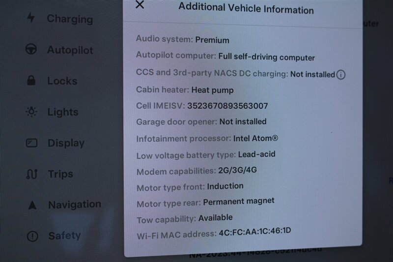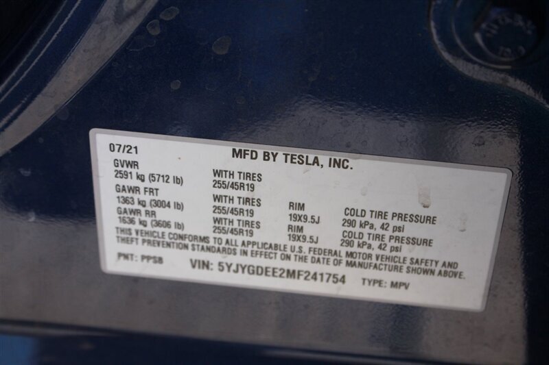 INSTALLED FEATURES: Air filtration, Front air conditioning: automatic climate control, Front air conditioning zones: dual, Rear vents: second row, Airbag deactivation: occupant sensing passenger, Front airbags: dual, Knee airbags: dual front, Side airbags: front, Side curtain airbags: front / rear, Antenna type: element, Auxiliary audio input: Bluetooth / USB, Internet radio app: TuneIn, Radio: FM / HD radio / touch screen display / voice operated, Radio data system, Subwoofer: 1, Total speakers: 14, Watts: 560, ABS: 4-wheel, Braking assist, Electronic brakeforce distribution, Electronic parking brake, Front brake diameter: 14.0, Front brake type: ventilated disc, Front brake width: 0.98, Power brakes, Rear brake diameter: 13.2, Rear brake type: ventilated disc, Rear brake width: 0.79, Regenerative braking system, Armrests: rear center with cupholders / rear folding, Center console trim: leatherette, Door trim: faux suede, Floor mat material: carpet, Floor material: cargo area carpet / carpet, Floor mats: front / rear, Interior accents: metallic-tone / wood, Steering wheel trim: leatherette, Adaptive cruise control, Adaptive stop and go cruise control: fully automated, Ambient lighting, Cargo area light, Cargo cover: hard, Center console: front console with armrest and storage, Cupholders: front / rear, Easy entry: power driver seat / power steering wheel, Memorized settings: 8 driver / audio system / driver seat / side mirrors / steering wheel, Multi-function remote: proximity entry system / trunk release / vehicle and key memory, One-touch windows: 4, Power outlet(s): 12V front / USB front / USB rear / USB-C front / USB-C rear, Power steering: variable/speed-proportional, Power windows: lockout button, Reading lights: front / rear, Rearview mirror: auto-dimming, Steering wheel: power tilt and telescopic, Steering wheel mounted controls: audio / cruise control / multi-function / phone / voice control, Storage: accessory hook / door pockets, Universal remote transmitter: Homelink - garage door opener, Vanity mirrors: dual illuminating, Wireless charging station: front, 4WD type: full time, Axle ratio: 9.00, Drive mode selector, Electric charge cord: 240 volt, Electric motor battery type: lithium ion, Electric motor charger connector: Tesla (SAE J3400), Electric motor charging time (240V): 10 hours, Electric Motor HP: 346, Electric motor miles per charge: 316, Electric Motor Power Output (Kilowatts): 258, Electric Motor Torque: 389, EV battery capacity: 75 kWh, EV on-board charger rating: 11.5 kW, Door handle color: black, Fender lip moldings: black, Front bumper color: body-color, Grille color: black, Mirror color: body-color, Rear bumper color: body-color, Rear spoiler: lip, Rear spoiler color: body-color, Rear trunk/liftgate: liftgate / power operated, Window trim: black, Infotainment screen size: 15 in., Clock, Compass, Digital odometer, External temperature display, Fuel economy display: range, Multi-function display, Trip odometer, Warnings and reminders: low battery, Daytime running lights: LED, Exterior entry lights: approach lamps, Front fog lights: LED, Headlights: LED / auto delay off / auto high beam dimmer / auto on/off / self-leveling, Taillights: LED, Side mirror adjustments: power / power folding / reverse gear tilt, Side mirrors: auto-dimming / heated, Moonroof / Sunroof: panoramic, Automatic emergency braking: front / front pedestrian, Automatic hazard warning lights, Blind spot safety: sensor/alert, Camera system: front / rearview, Child safety door locks, Child seat anchors: LATCH system, Crumple zones: front, Dash camera: front recording / rear recording / side recording, Emergency interior trunk release, Impact sensor: battery disconnect / door unlock / post-collision safety system, Lane deviation sensors, Parking sensors: front / rear, Pedestrian safety sound generation, Pre-collision warning system: audible warning / pedestrian detection / visual warning, Rearview monitor: in dash, Traffic sign recognition: adaptive speed limiting, Emergency locking retractors: front / rear, Front seatbelts: 3-point, Rear seatbelts: 3-point, Seatbelt force limiters: front, Seatbelt pretensioners: front, Seatbelt warning sensor: front, Driver seat: heated, Driver seat power adjustments: 4-way power lumbar / height / reclining / 12, Front headrests: integrated / 2, Front seat type: bucket, Passenger seat: heated, Passenger seat power adjustments: 4-way power lumbar / height / reclining / 12, Rear headrests: adjustable / 3, Rear seat: heated, Rear seat folding: power / split, Rear seat power adjustments: reclining, Rear seat type: 60-40 split bench, Upholstery: leatherette, Anti-theft system: alarm / perimeter alarm / vehicle immobilizer, Power door locks: anti-lockout / auto-locking, Hill holder control, Stability control, Traction control, Turns lock-to-lock: 2.0, Front shock type: twin-tube gas, Front spring type: coil, Front stabilizer bar, Front struts, Front suspension classification: independent, Front suspension type: double wishbone, Rear shock type: twin-tube gas, Rear spring type: coil, Rear struts, Rear suspension classification: independent, Rear suspension type: multi-link, Navigation data: real time traffic / send destination to vehicle, Navigation system: touch screen display / voice operated, Smart device app compatibility: Tesla App, Smart device app function: horn/light operation / lock operation / maintenance scheduling / maintenance status / phone as a key / security event/collision alert / vehicle location / window operation, Wi-Fi: hotspot compatible, Wireless data link: Bluetooth, Tire Pressure Monitoring System, Tire type: all season, Wheels: aluminum alloy, Front wipers: rain sensing / speed sensitive / variable intermittent, Liftgate window: fixed, Power windows: remotely operated / safety reverse, Tinted glass, Window defogger: rear