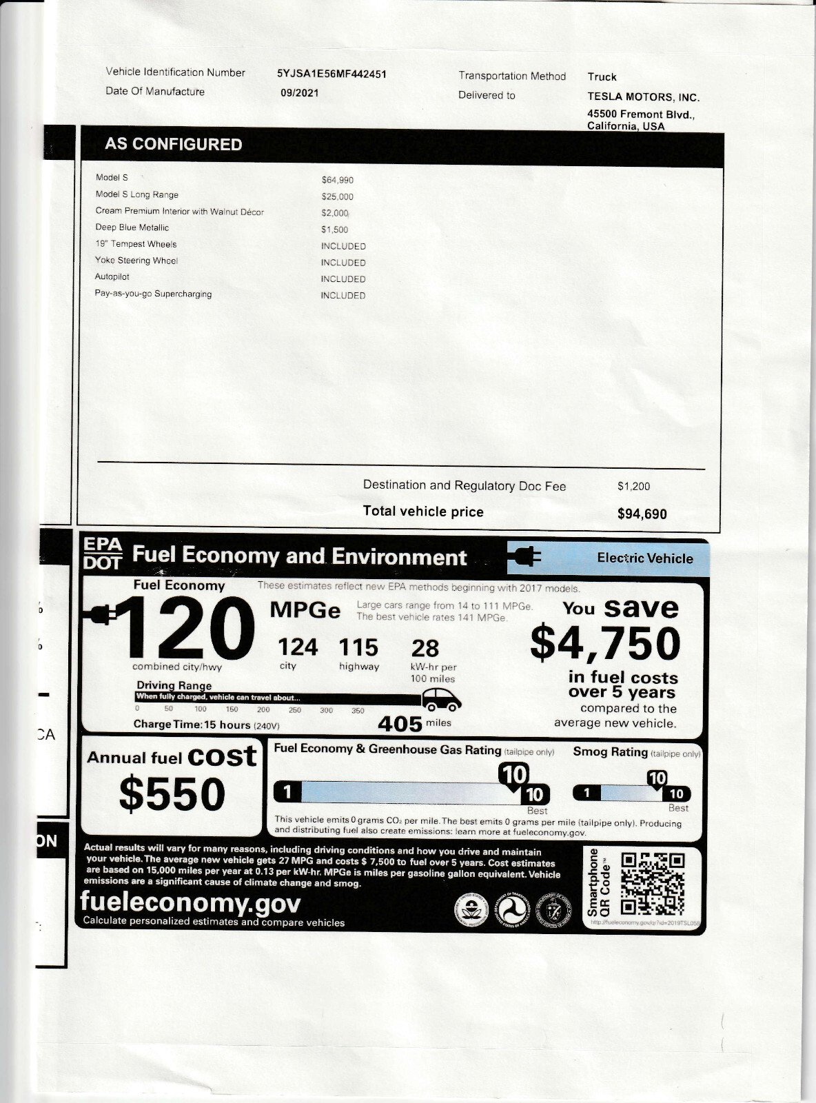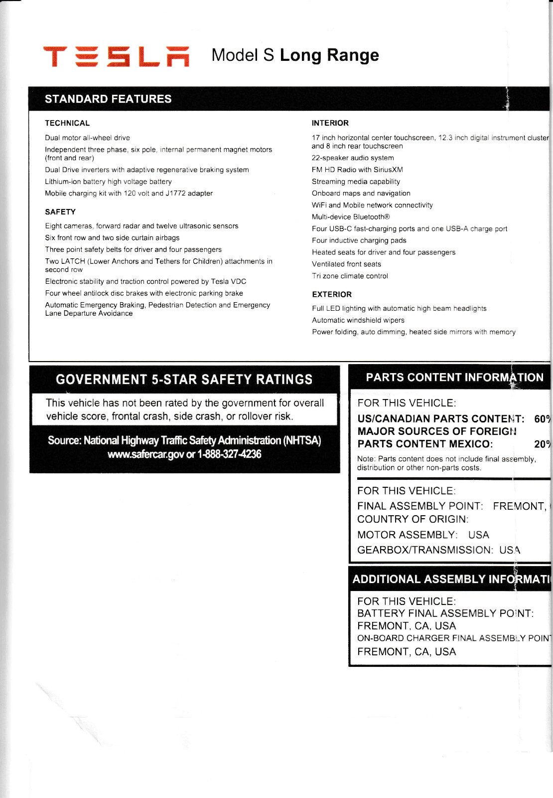 I have posted a scan of the original window sticker so you can see which accessories came with the car, there have been NO additions. The only active self driving feature is "cruse control". Hardware for full self driving is on the car but must be activated with Tesla.My wife and I are in our seventies and do not "hot rod" the car. I have charged the car to the max to demonstrate the remaining mileage state of the battery, it is 388 miles! Not bad after three years.The car does have one minor scuff on the right rear quarter panel, a gift from someone in a parking lot, and another scrape type scratch on the right rear fender from an unknown source. The scuff on the side panel is almost completely covered after having the car detailed, the scratch would require a body shop touch up.A couple of the wheel rims have scratches on them from getting too close to a curb.Tesla has replaced the steering yoke.Please send questions through Ebay's system.