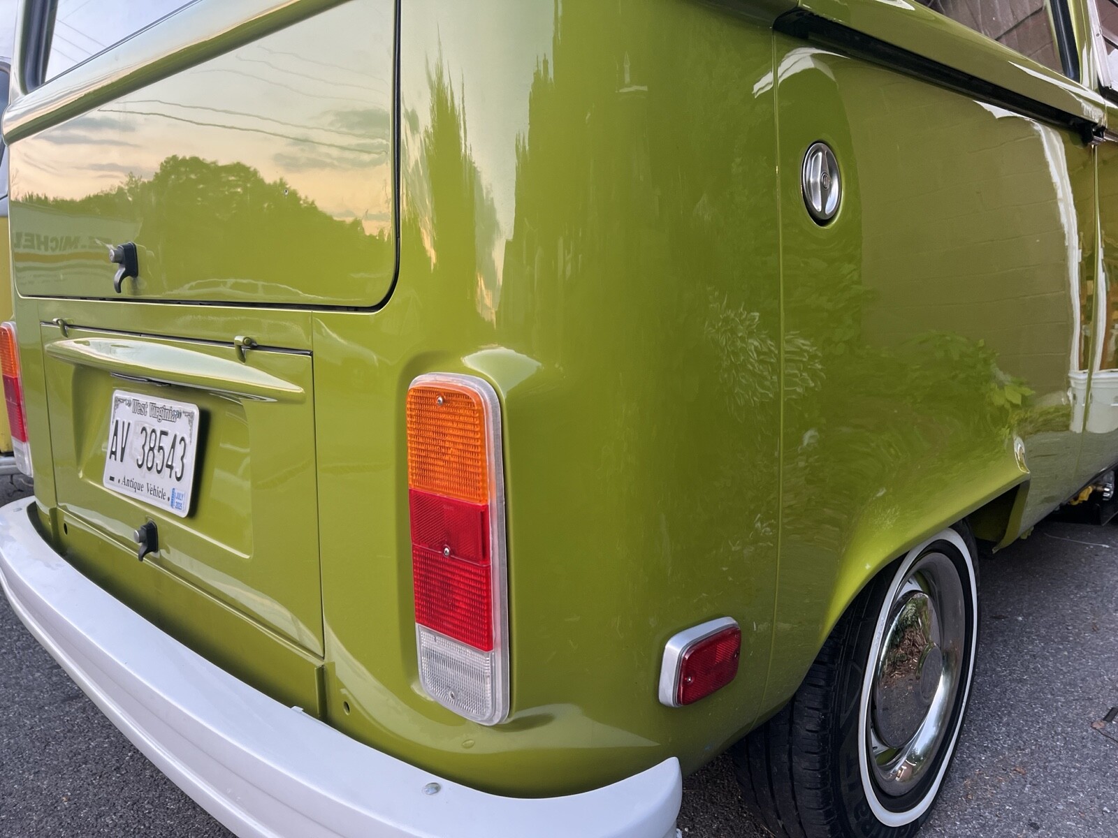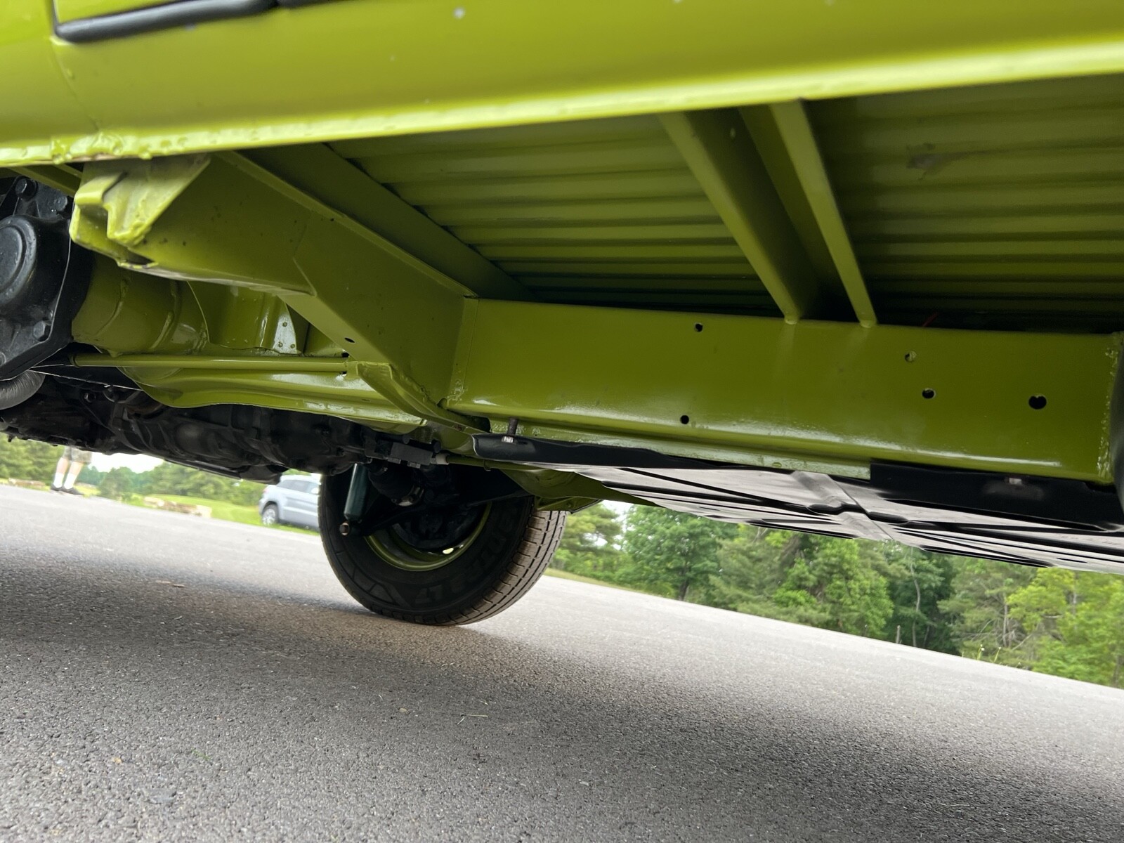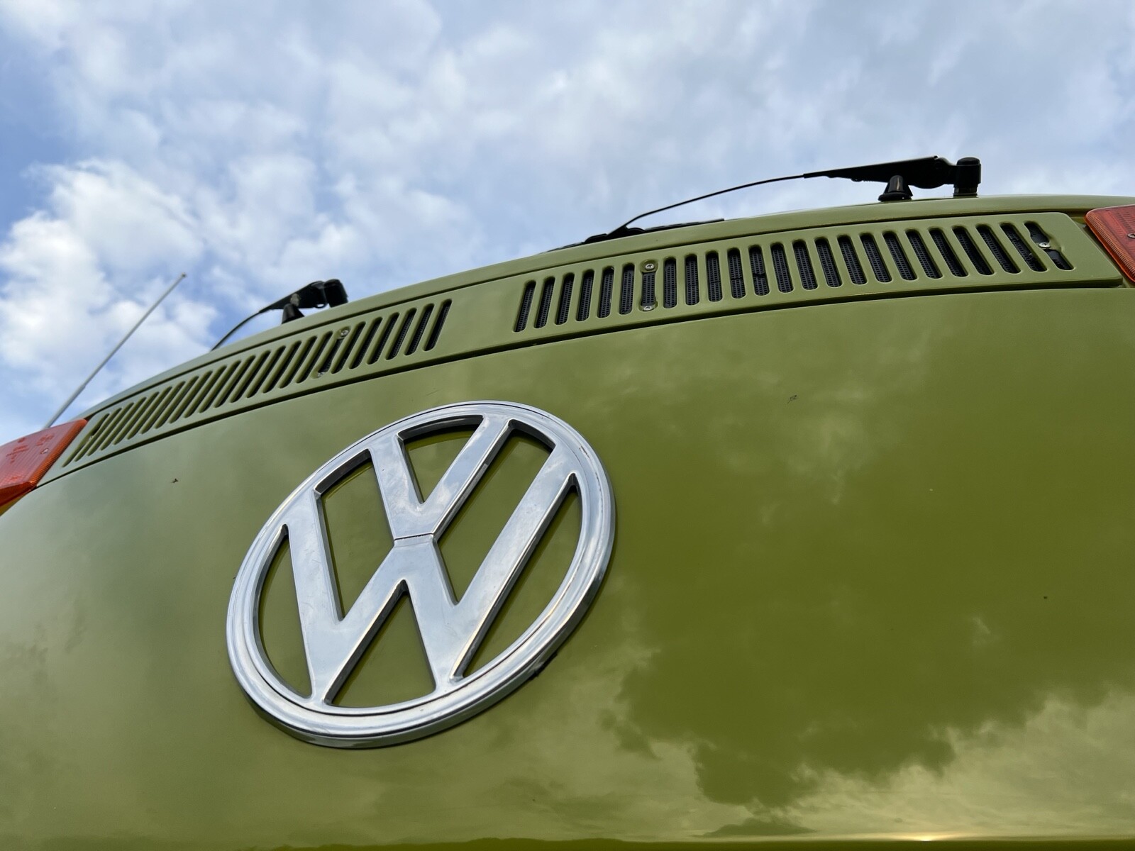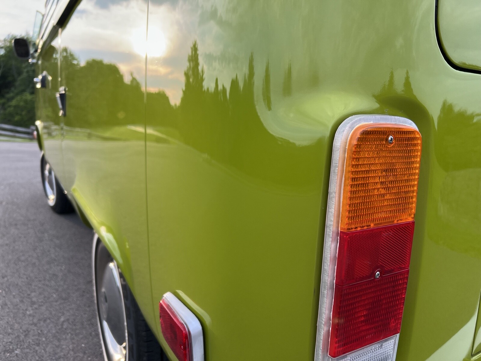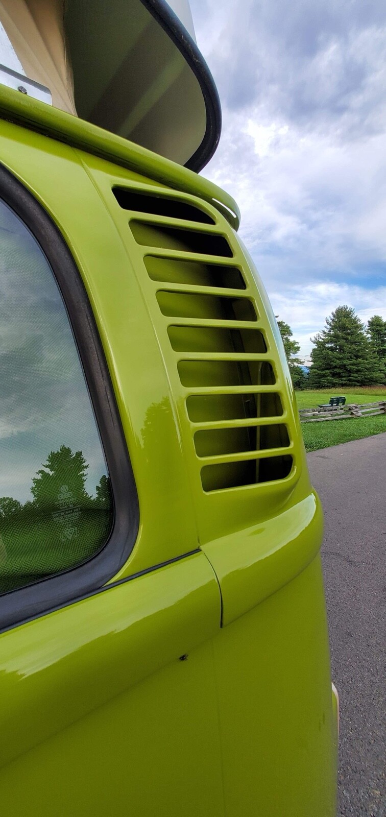 Bus was completely disassembled and taken down to bare metal.Only rust found was in front dog legs ,a small area under tail light and battery tray.These areas were removed and new metal put in place.Also replaced front door skins due to some rust in lower part of the doors.Vehicle was repainted in the original Sage green using top of the line Ppg paint and Southern Urethane Show clear.