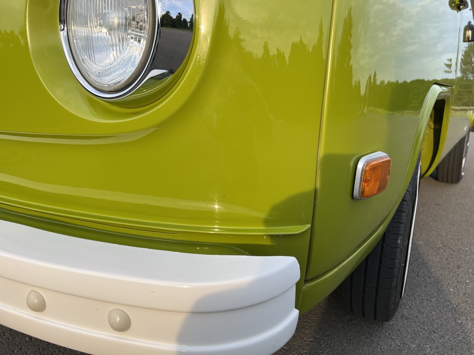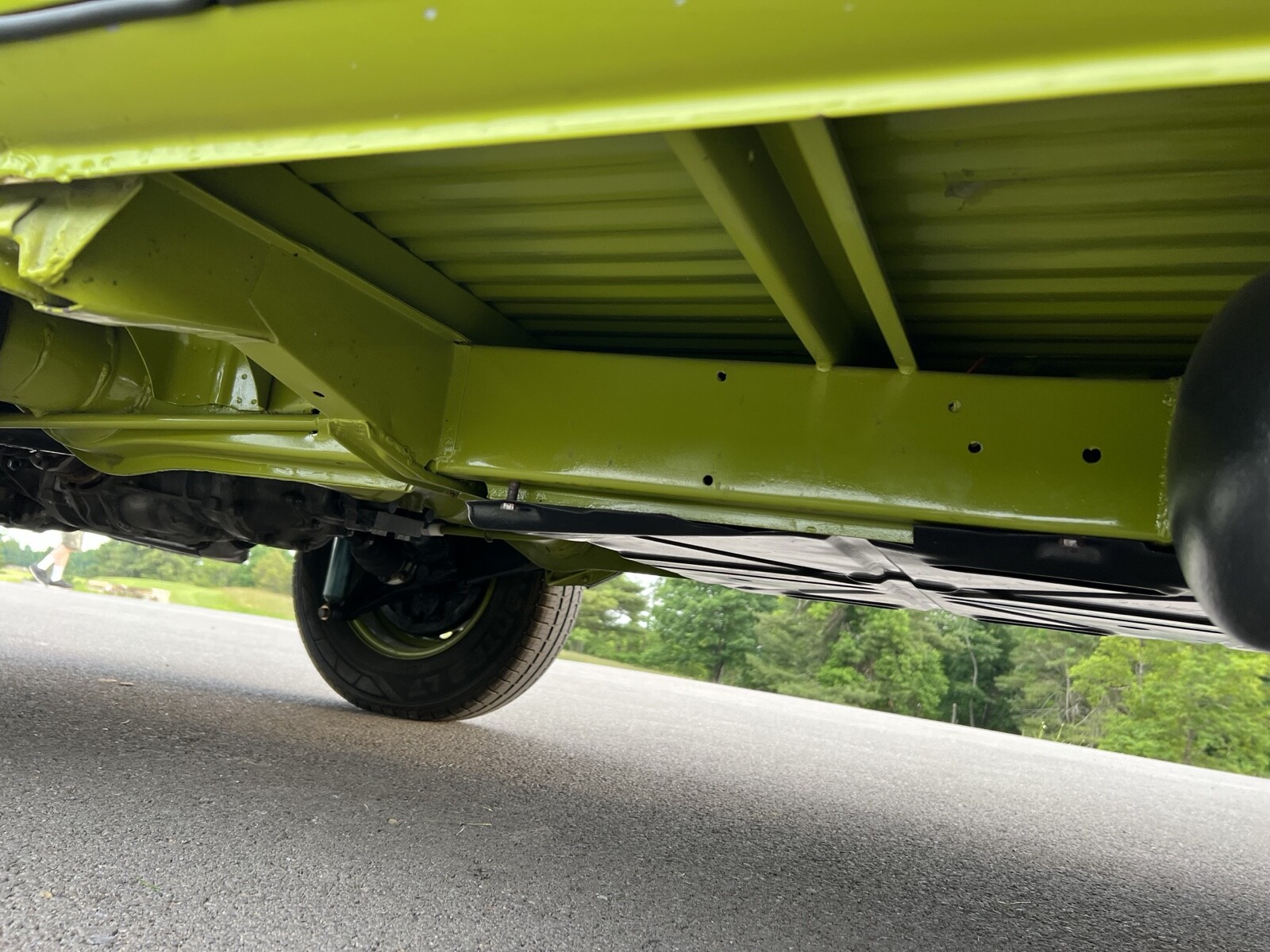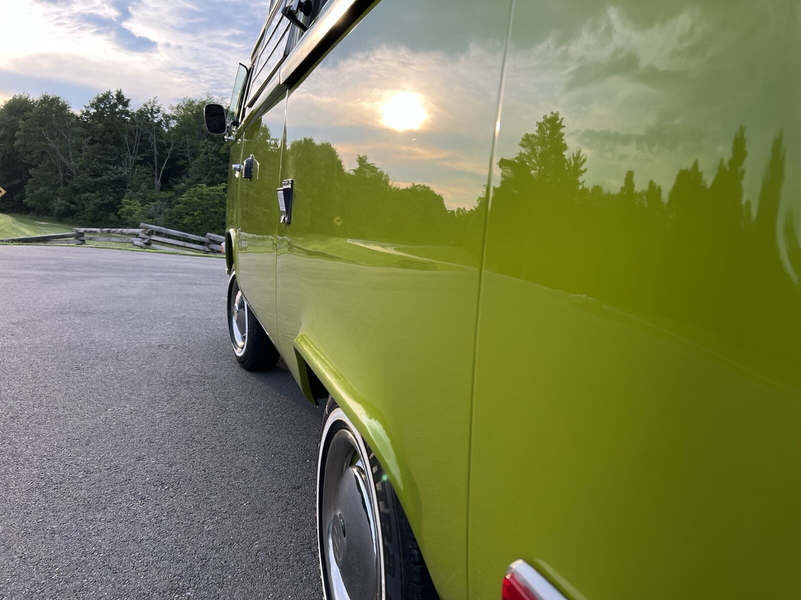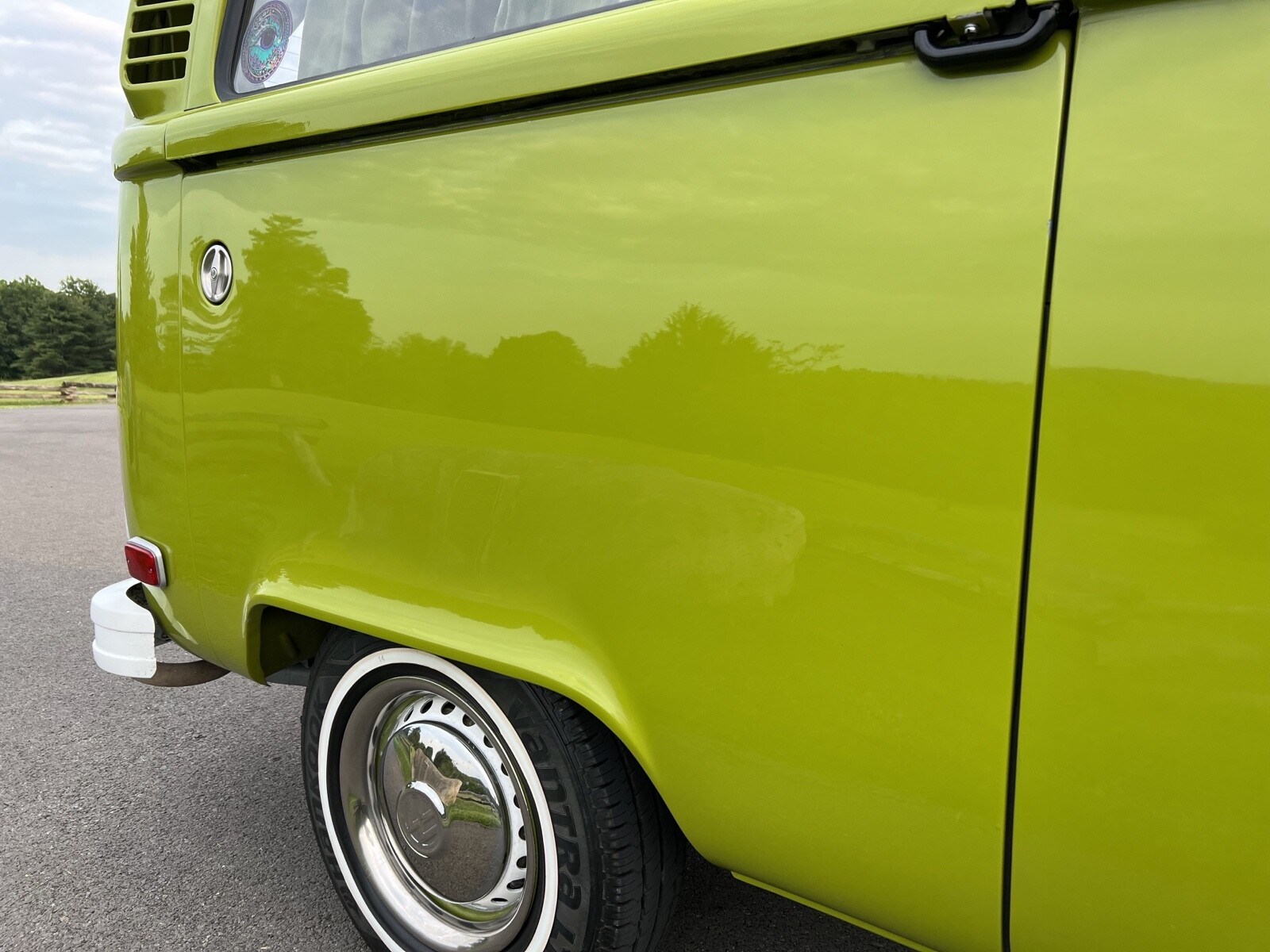 Bus was completely disassembled and taken down to bare metal.Only rust found was in front dog legs ,a small area under tail light and battery tray.These areas were removed and new metal put in place.Also replaced front door skins due to some rust in lower part of the doors.Vehicle was repainted in the original Sage green using top of the line Ppg paint and Southern Urethane Show clear.