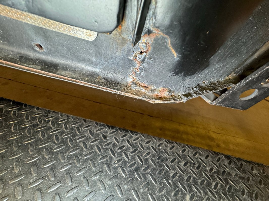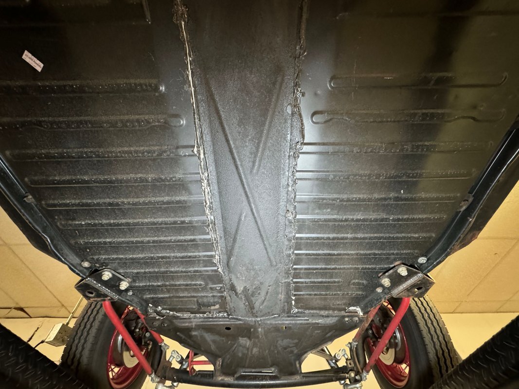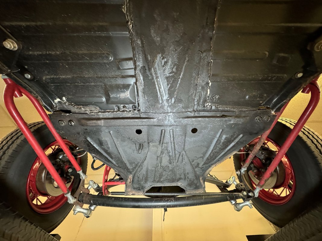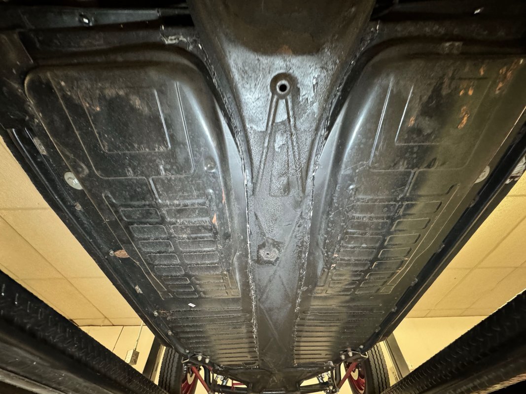 Generally clean underneath with no obvious fluids leaking anywhere. Not much surface rust either other than an area that's been welded. Suspension consists of a transverse leaf spring in front and semi trailing arms and torsion bars in the rear.