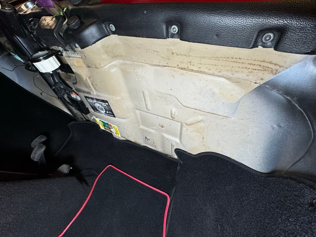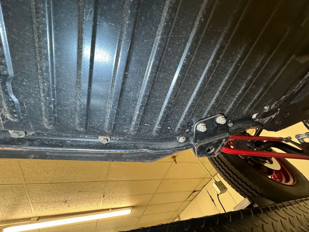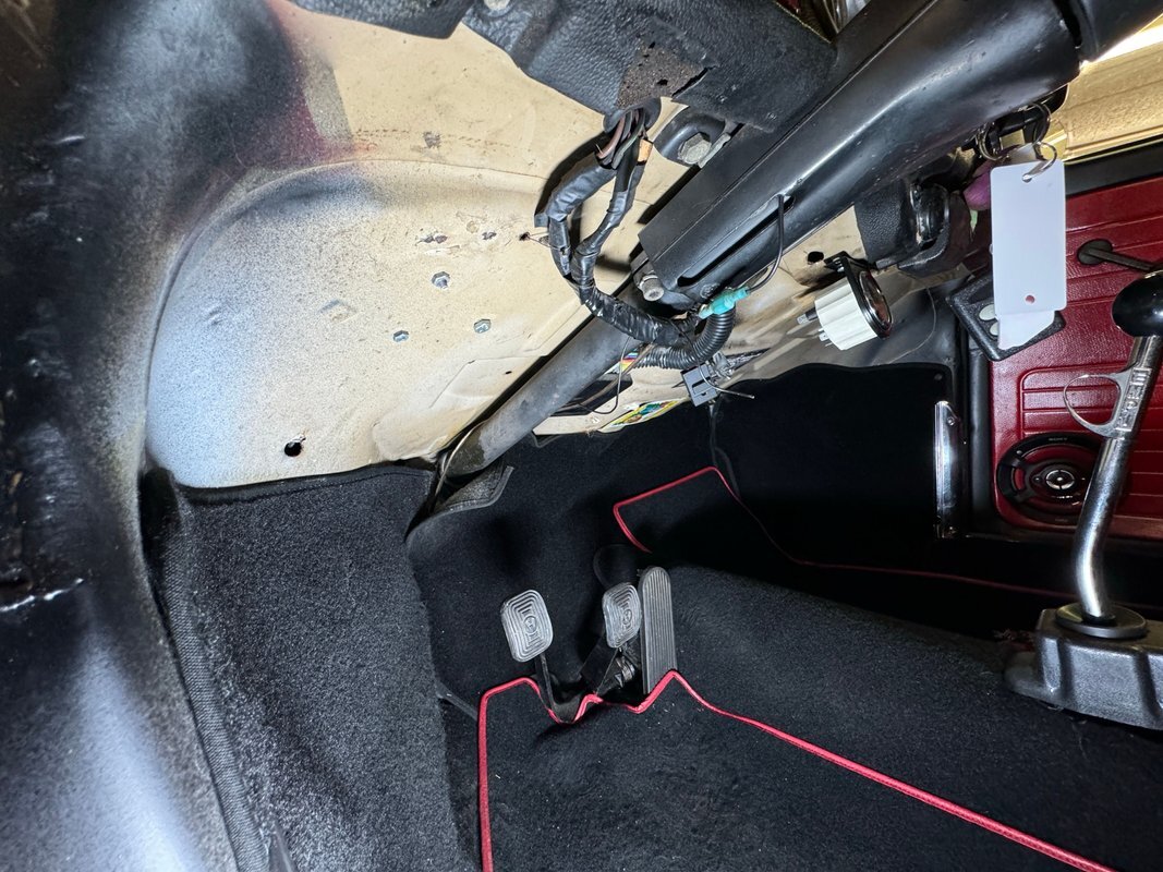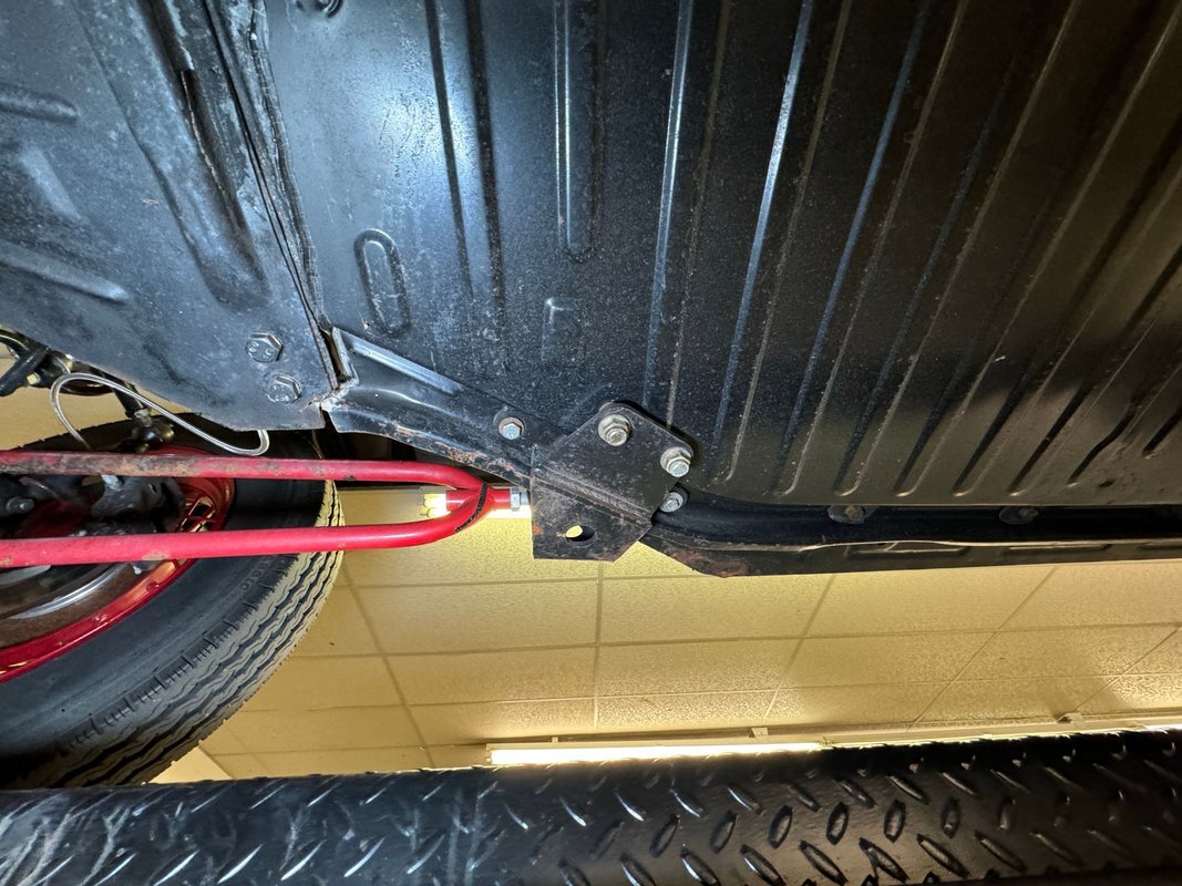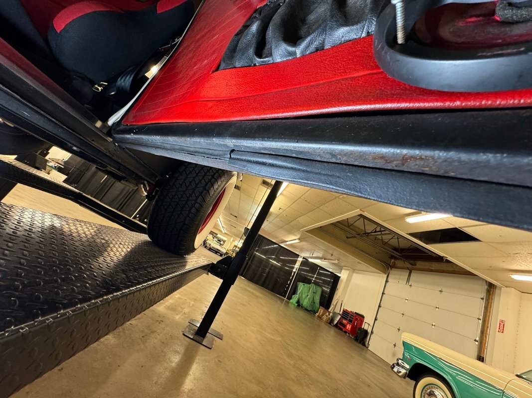 Generally clean underneath with no obvious fluids leaking anywhere. Not much surface rust either other than an area that's been welded. Suspension consists of a transverse leaf spring in front and semi trailing arms and torsion bars in the rear.