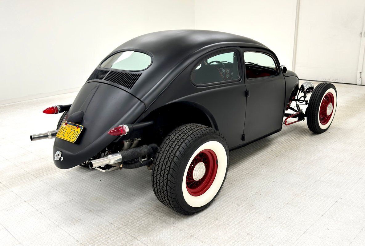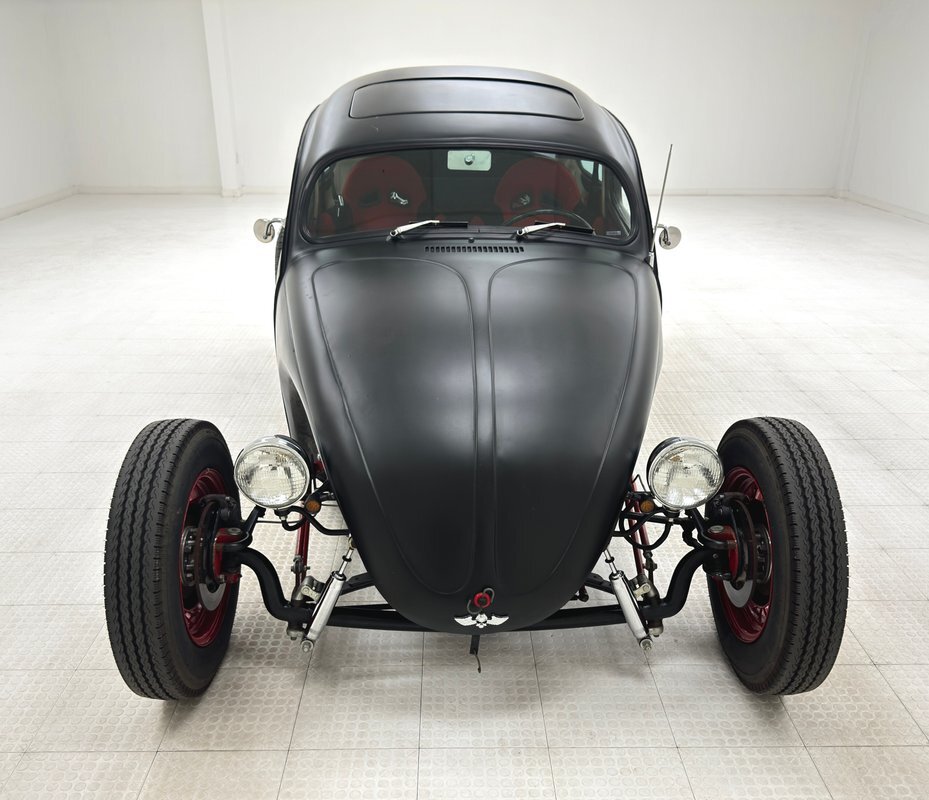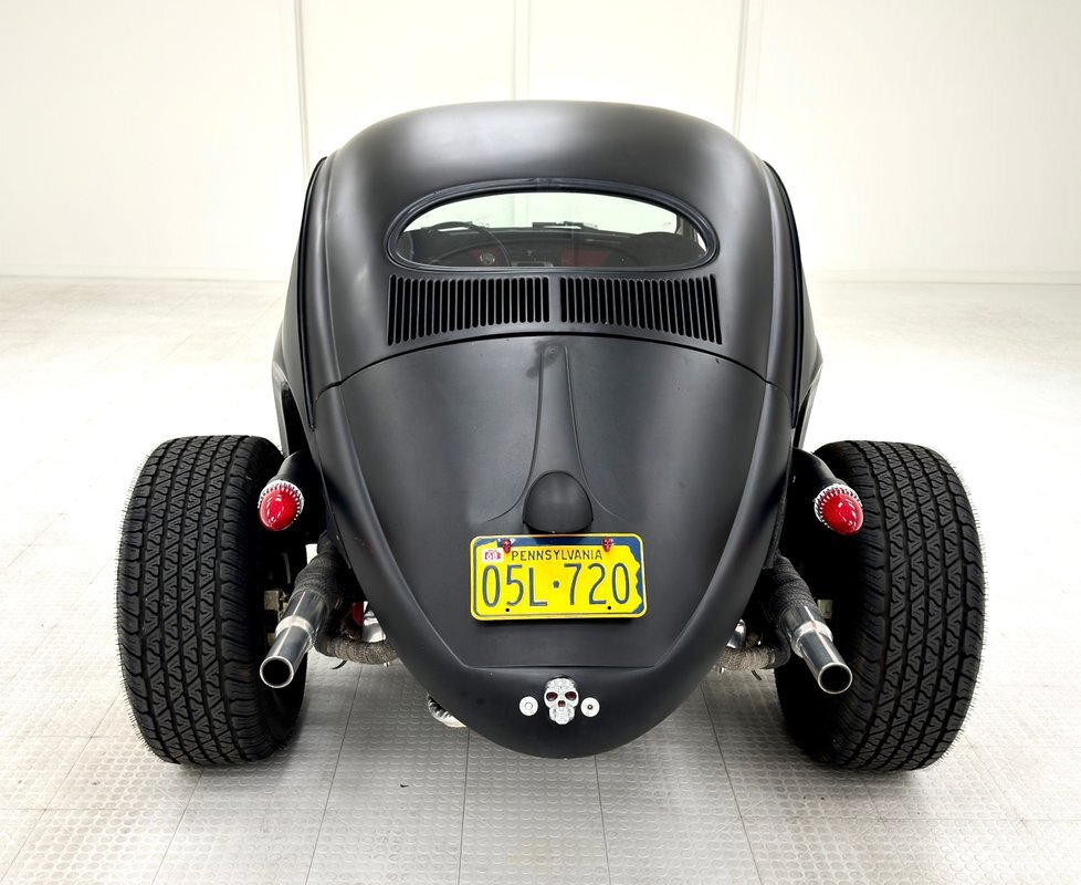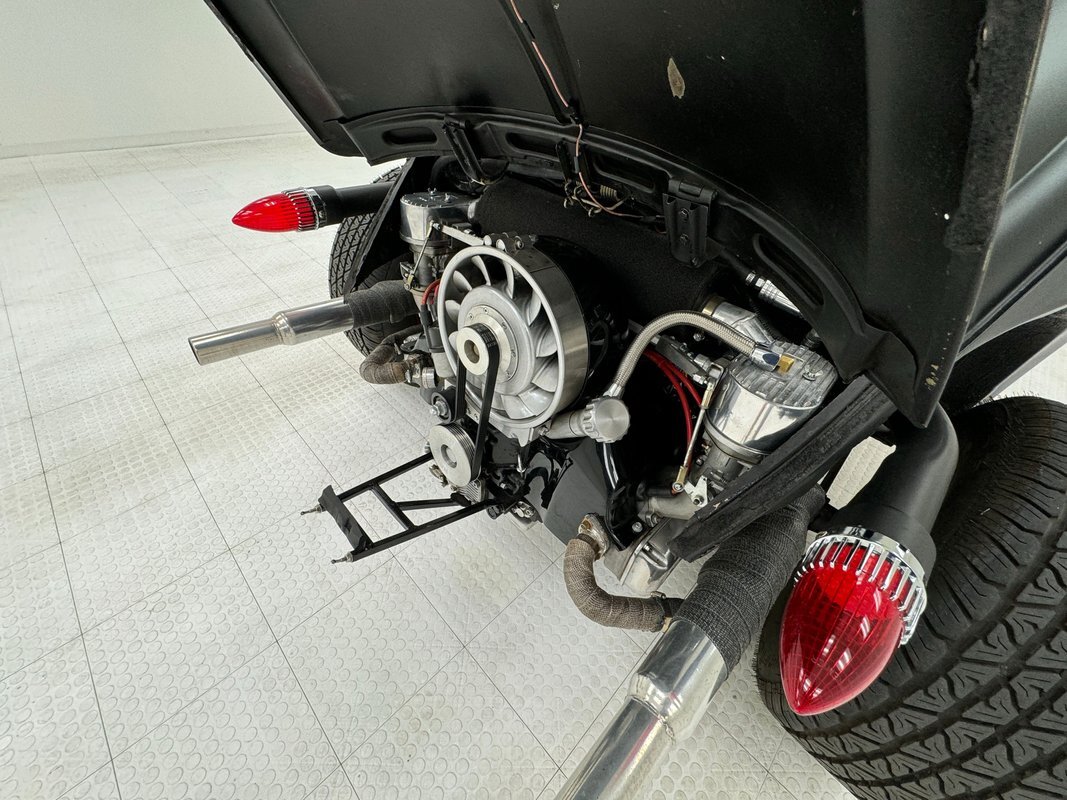 The raked stance is only slightly upstaged by the flat black paint and red accents. The fenderless front leaves the suspension components exposed, and the dropped nose is flanked by unencumbered headlights that look bug eyed. 16-inch red wire wheels from a 1935 Ford reach out in front of the car, elongating the profile and reminiscent of vintage hot rods. The chop angles the top towards the front and 15-inch custom wheels out back with 70 series tires jack up the back like a stink beetle in threat mode, (you'll have to google that one!). Bullet taillights from a '58 Cadillac sit single file out back, hovering over custom exhaust, all where the fenders would be. There's no mistaking the make with the vented bodywork under an oval window and rounded engine cover. The car is not without its bling as chrome shocks up front pick up on the headlight housing and side mirrors, all in great shape. As is the paint with a few errors in the form of scratches and a round area of cracking.