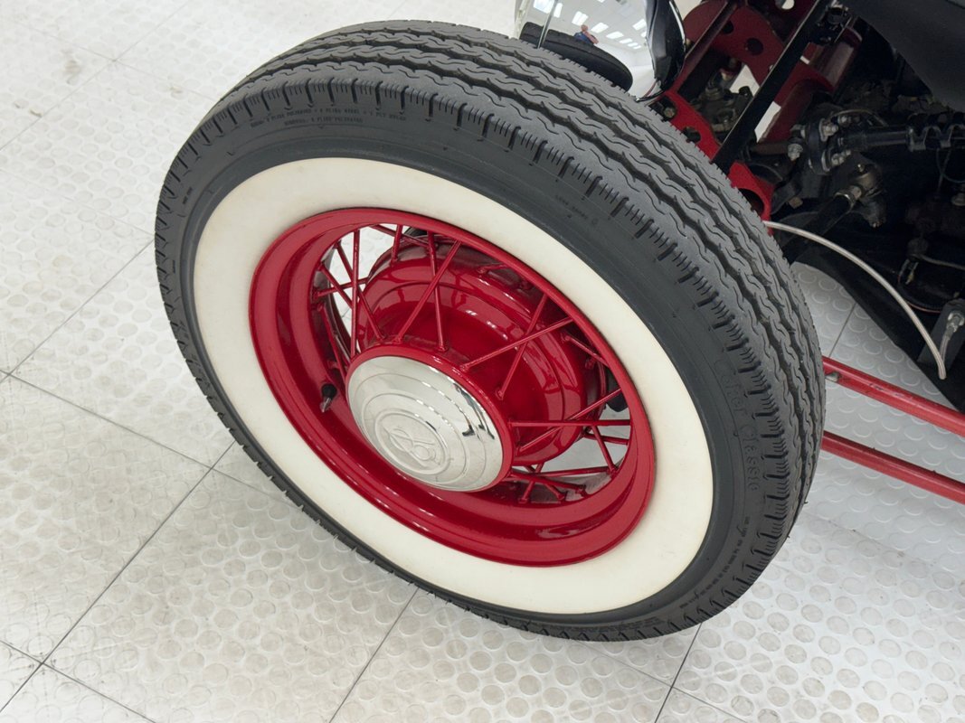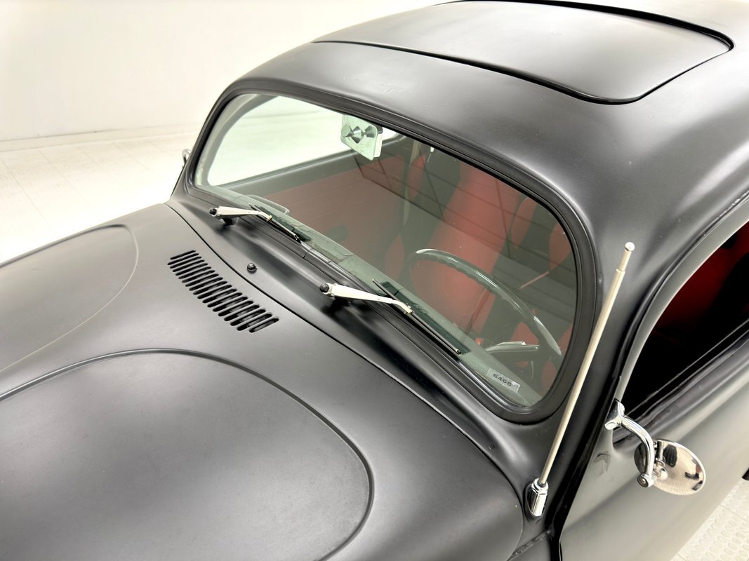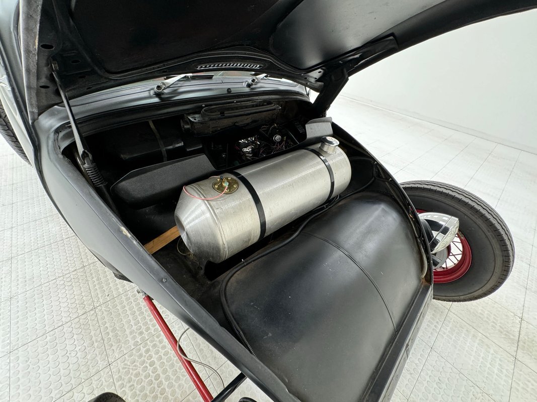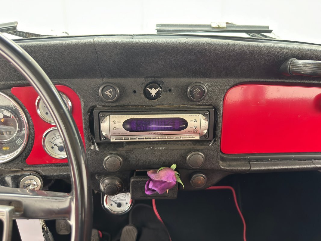 The raked stance is only slightly upstaged by the flat black paint and red accents. The fenderless front leaves the suspension components exposed, and the dropped nose is flanked by unencumbered headlights that look bug eyed. 16-inch red wire wheels from a 1935 Ford reach out in front of the car, elongating the profile and reminiscent of vintage hot rods. The chop angles the top towards the front and 15-inch custom wheels out back with 70 series tires jack up the back like a stink beetle in threat mode, (you'll have to google that one!). Bullet taillights from a '58 Cadillac sit single file out back, hovering over custom exhaust, all where the fenders would be. There's no mistaking the make with the vented bodywork under an oval window and rounded engine cover. The car is not without its bling as chrome shocks up front pick up on the headlight housing and side mirrors, all in great shape. As is the paint with a few errors in the form of scratches and a round area of cracking.