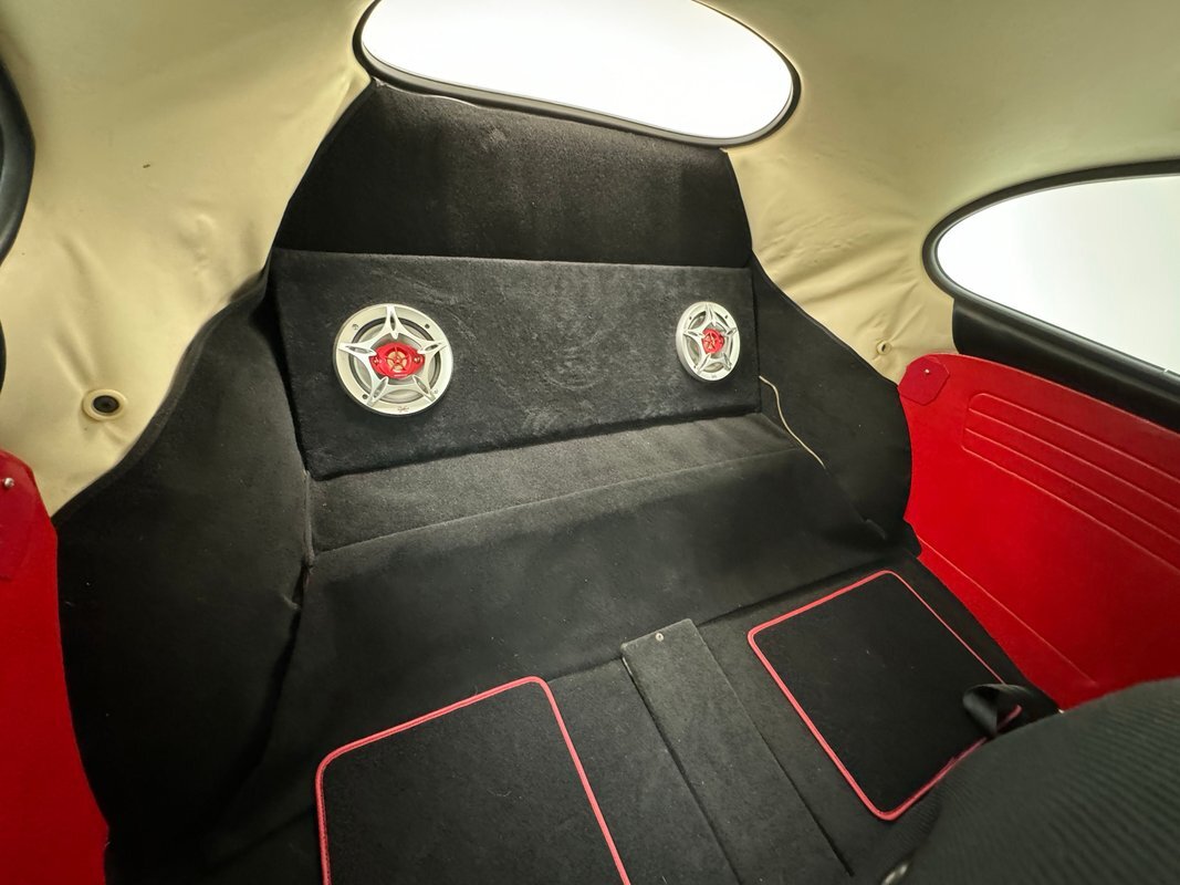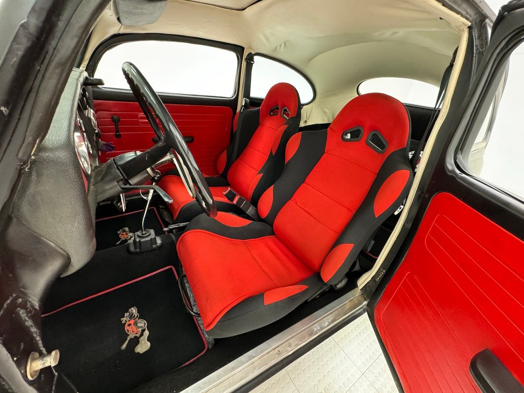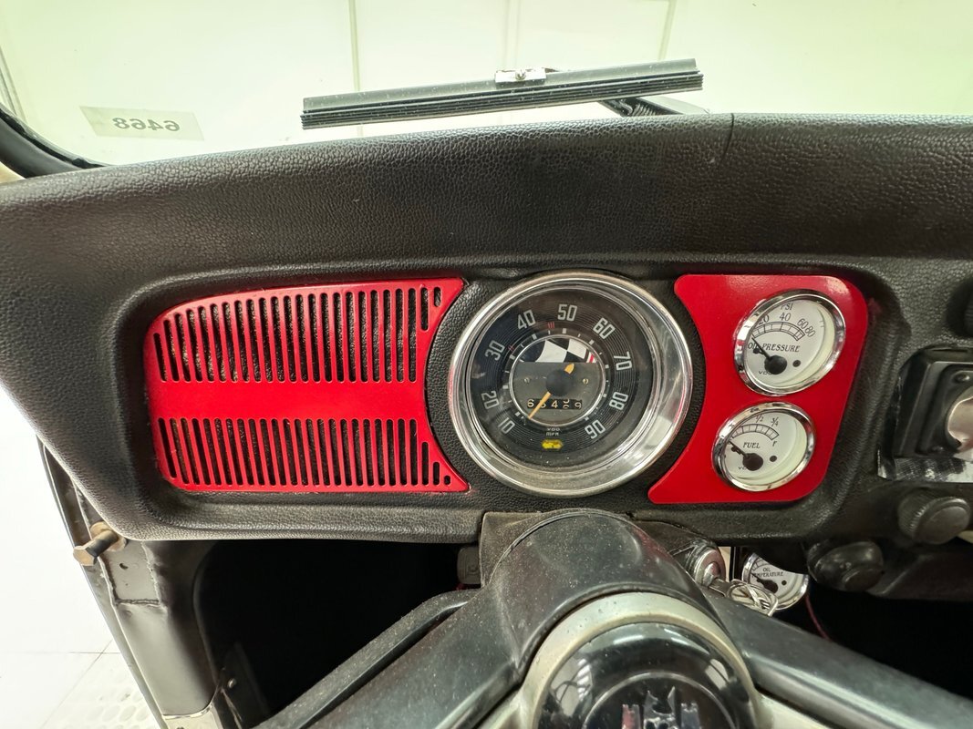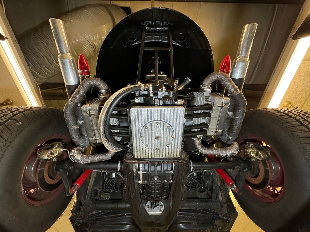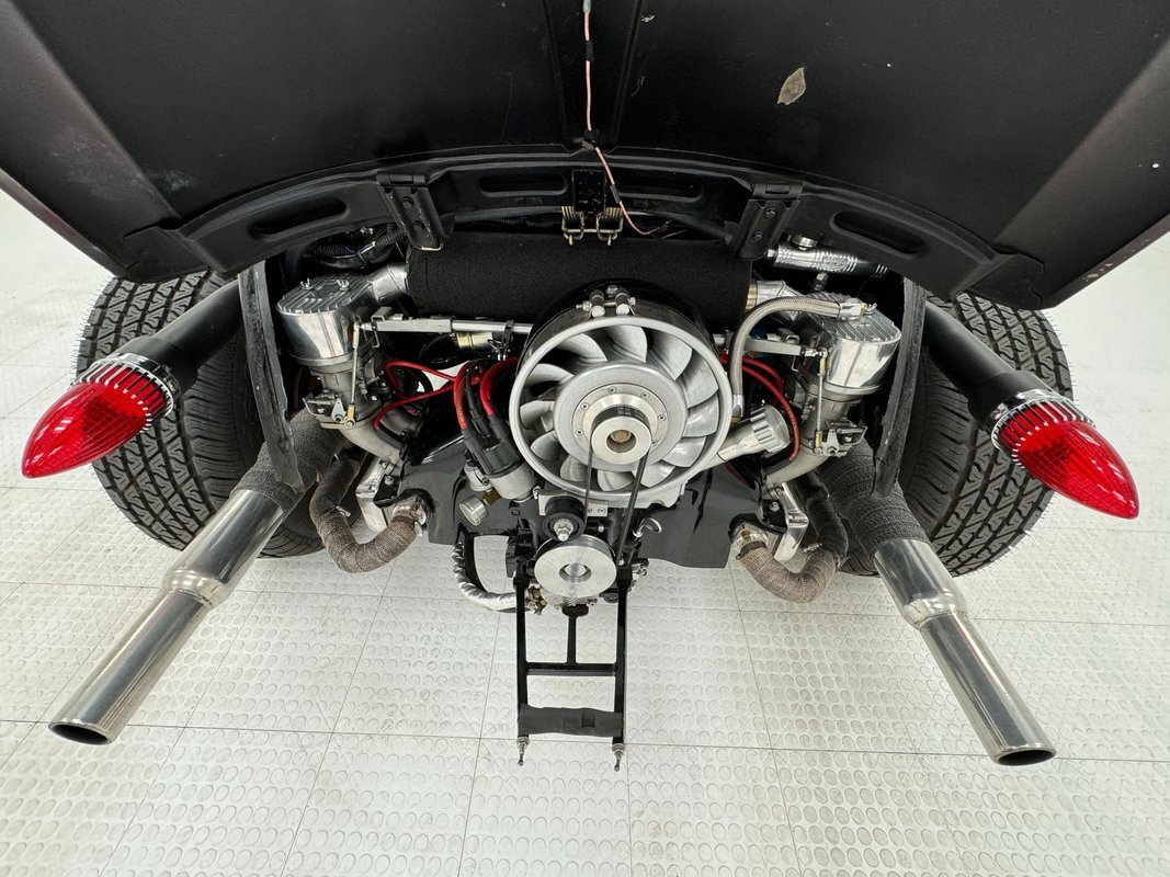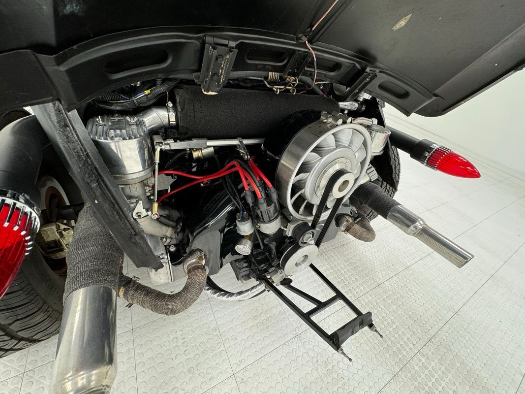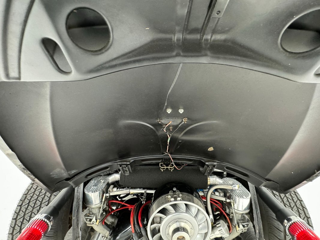 A nicely presented engine lives out back and is a 1493cc fed by a 1-barrel carburetor and tied to a 4-speed heavy duty transmission and transaxle, keeping the power at back with 4.125 gearing. Headers lead to glasspack style mufflers and then immediately point out back. Polished metal components dress up the engine. Disc brakes are in the front and back.