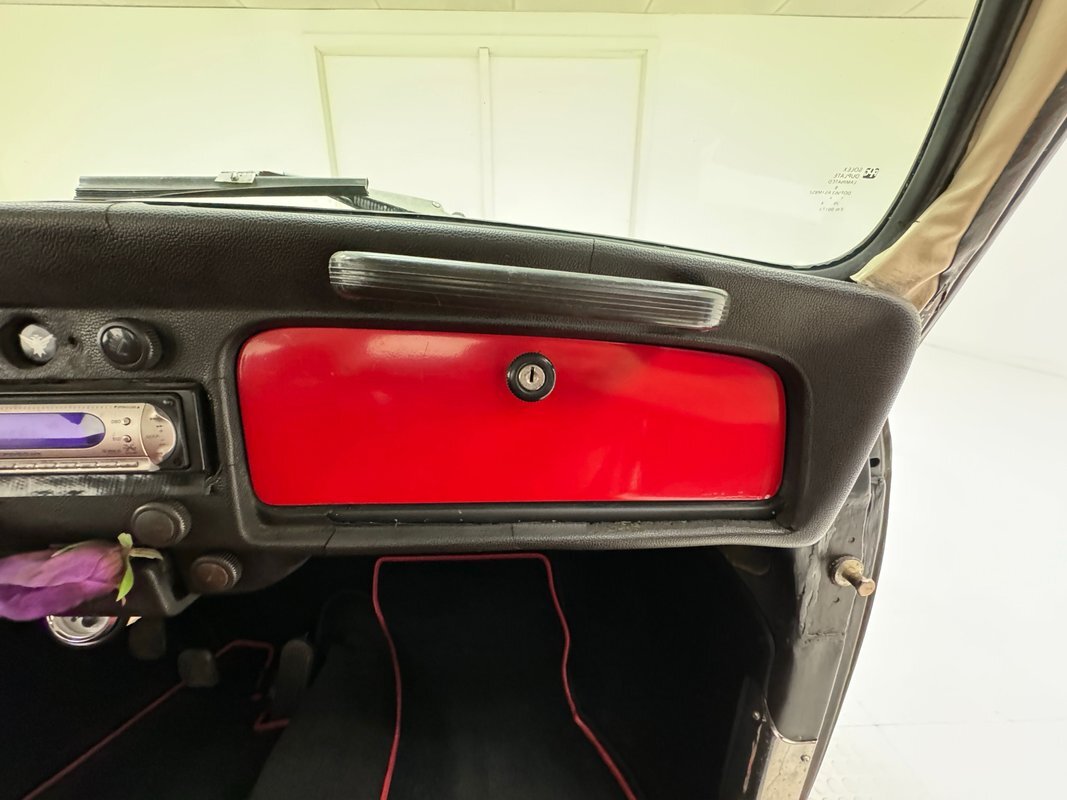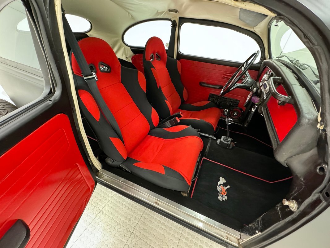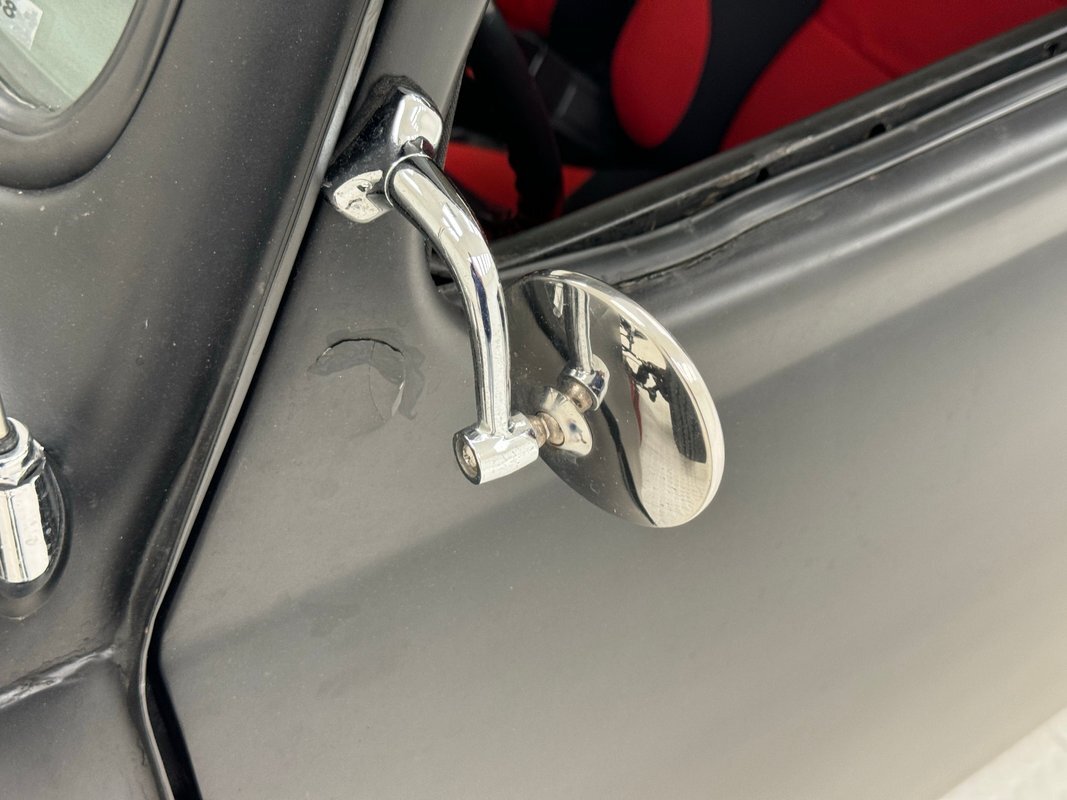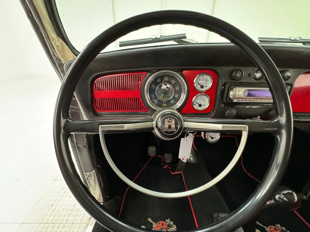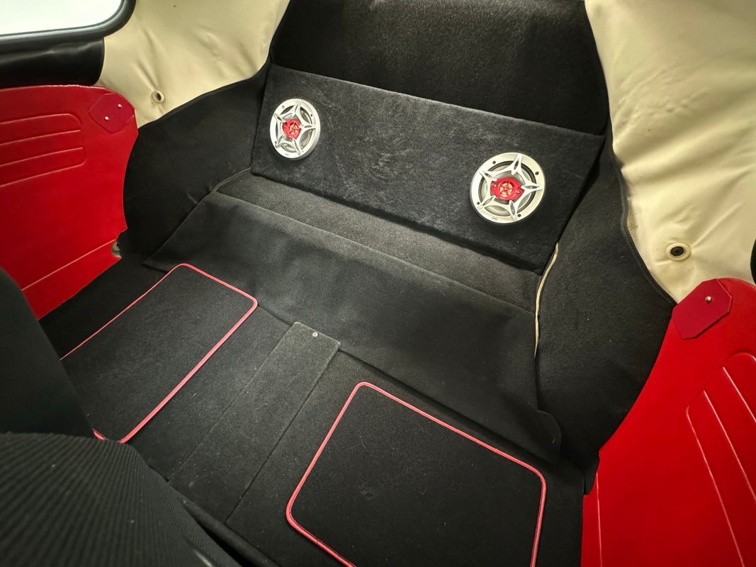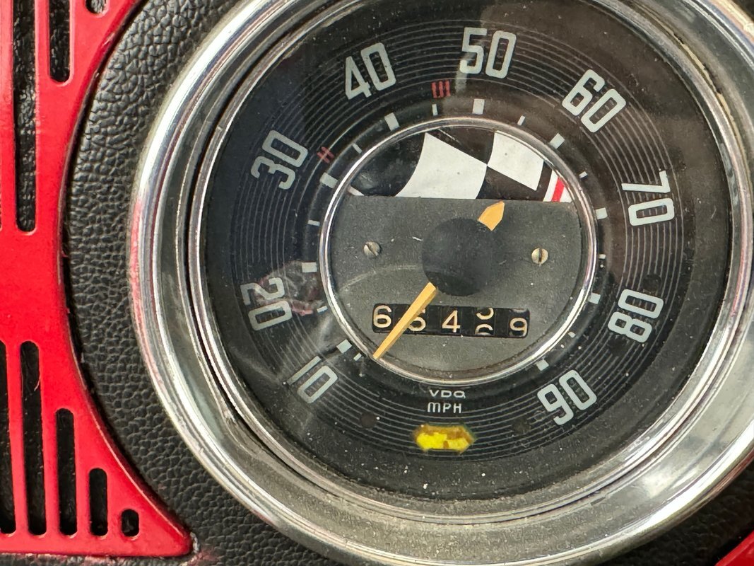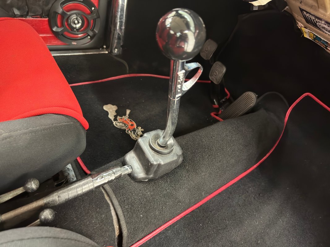 A nicely presented engine lives out back and is a 1493cc fed by a 1-barrel carburetor and tied to a 4-speed heavy duty transmission and transaxle, keeping the power at back with 4.125 gearing. Headers lead to glasspack style mufflers and then immediately point out back. Polished metal components dress up the engine. Disc brakes are in the front and back.