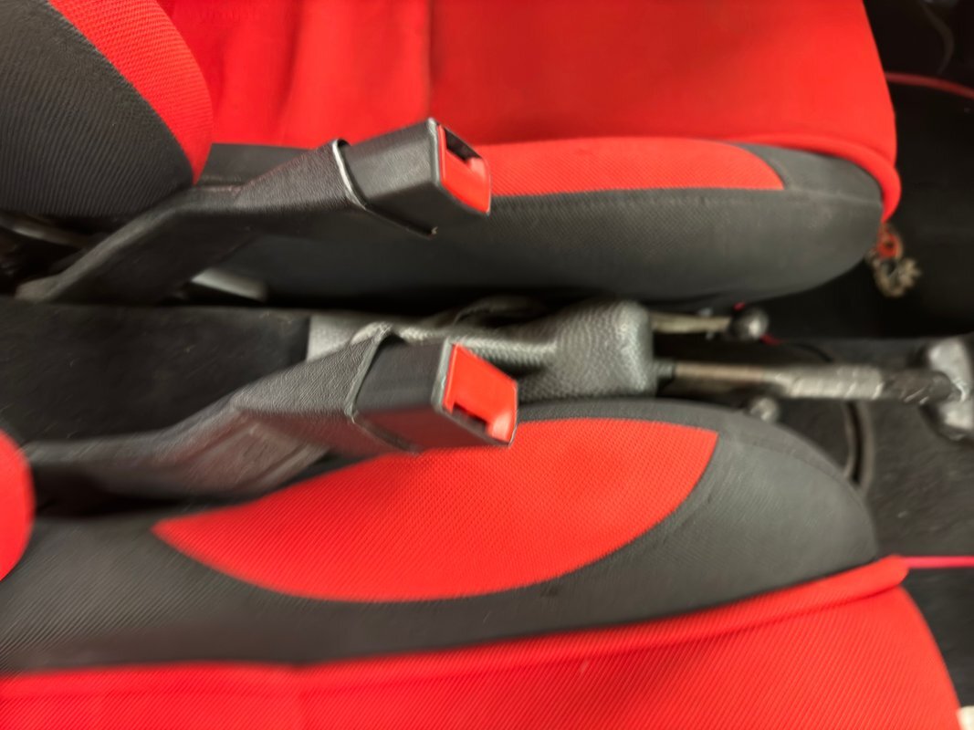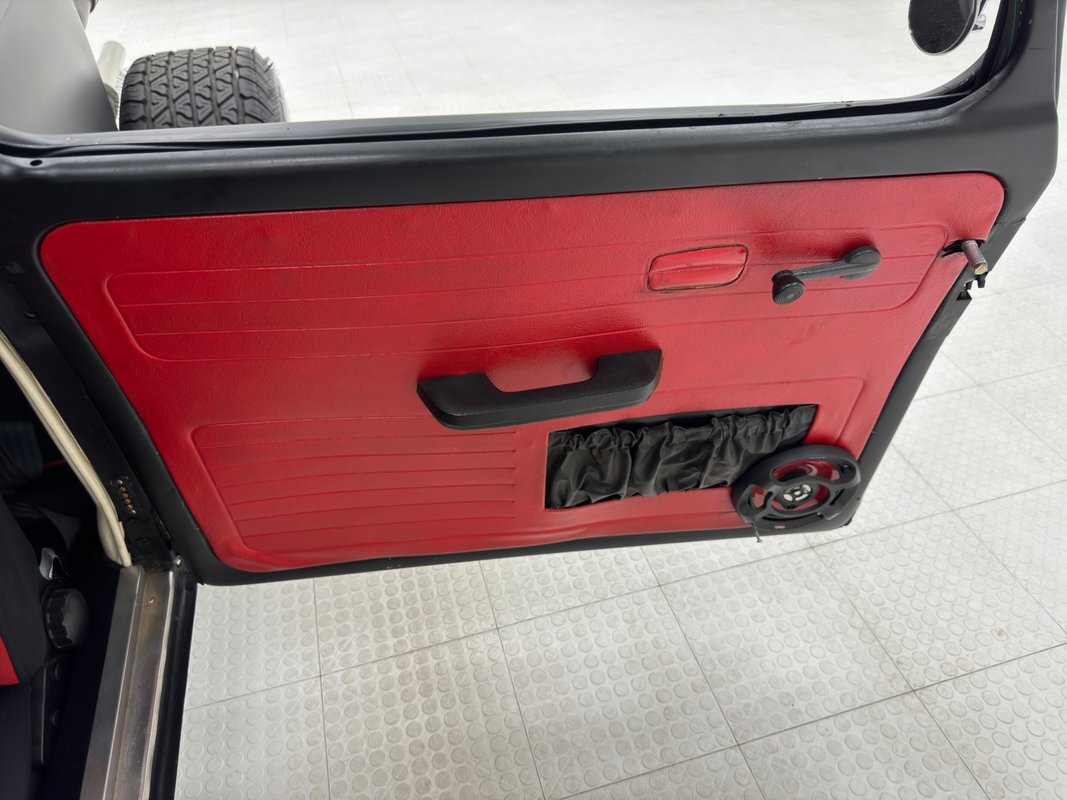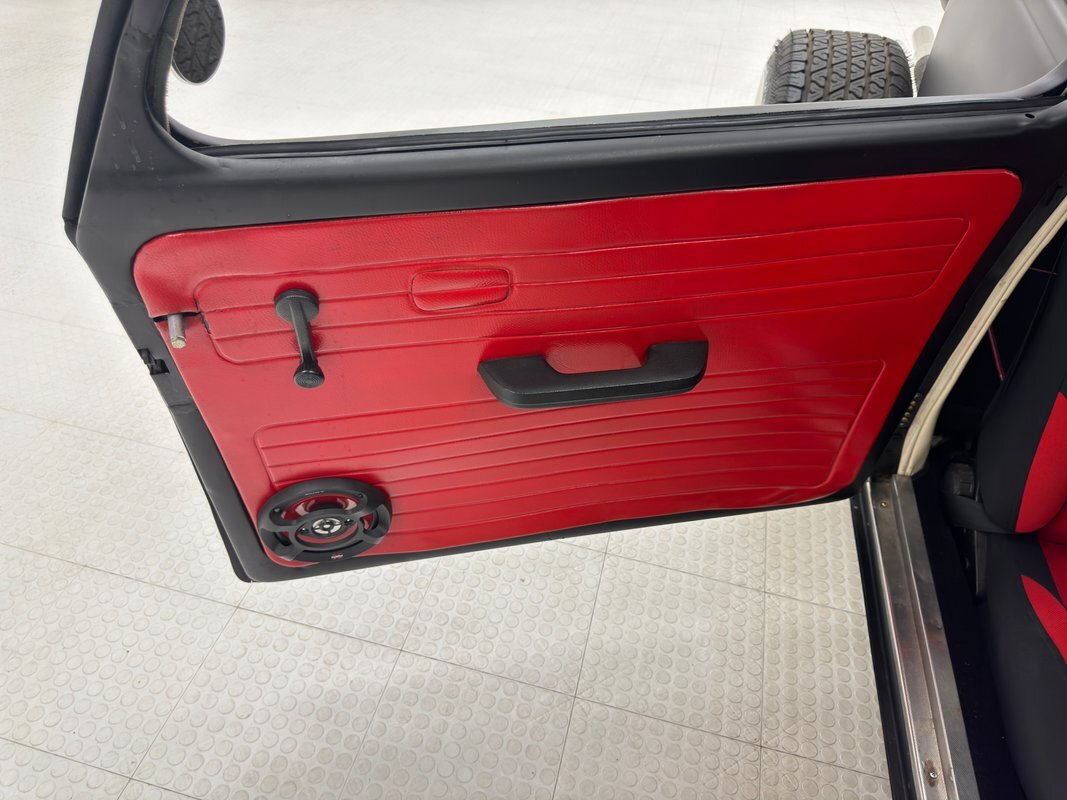 The door open suicide style and flash red vinyl door cards, standard VW, although the door actuator has been moved and a speaker added. Red and black racing style bucket seats are high backed cloth versions while the rear bench has been removed and a speaker box occupies that space backed by some loose fitting carpeted backing and red sidewalls. The stock steering wheel is in place and the stock dash has been enhanced with red paint and some VDO gauge to the right of the VDO speedometer. The shifter is floor mounted and an AM/FM/CD radio is set in the center and some cracking of the dash exists around the red painted glove box and on the dash cover. Black carpet covers the floor while the white headliner is loose in places and also covers the moon roof.