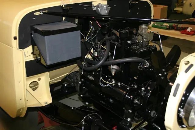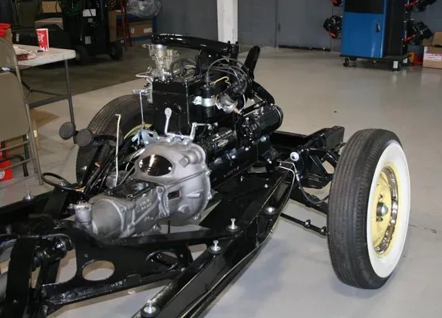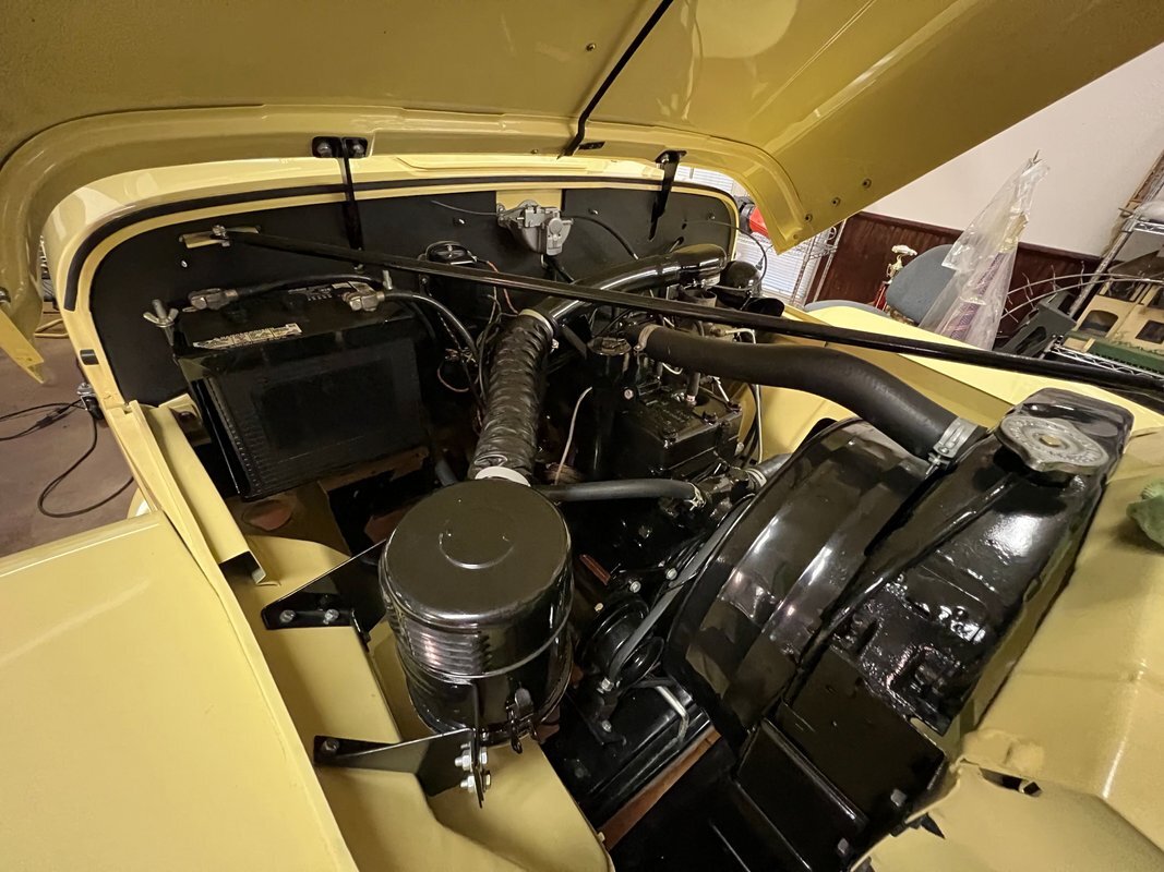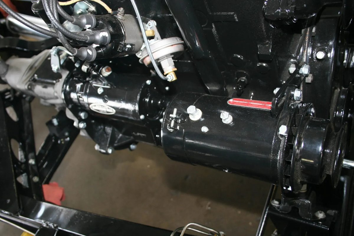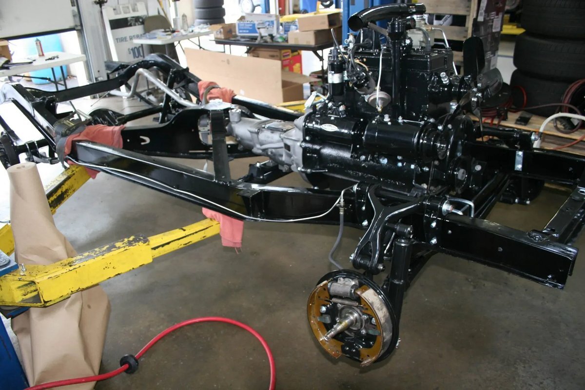The 134ci "Go Devil" inline-four was overhauled as part of the refurbishment and features a single downdraft carburetor fed by a stock air cleaner assembly. New wiring and electrical components have been installed along with stainless steel fuel lines. The engine delivers power to the rear wheels through a column-shifted three-speed manual gearbox, and the selling dealer notes that the overdrive does not function properly.