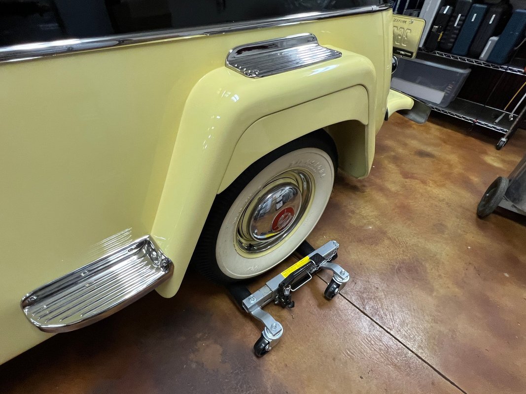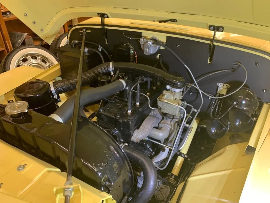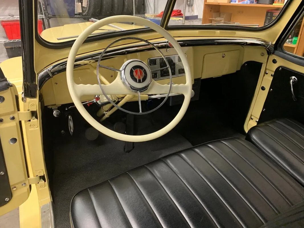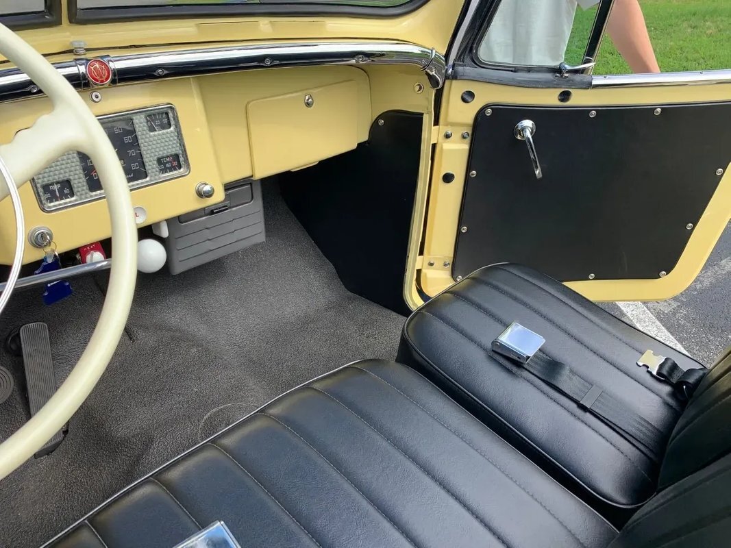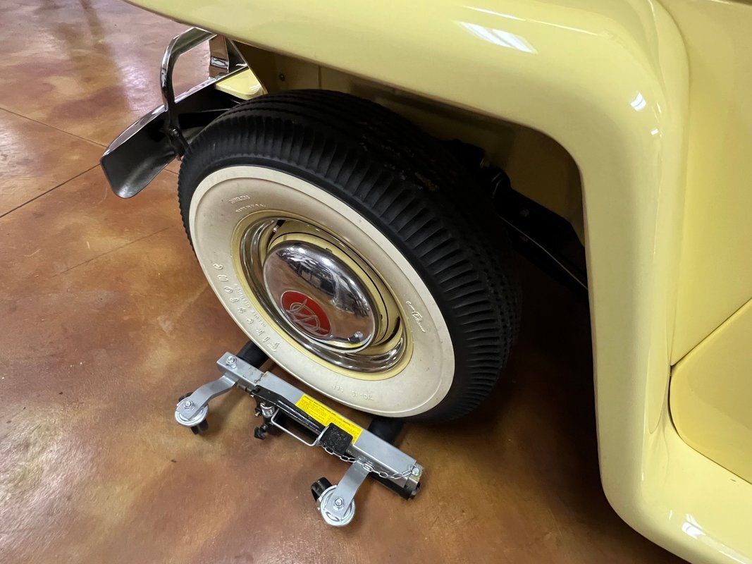 The steel wheels have been painted to match the body and wear Willys-Overland dog dish hubcaps as well as Coker whitewall tires. A continental kit spare mounted at the rear. The selling dealer notes that stainless steel brake lines were installed during the refurbishment.