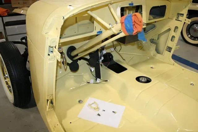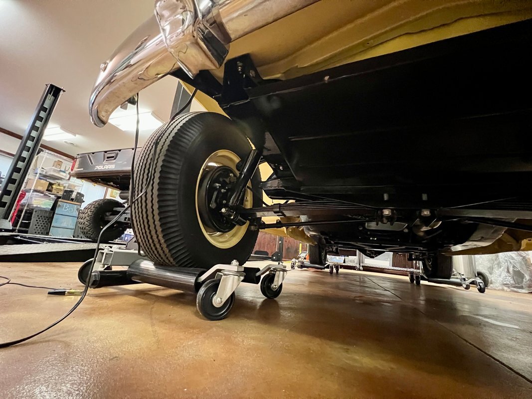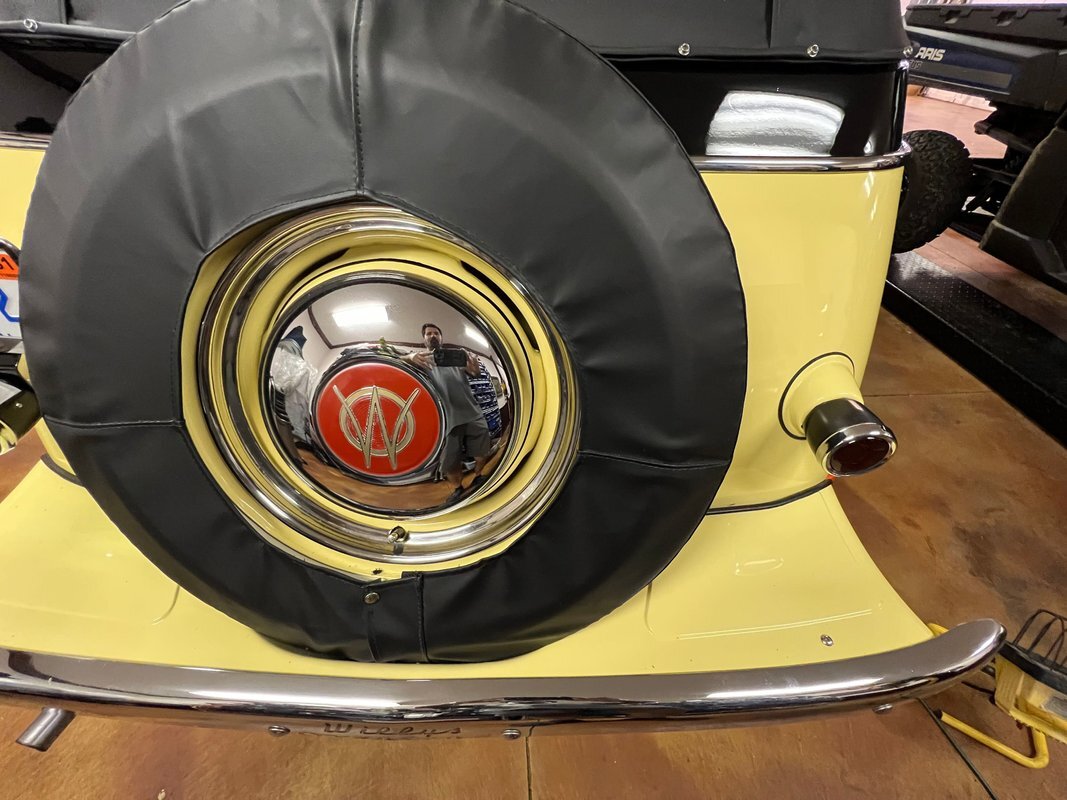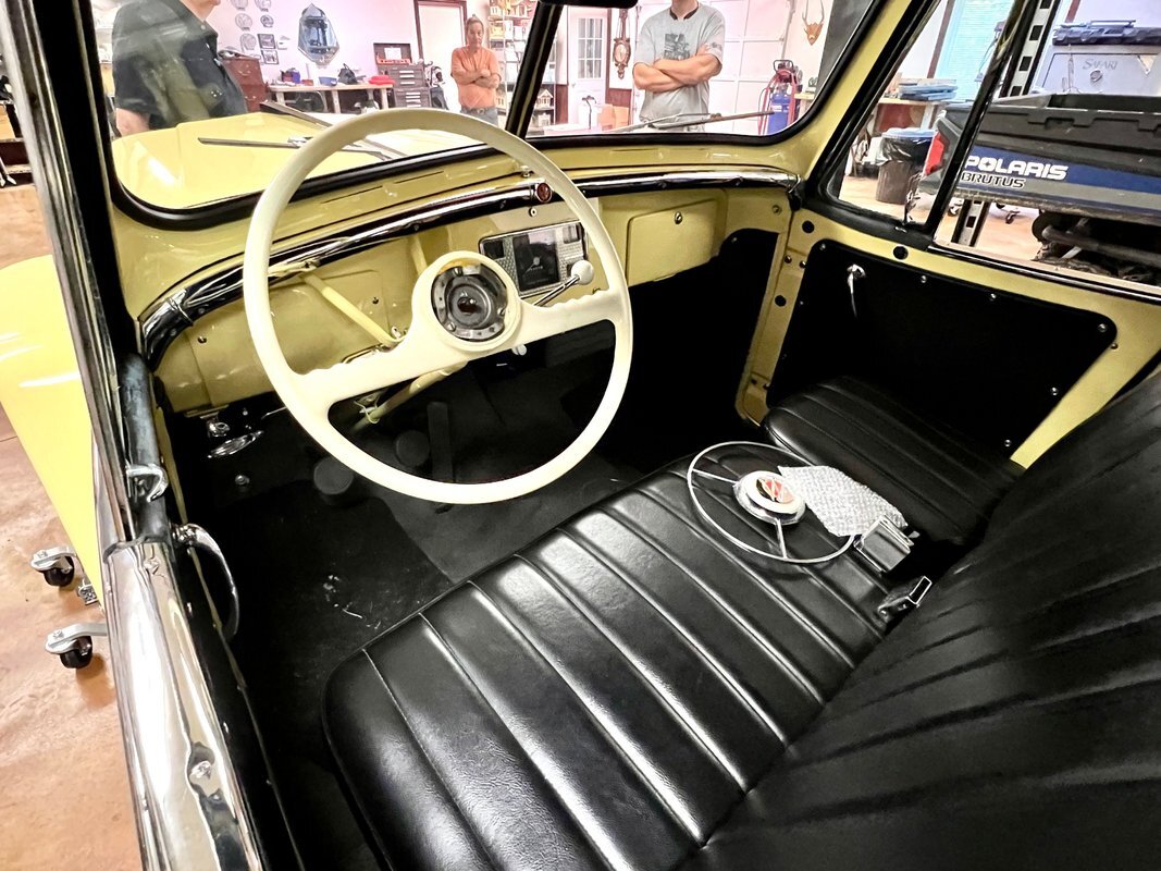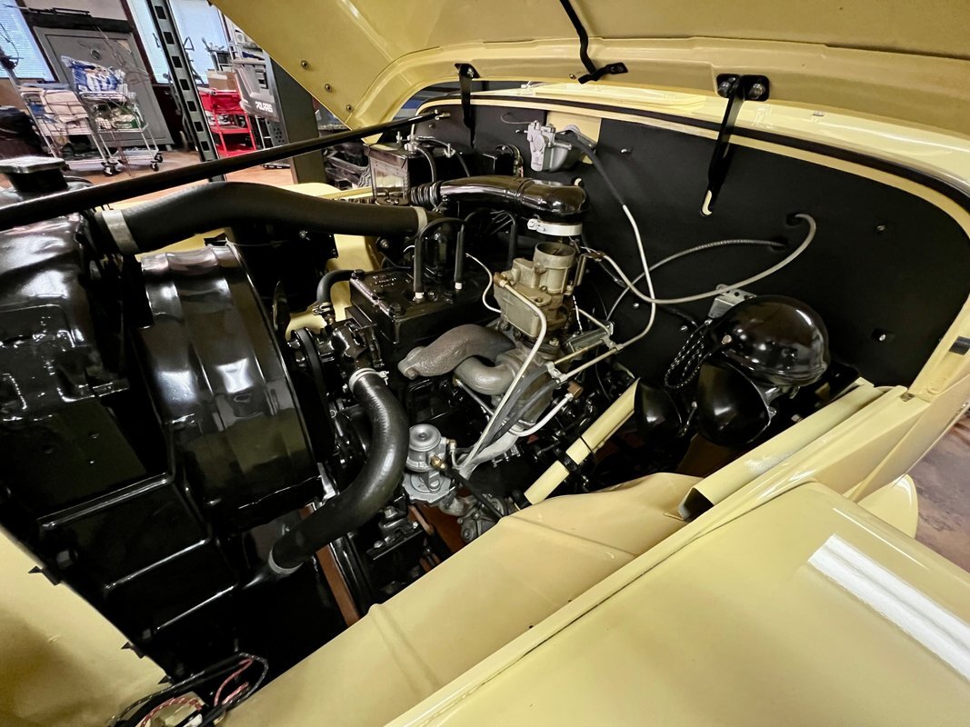 The steel wheels have been painted to match the body and wear Willys-Overland dog dish hubcaps as well as Coker whitewall tires. A continental kit spare mounted at the rear. The selling dealer notes that stainless steel brake lines were installed during the refurbishment.