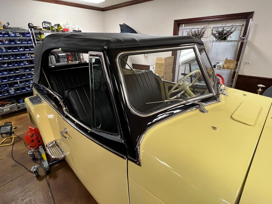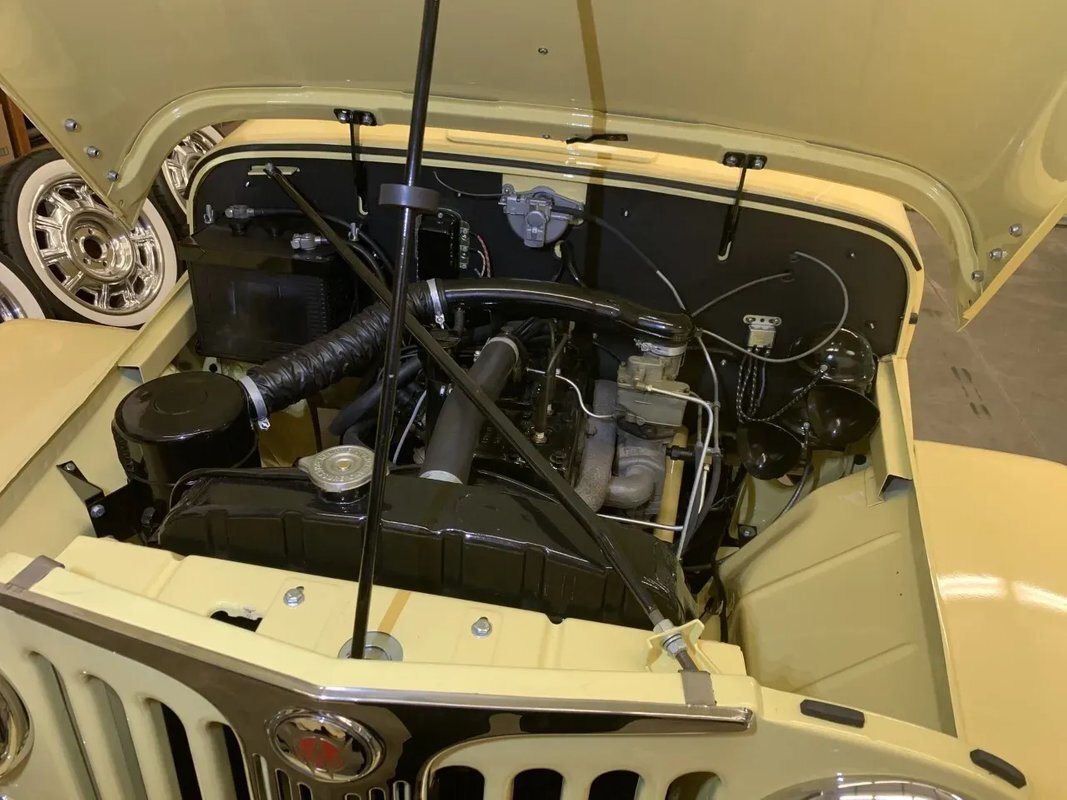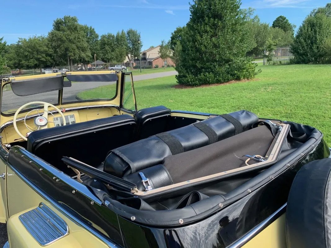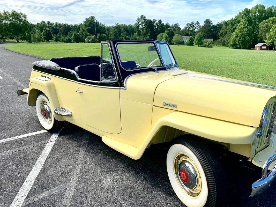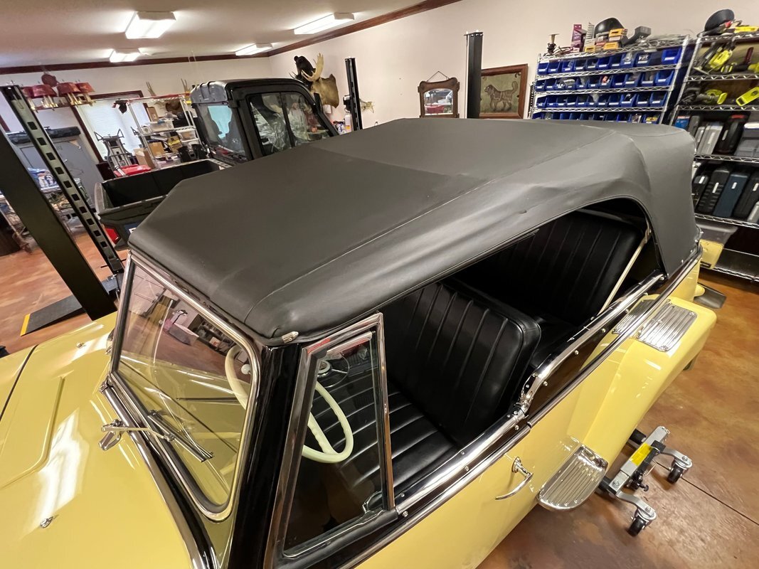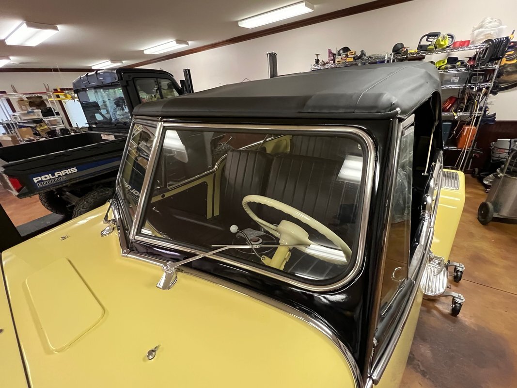he Jeepster was designed by Brooks Stevens as a style-forward bridge between utilitarian Civilian Jeeps and conventional cars. The body on this example was removed from the frame and refinished in yellow with a black upper section. Equipment includes chrome bumpers, steps to access the rear compartment, a split windshield, and a replacement black vinyl top that can be seen both raised and lowered. The selling dealer reports that the brightwork was rechromed, polished, or replaced as needed. A top boot is included in the sale.