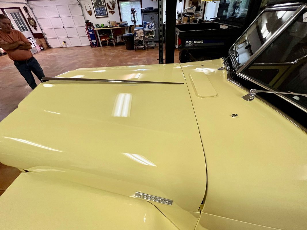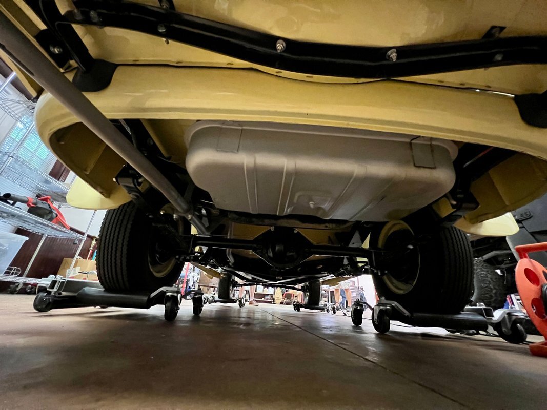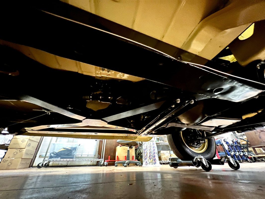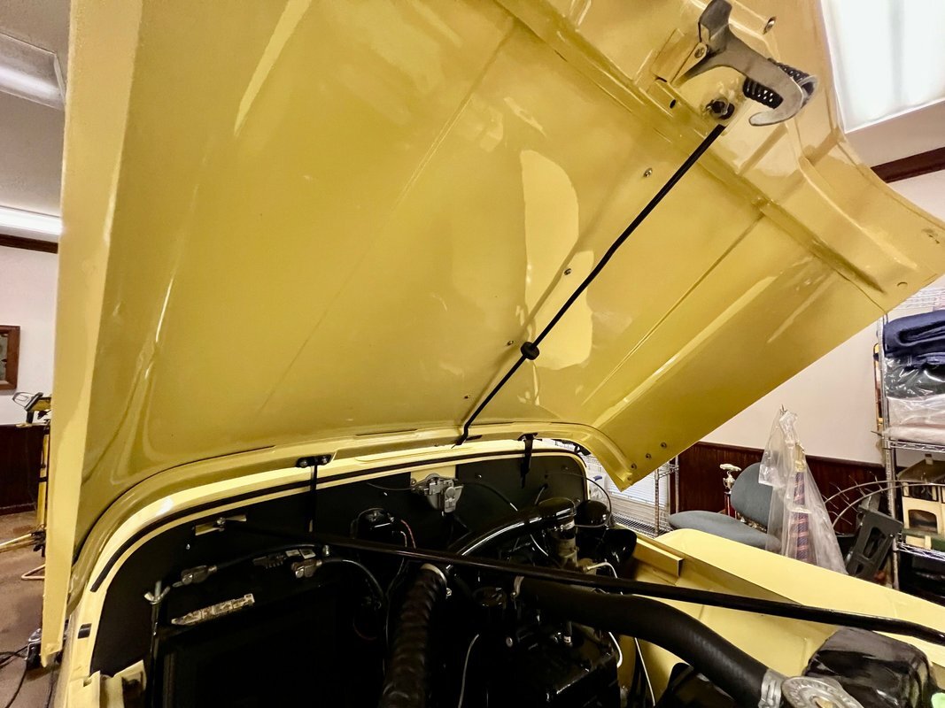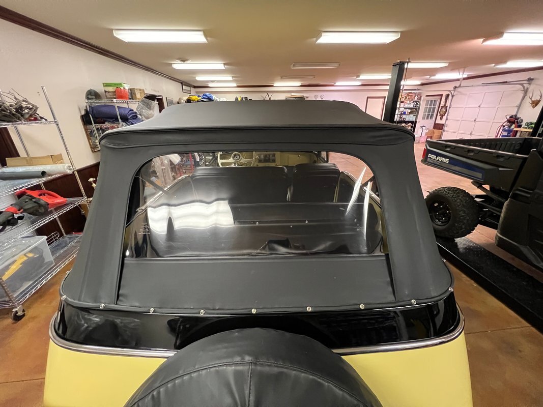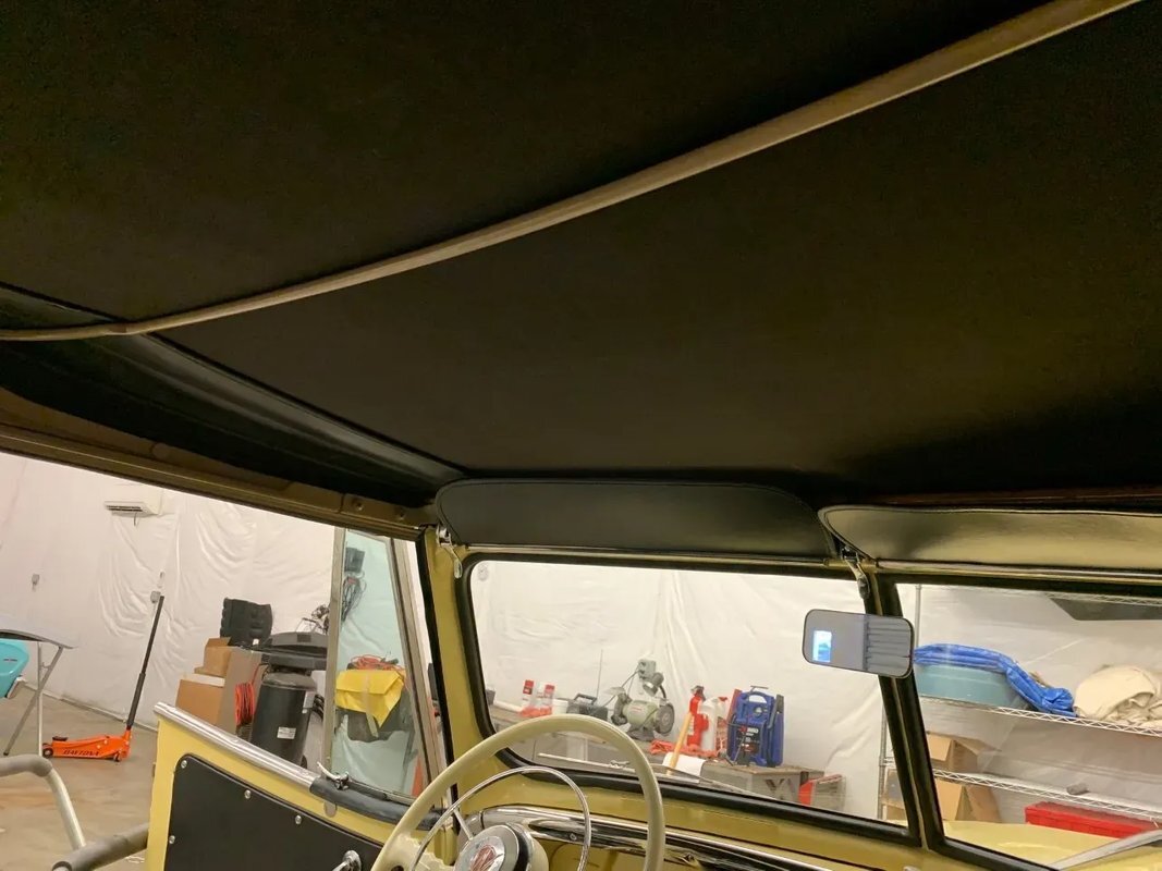 he Jeepster was designed by Brooks Stevens as a style-forward bridge between utilitarian Civilian Jeeps and conventional cars. The body on this example was removed from the frame and refinished in yellow with a black upper section. Equipment includes chrome bumpers, steps to access the rear compartment, a split windshield, and a replacement black vinyl top that can be seen both raised and lowered. The selling dealer reports that the brightwork was rechromed, polished, or replaced as needed. A top boot is included in the sale.